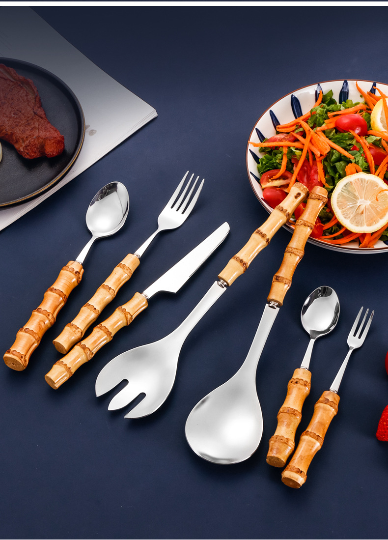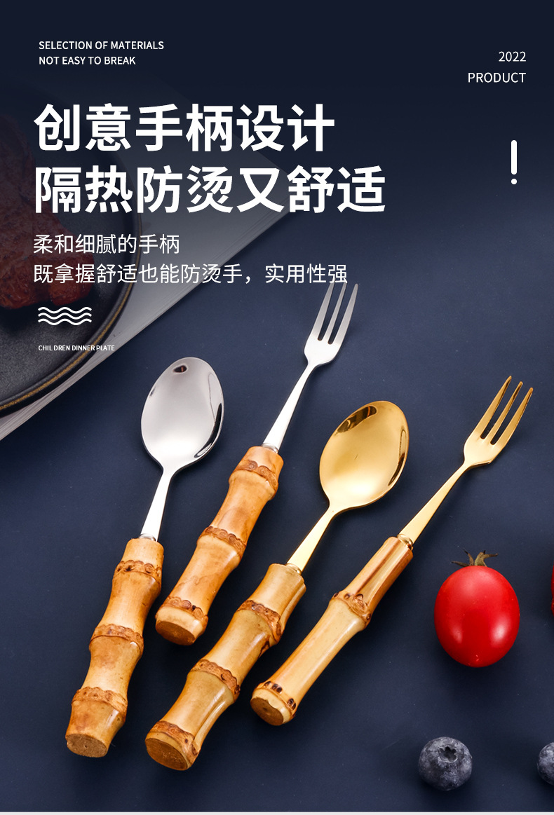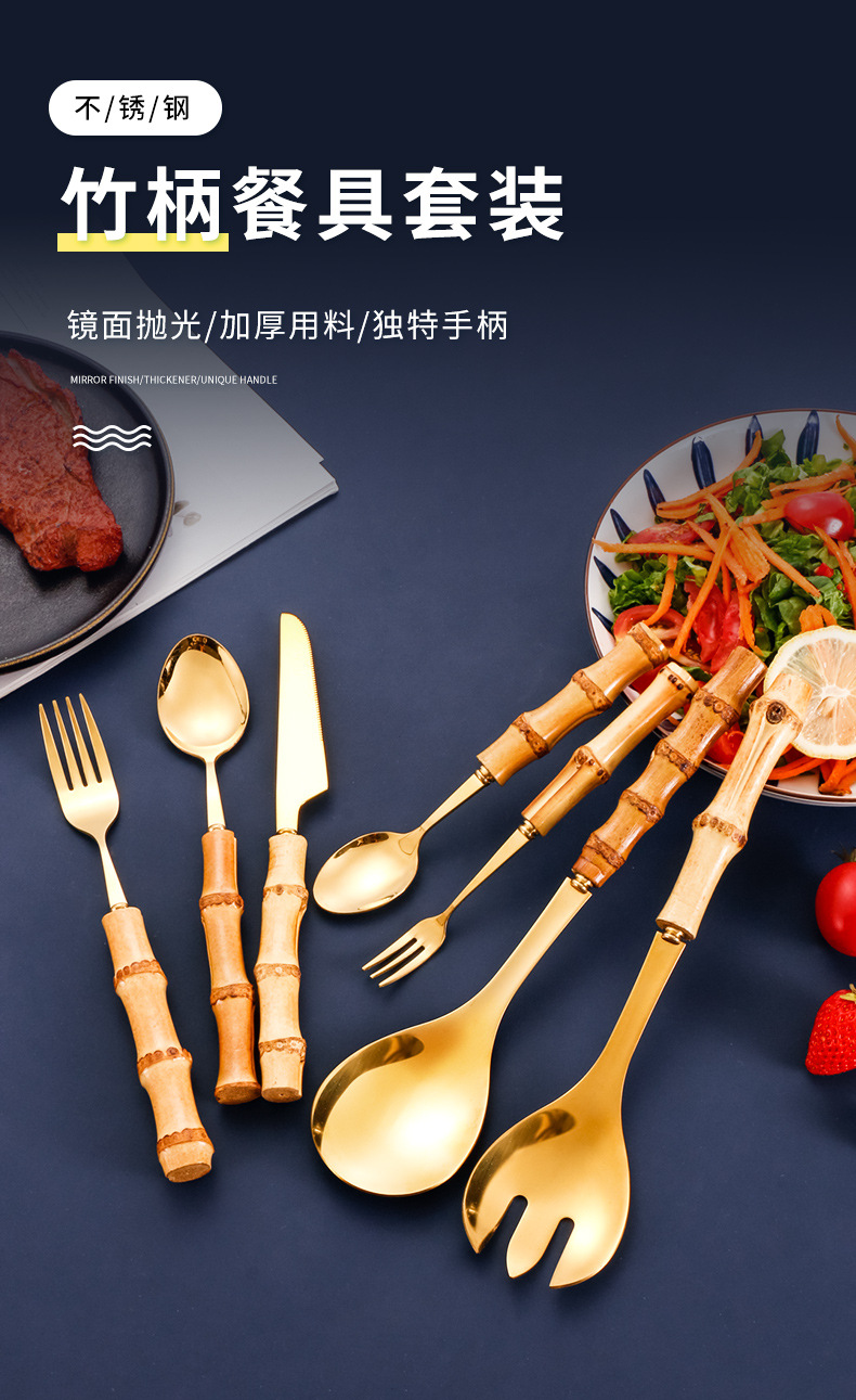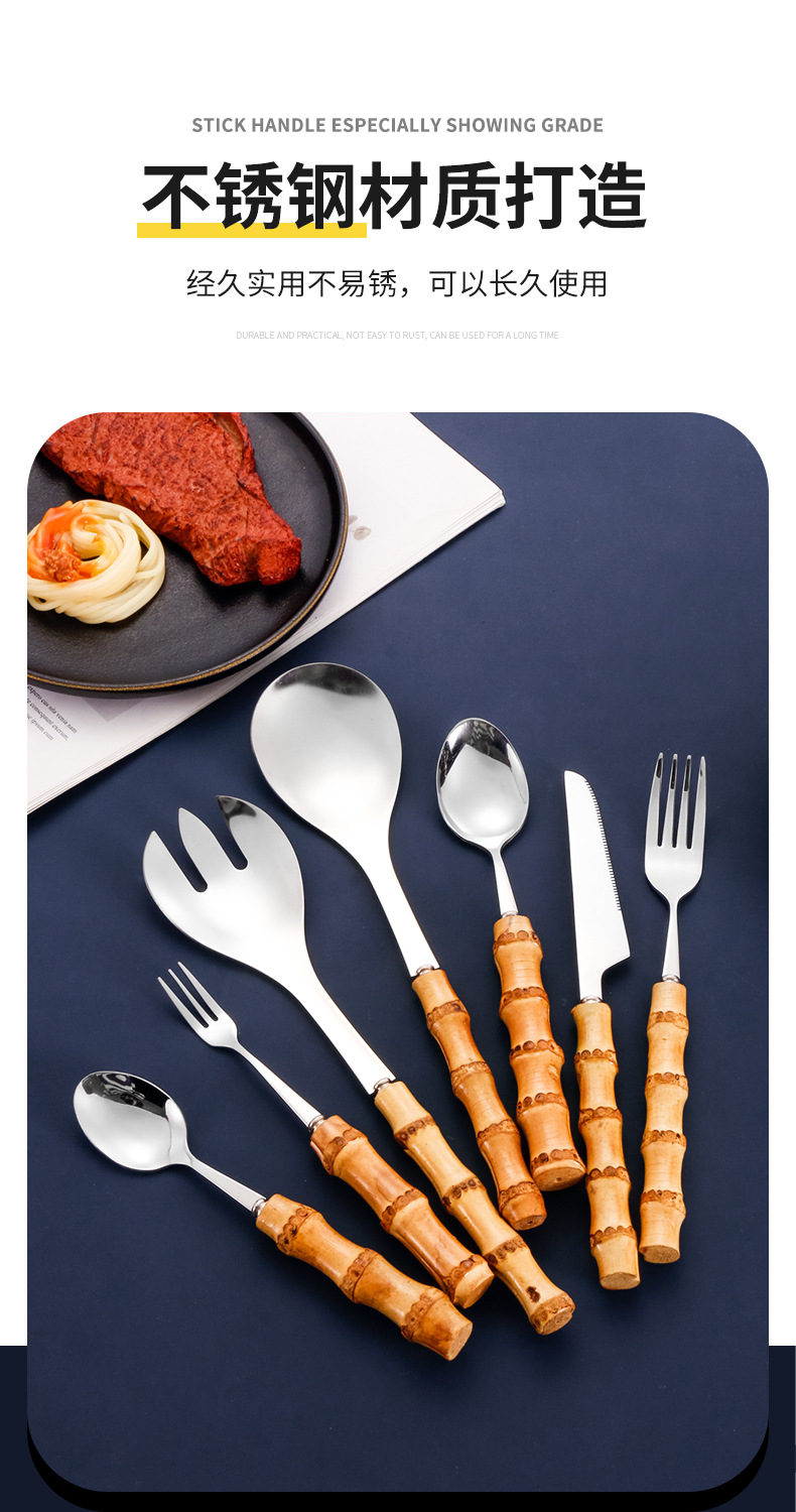 天然竹柄不锈钢餐具甜品沙拉勺叉茶勺竹节手柄西餐牛排刀叉勺套装