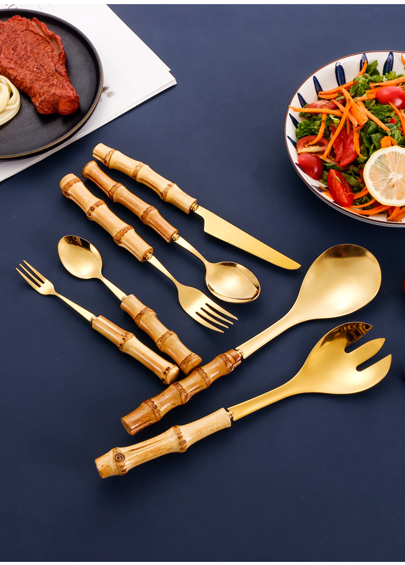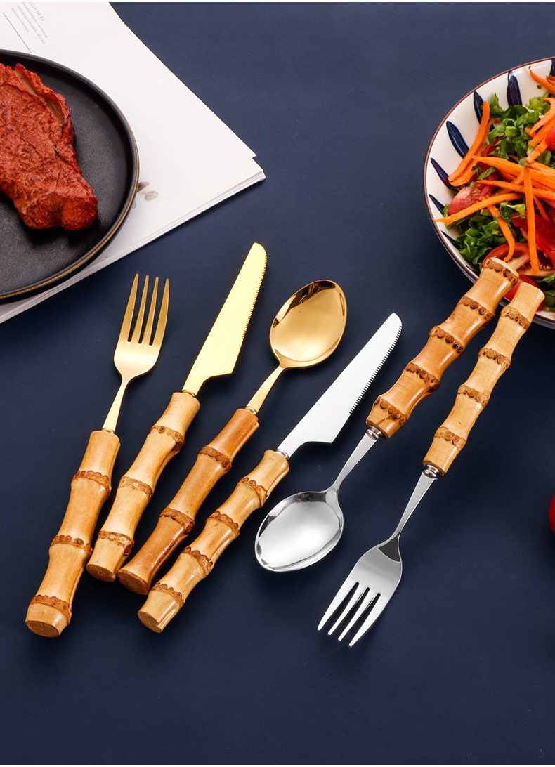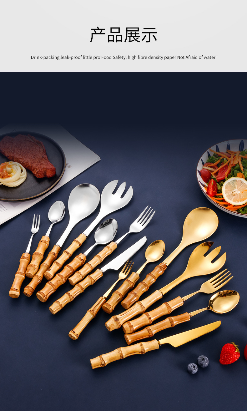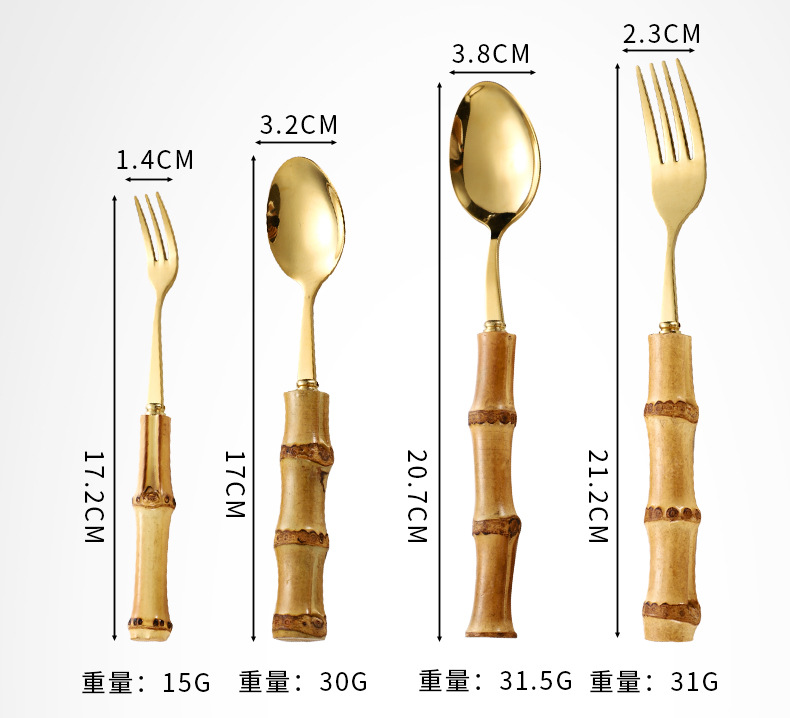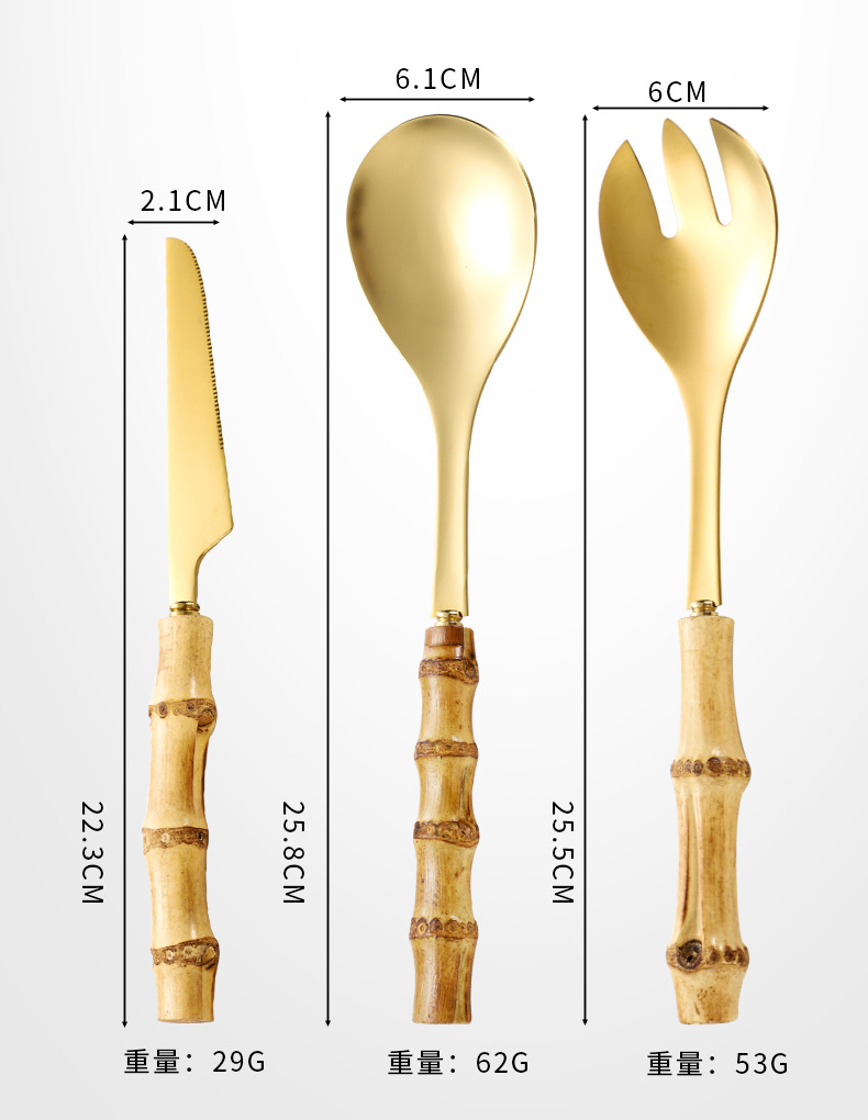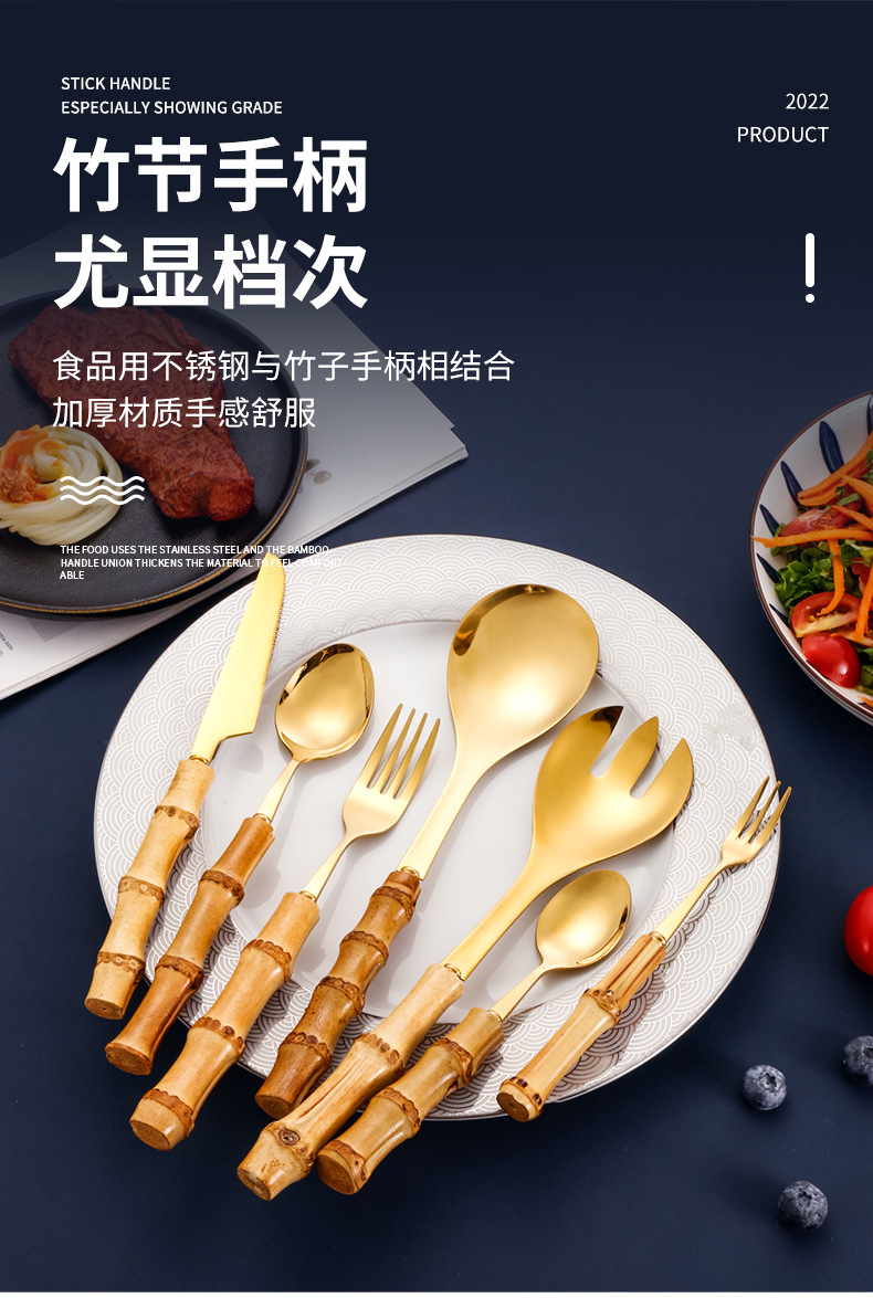 天然竹柄不锈钢餐具甜品沙拉勺叉茶勺竹节手柄西餐牛排刀叉勺套装