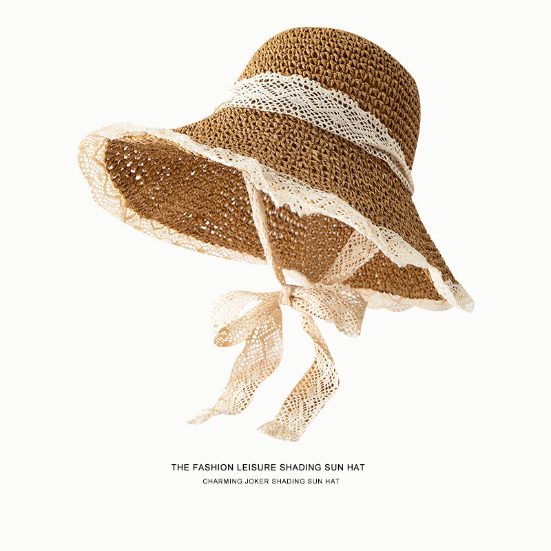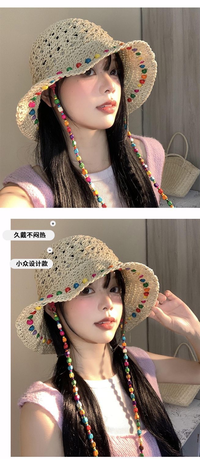 新款泫雅风彩珠渔夫帽夏季海边草帽女大帽檐遮阳防晒帽可折叠帽子