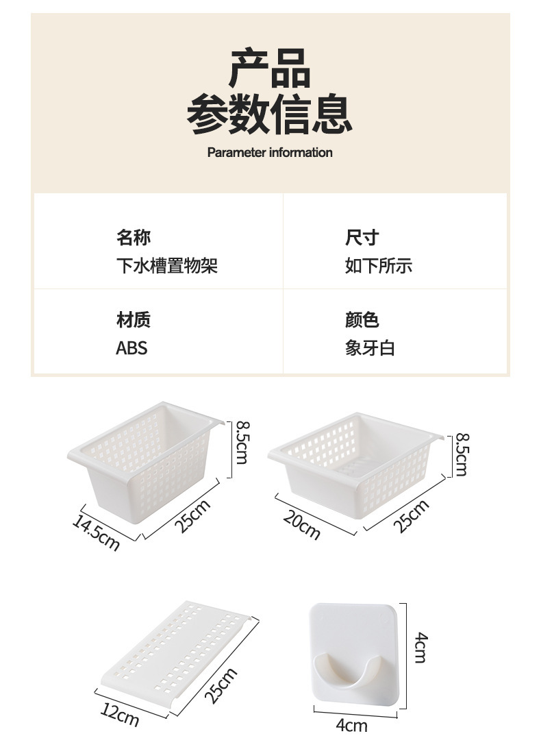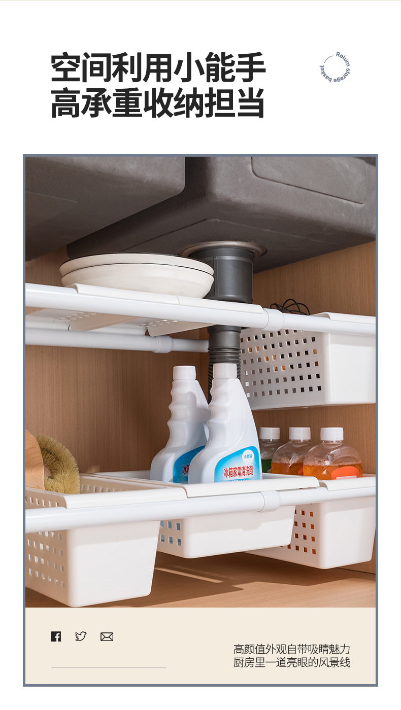 日式水槽下免打孔伸缩杆收纳架厨房挂杆调料置物架橱柜塑料收纳篮
