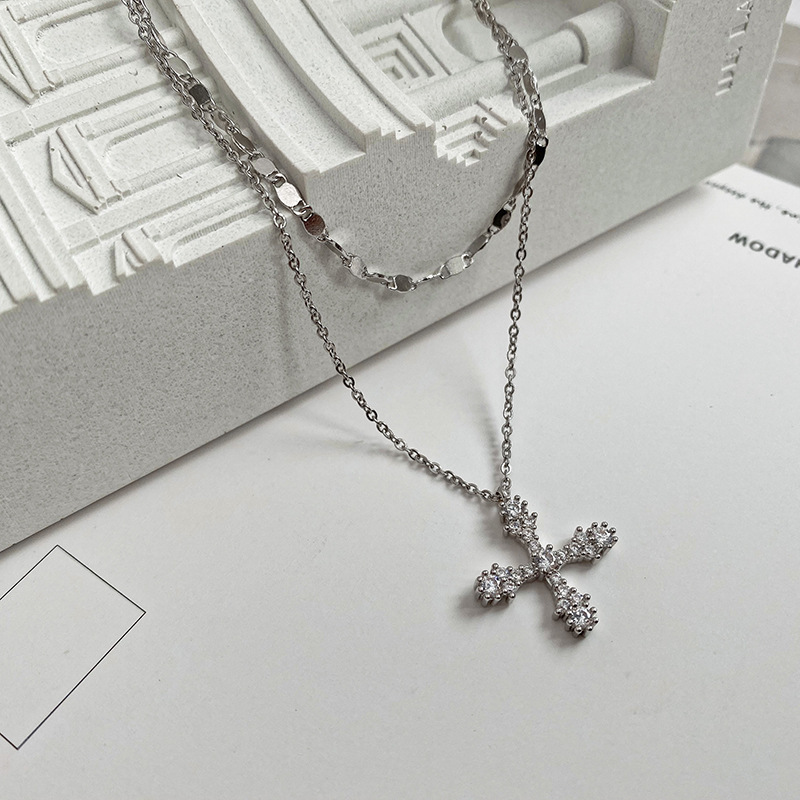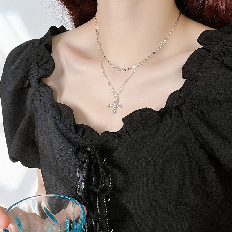 韩国百搭设计满钻双层十字架钛钢项链女生轻奢小众网红气质锁骨链