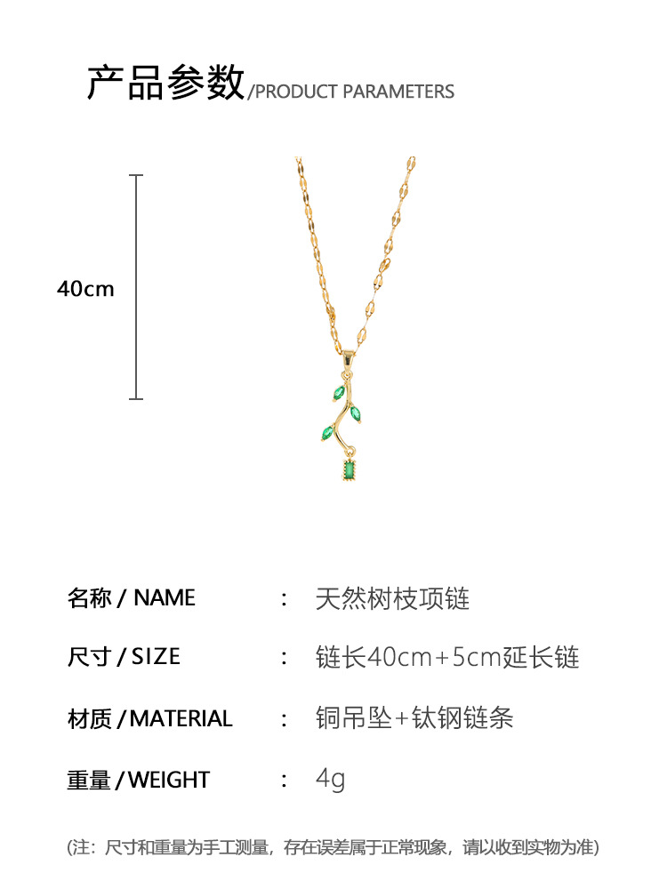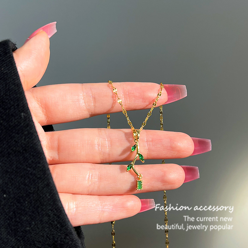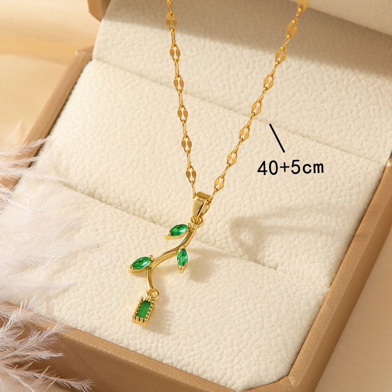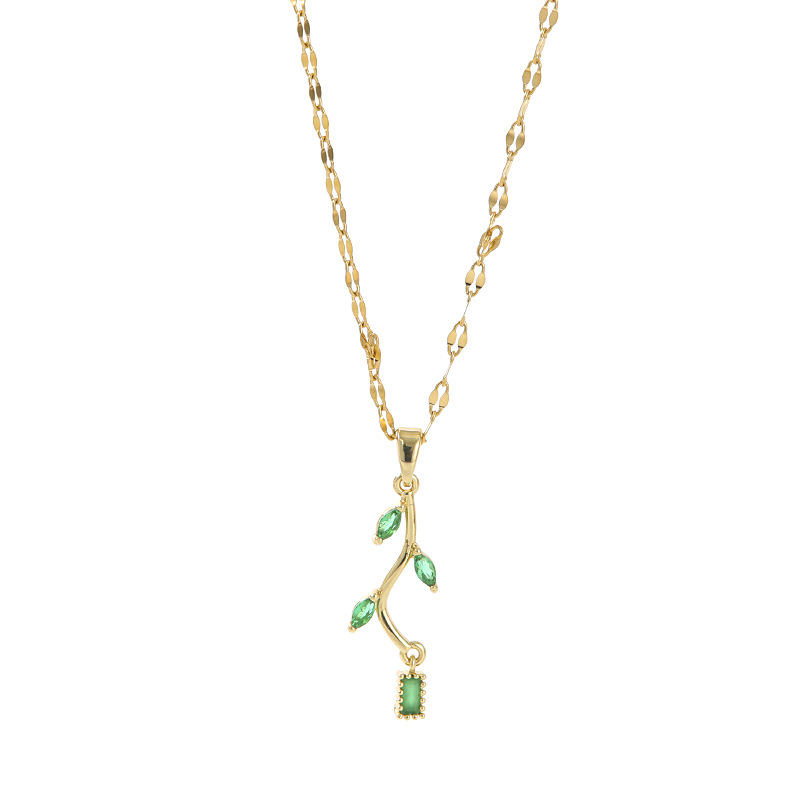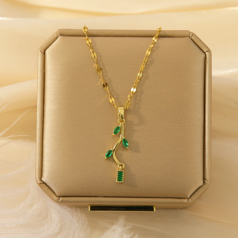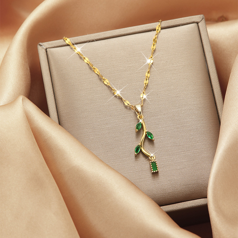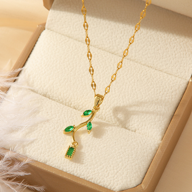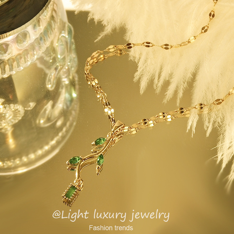 祖母绿天然树枝项链女不掉色轻奢高级感气质华丽钛钢锁骨链配饰品