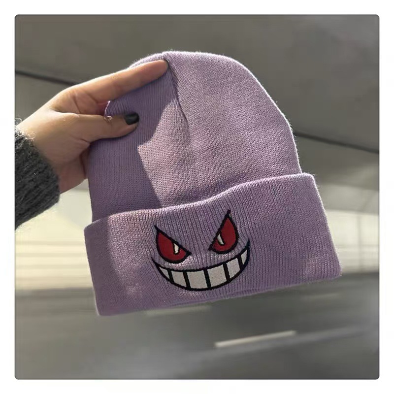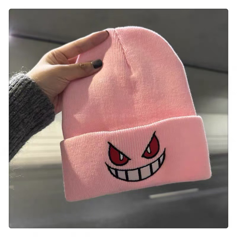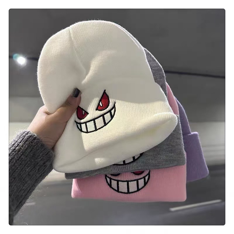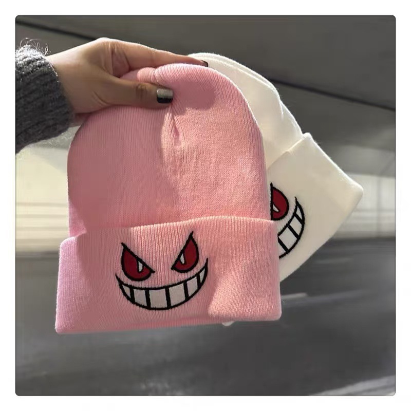 跨境代发卡通大嘴巴红眼睛包头帽秋冬新款刺绣毛线针织帽套头保暖