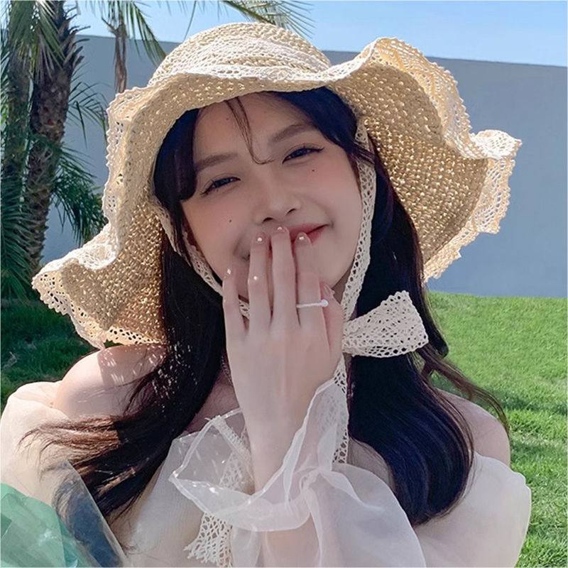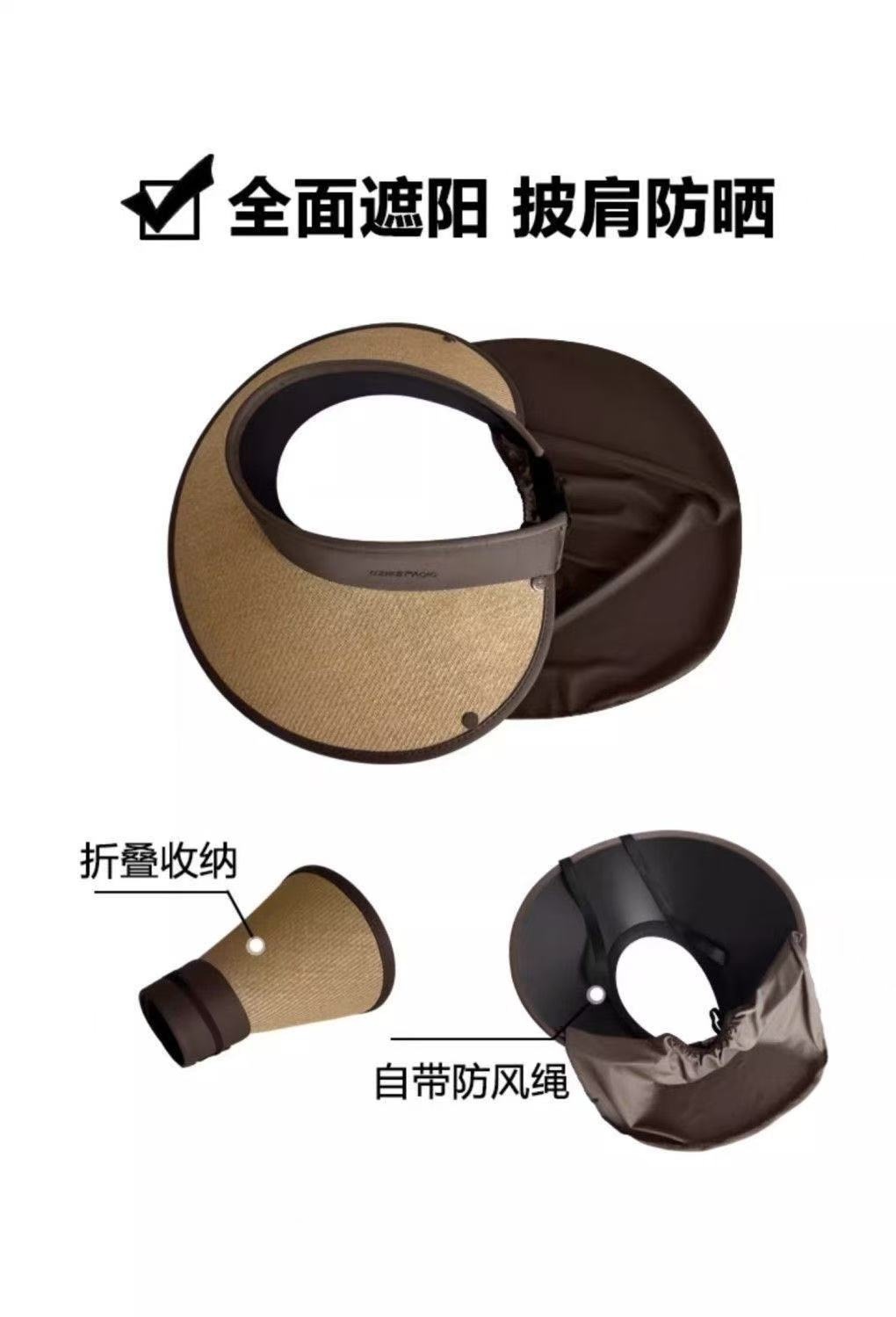 骑车空顶遮阳帽女草编黑胶帽披肩可折叠大檐防晒帽防紫外线太阳帽
