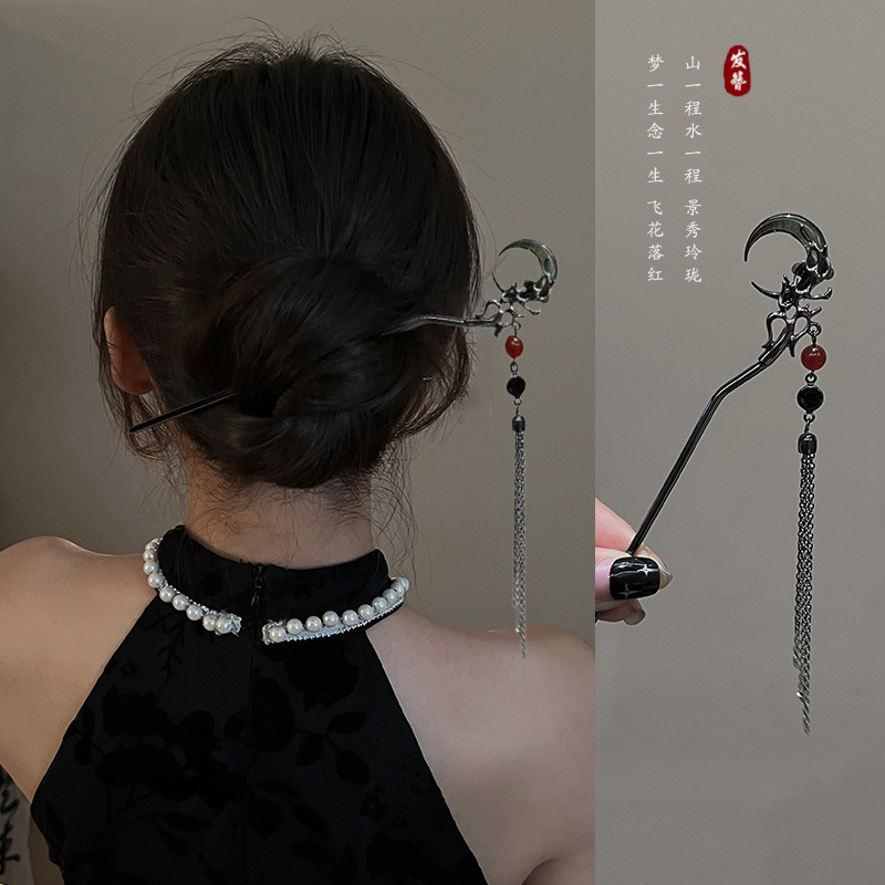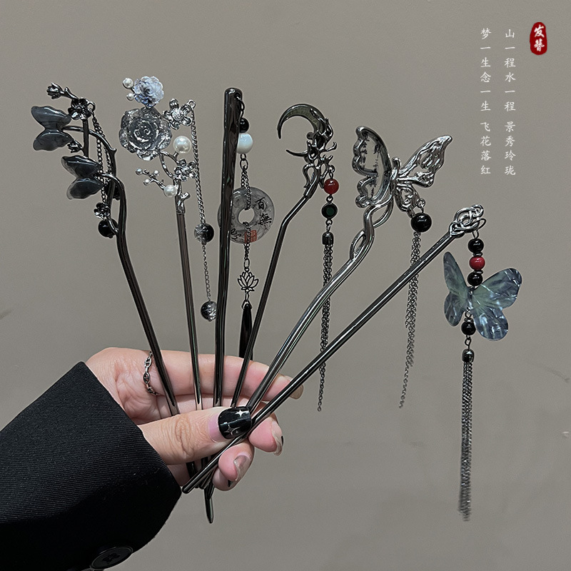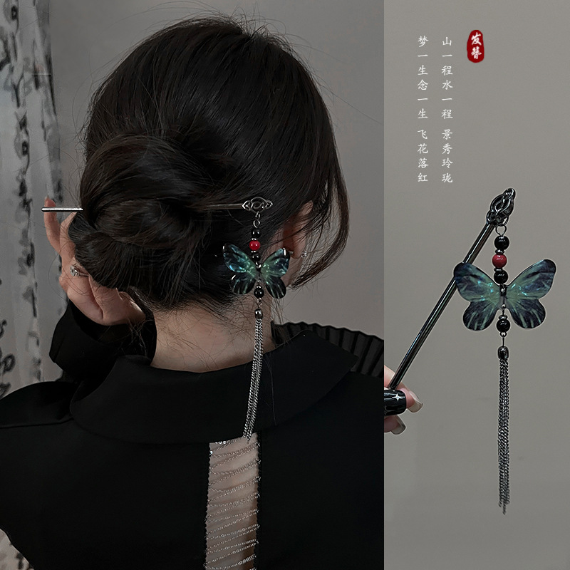 新中式发簪旗袍马面裙女古风流苏簪子黑檀头饰蝴蝶发钗盘发步摇发