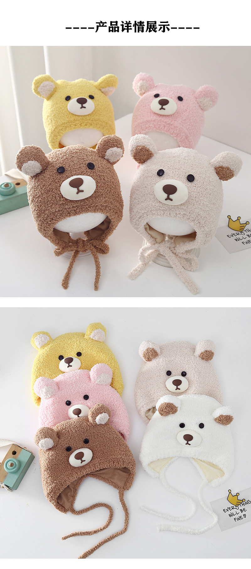 婴儿毛绒帽秋冬季儿童卡通小熊造型护耳帽男女宝宝加厚保暖套头帽