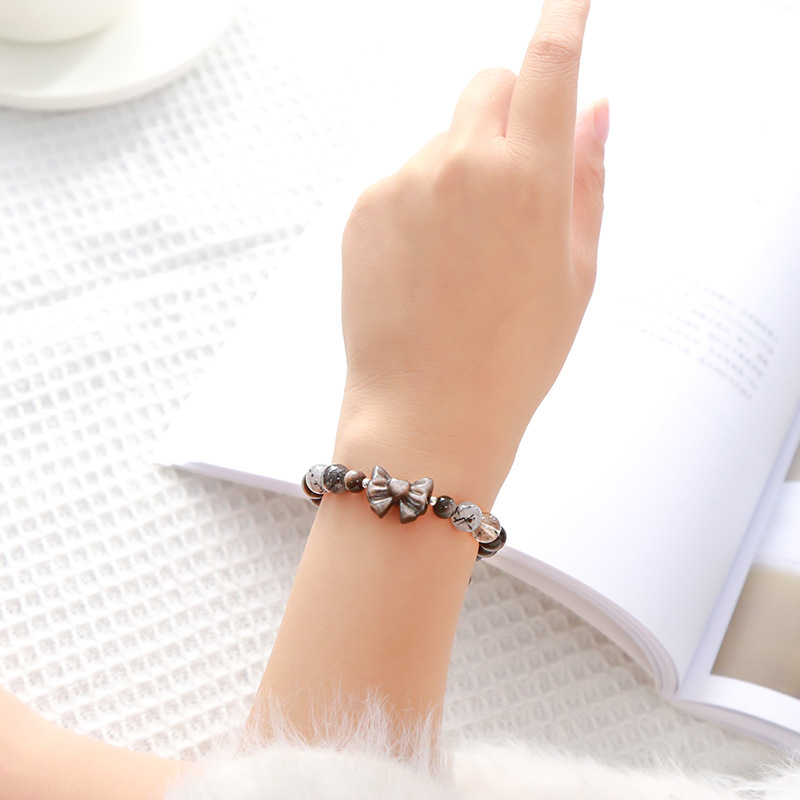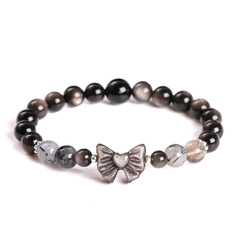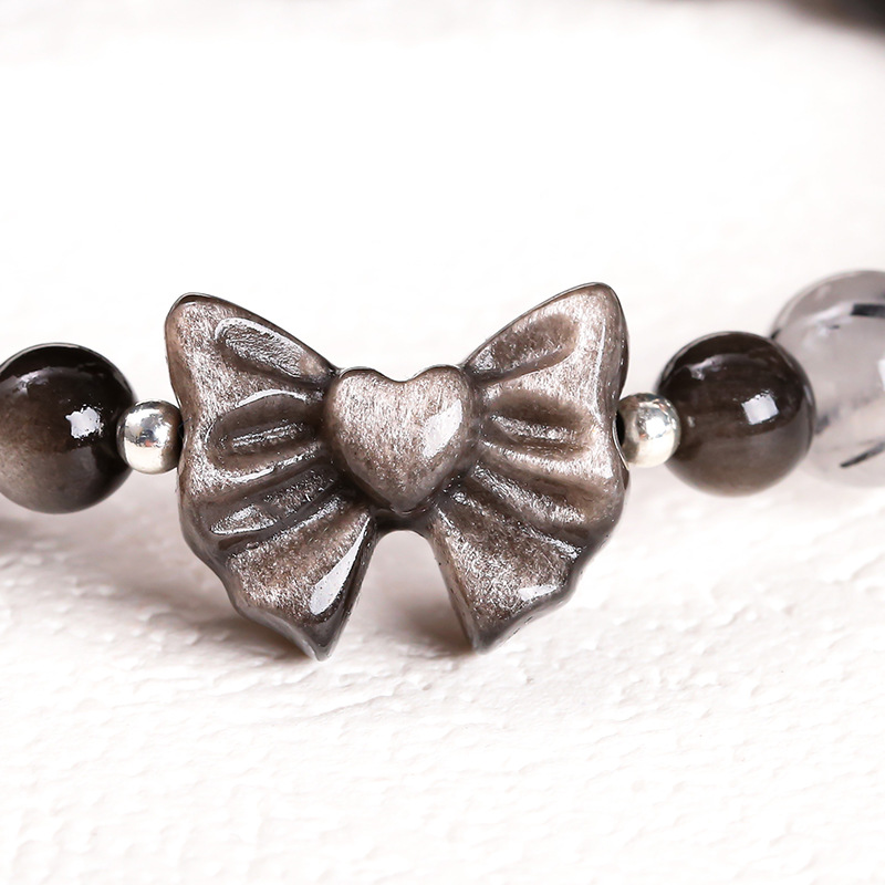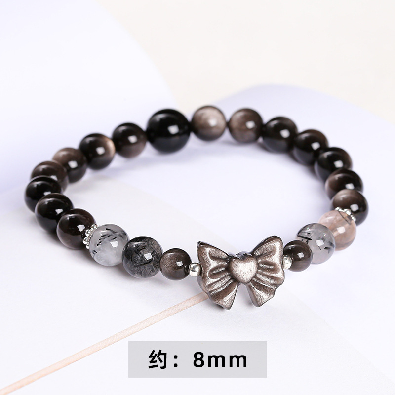 晶州珠宝 天然银曜石蝴蝶结手链时尚高级感小众女生圆珠手饰批发
