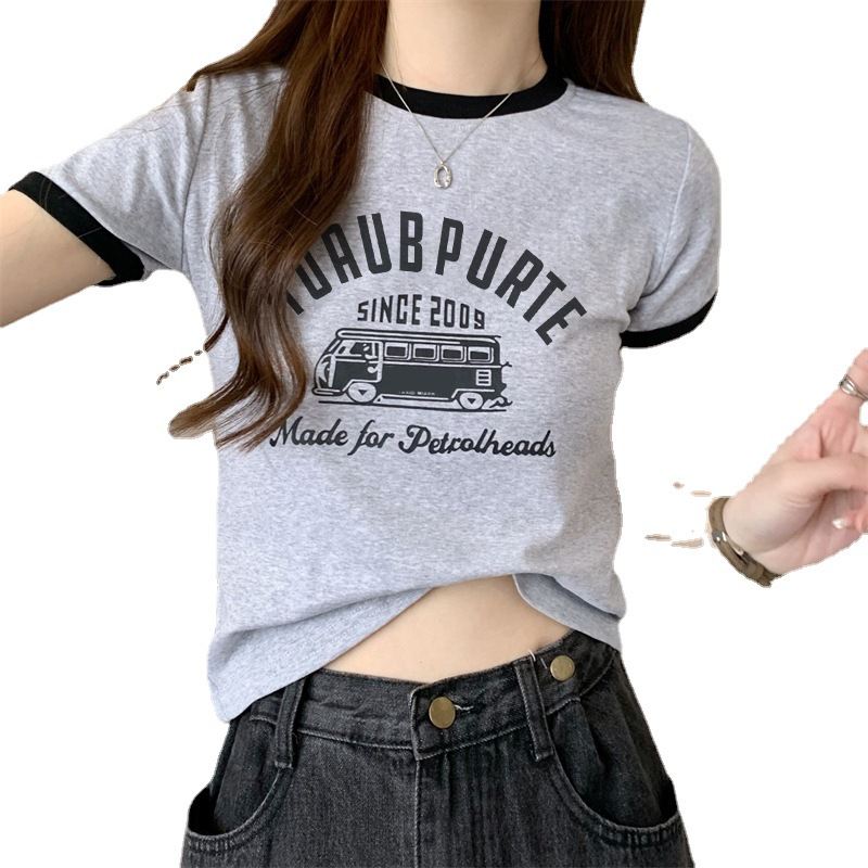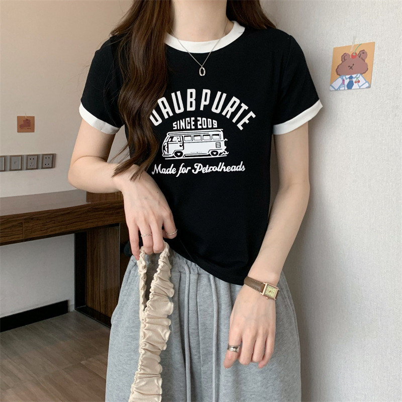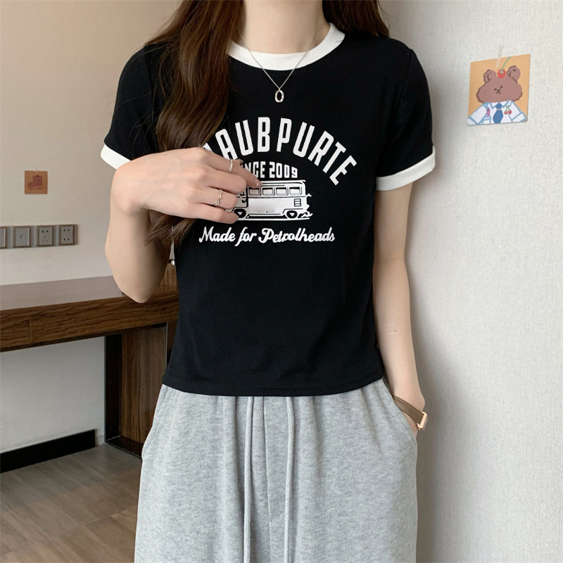2024夏季新款甜辣妹撞色圆领短款上衣服设计感显瘦学生短袖T恤女
