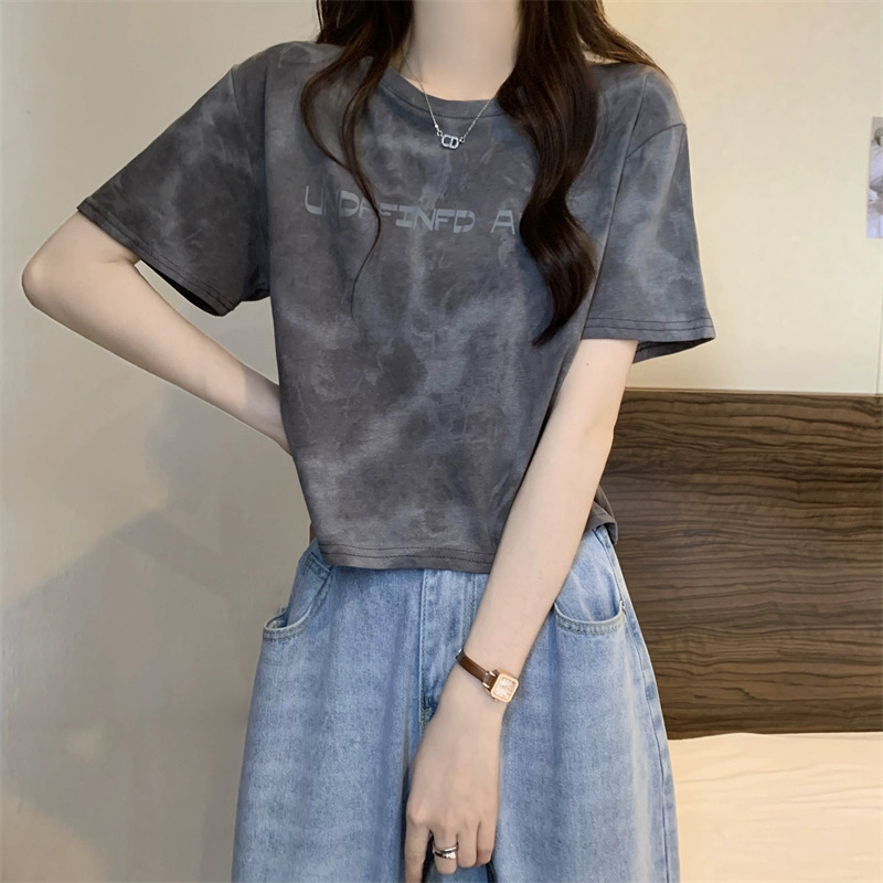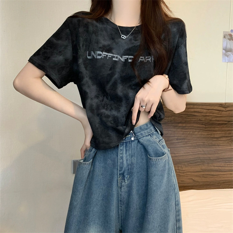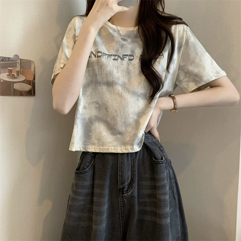 美式复古扎染短袖字母印花宽松女t恤2025夏季设计感短款学生上衣
