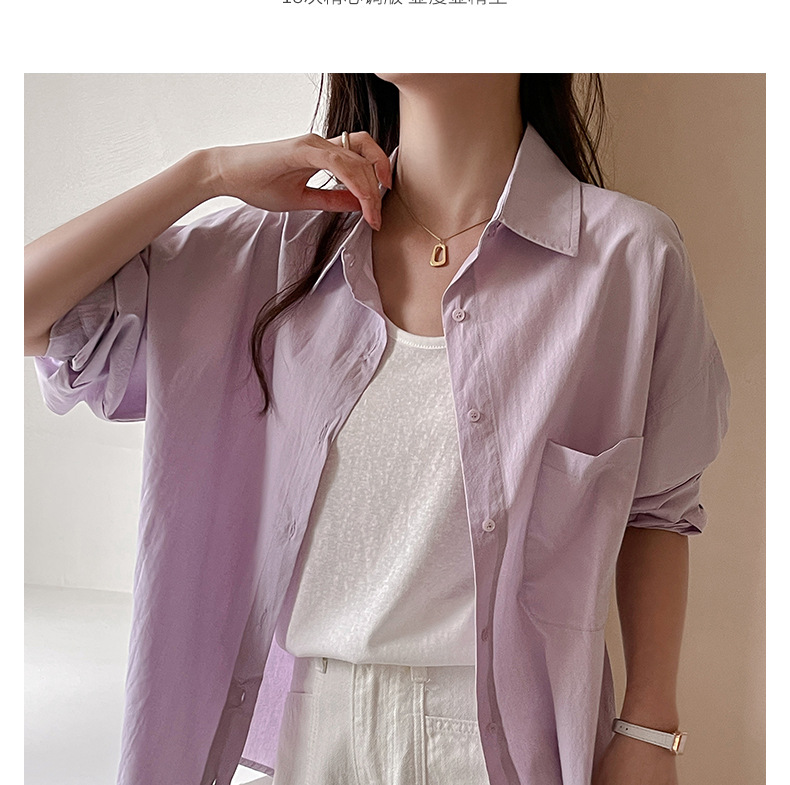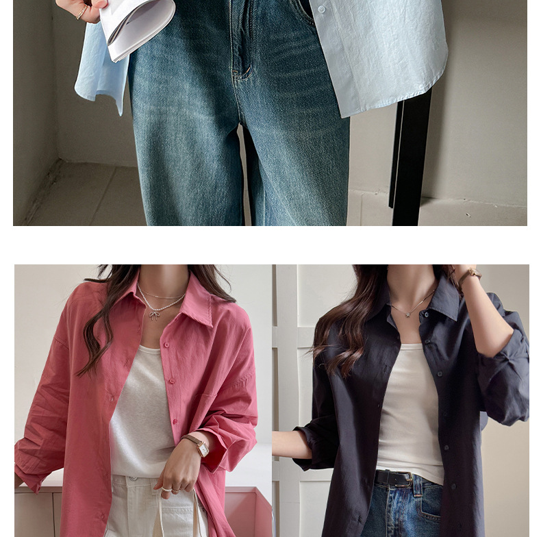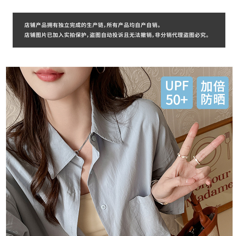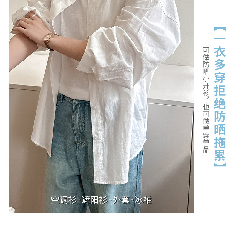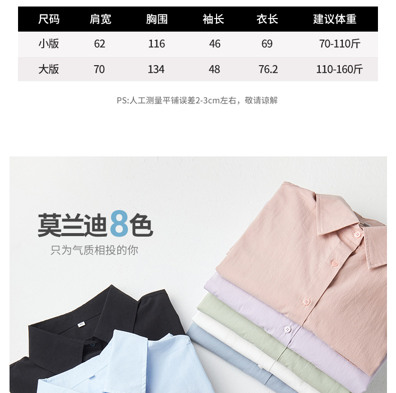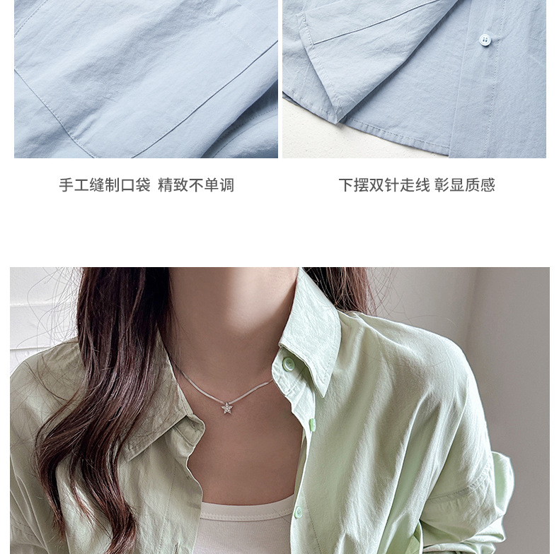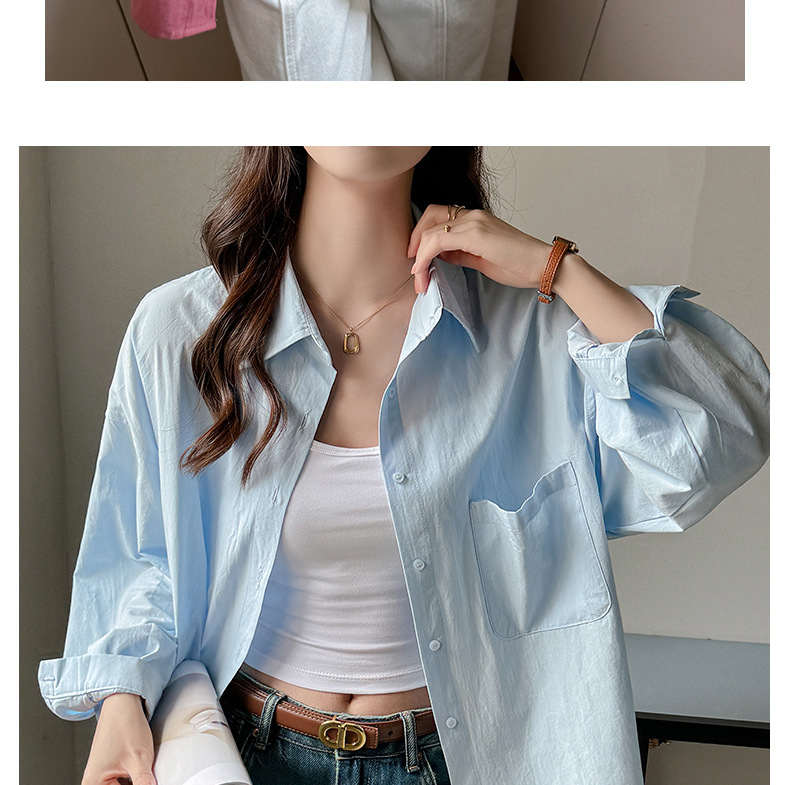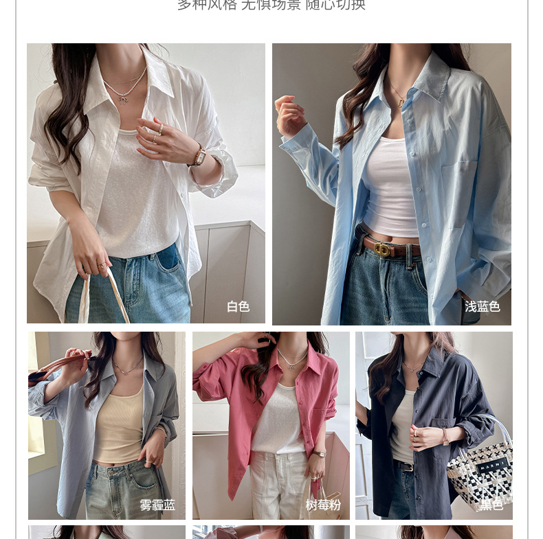 防晒100%砂洗纯棉长袖女式夏季衬衫蓝色高级感上衣薄外套宽松开衫
