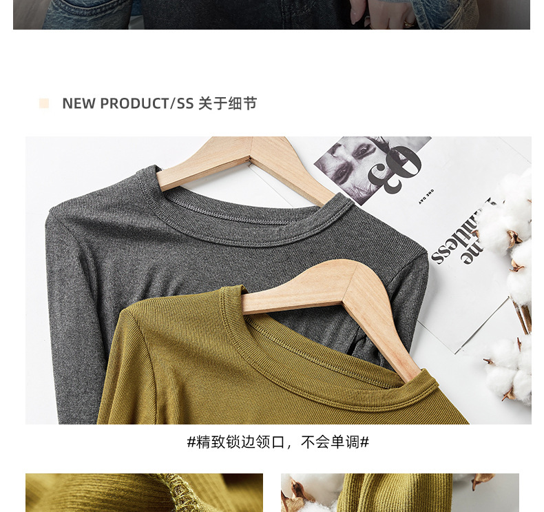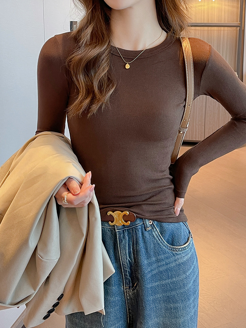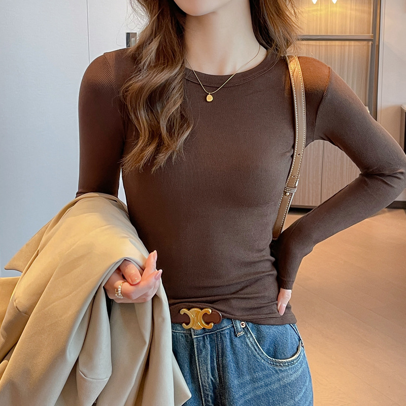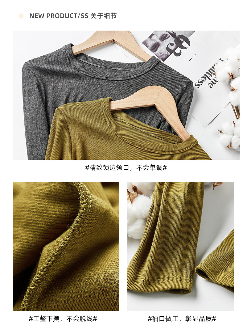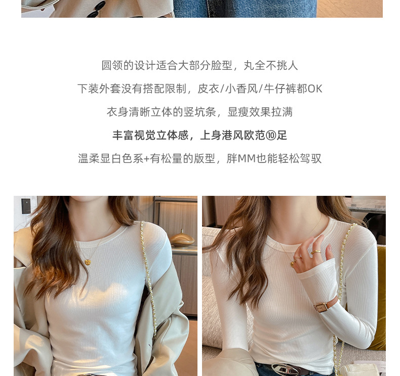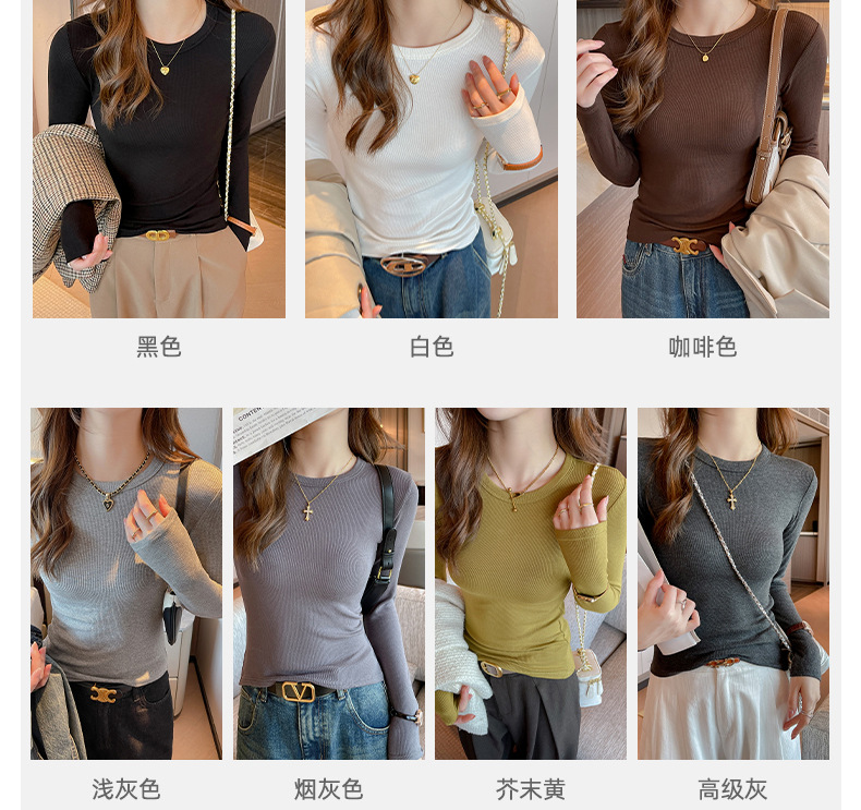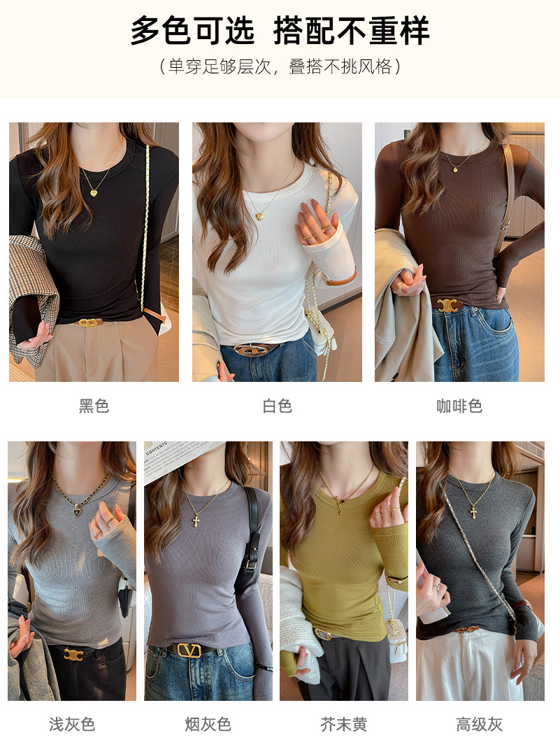 纯色小圆领修身显瘦长袖内搭打底衫女士可外穿高级感螺纹长袖t恤