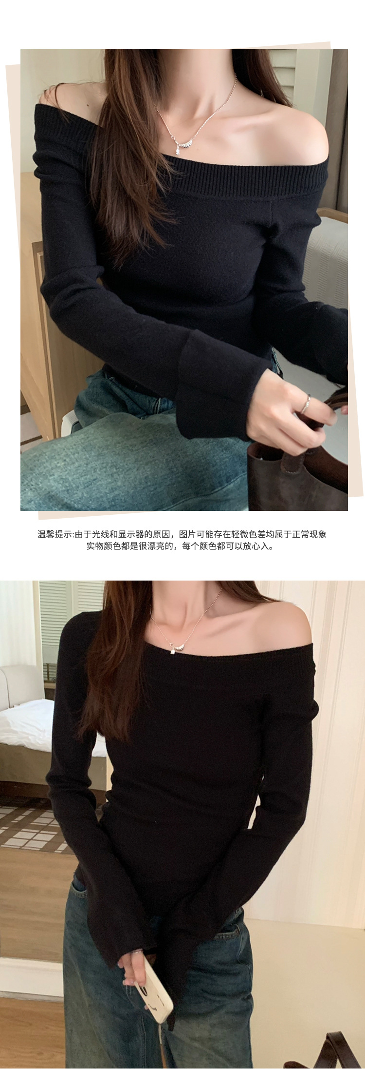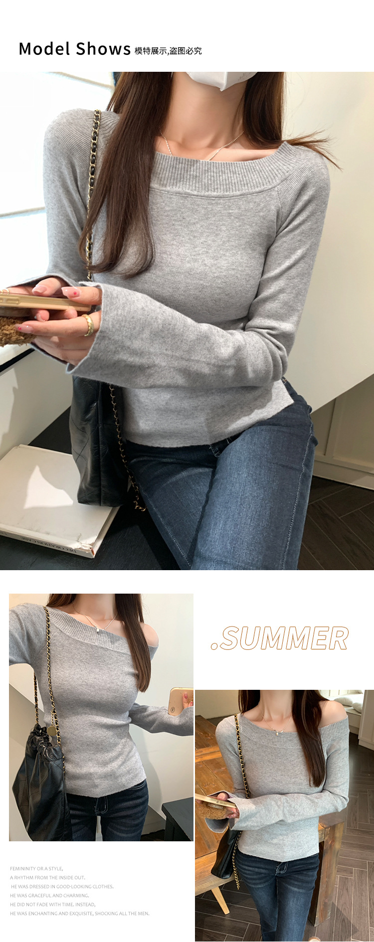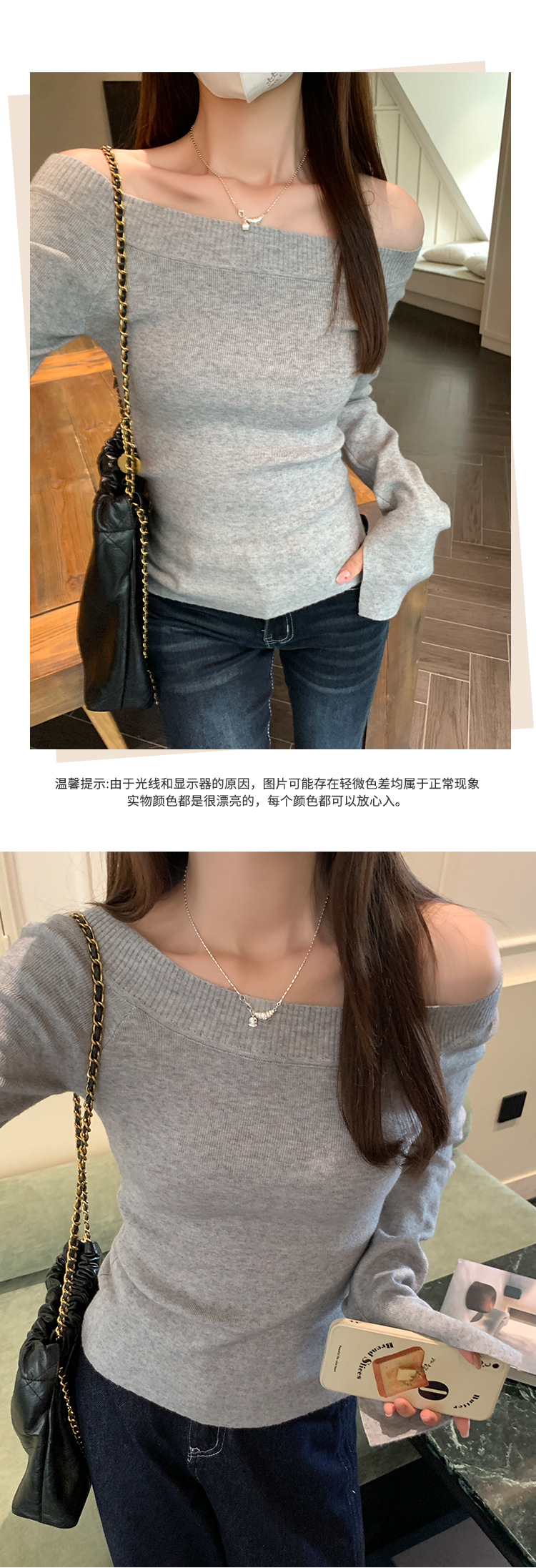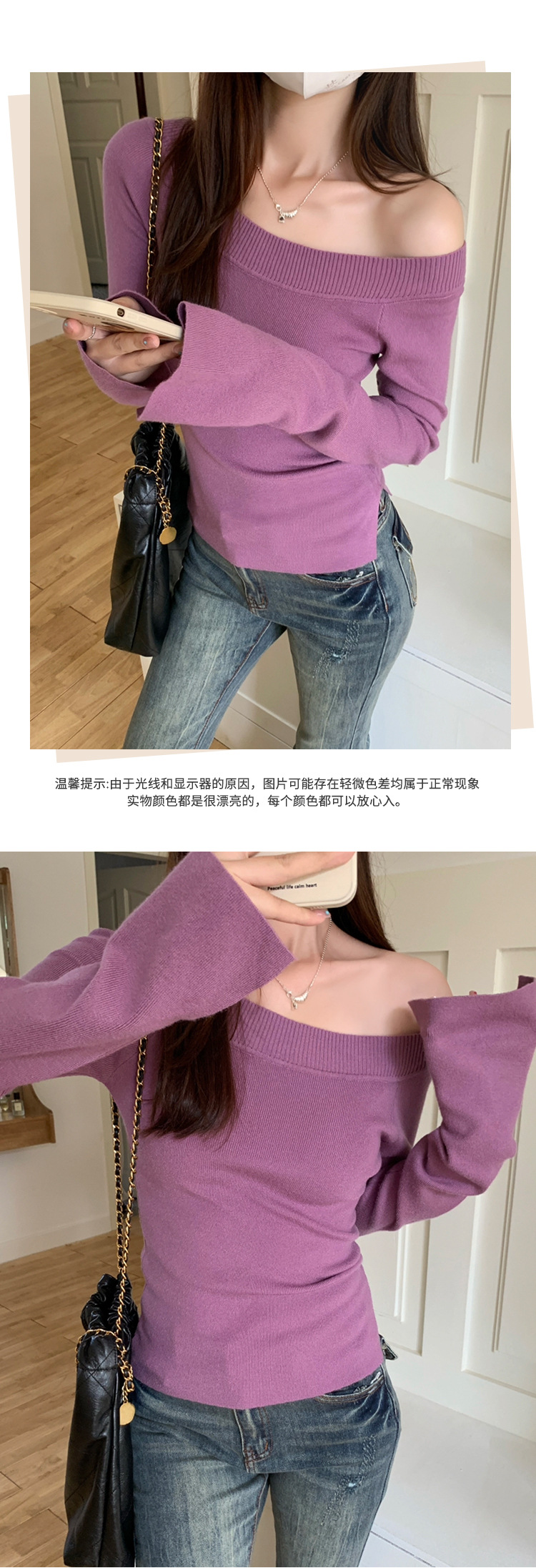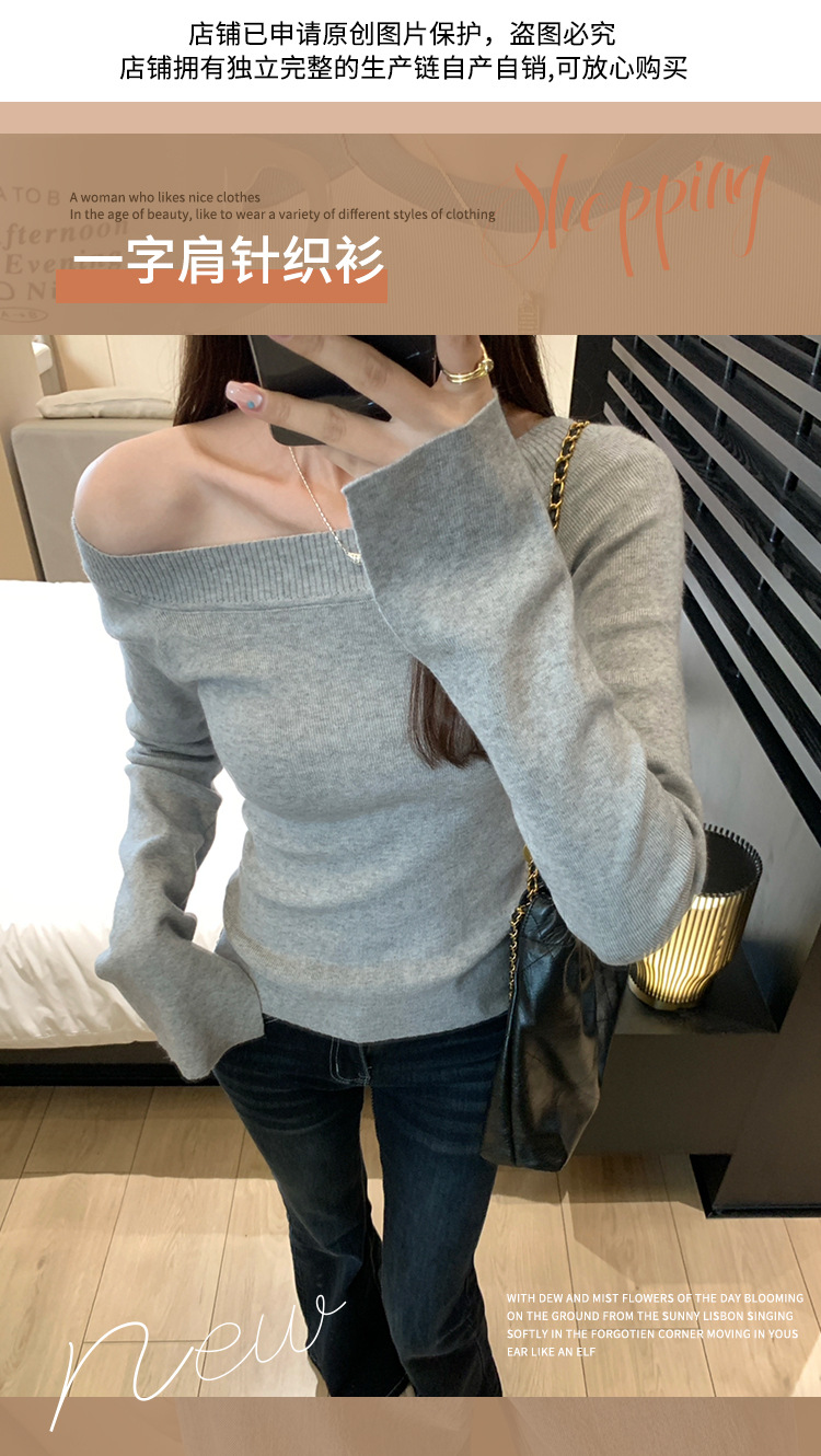 花灰纯欲斜肩针织打底衫女秋软糯露肩喇叭袖毛衣修身显瘦内搭上衣