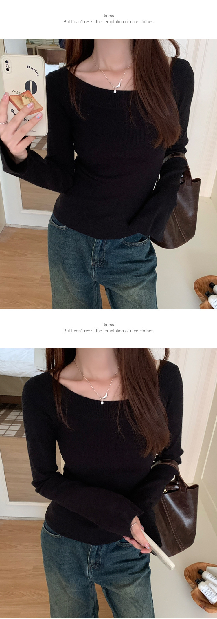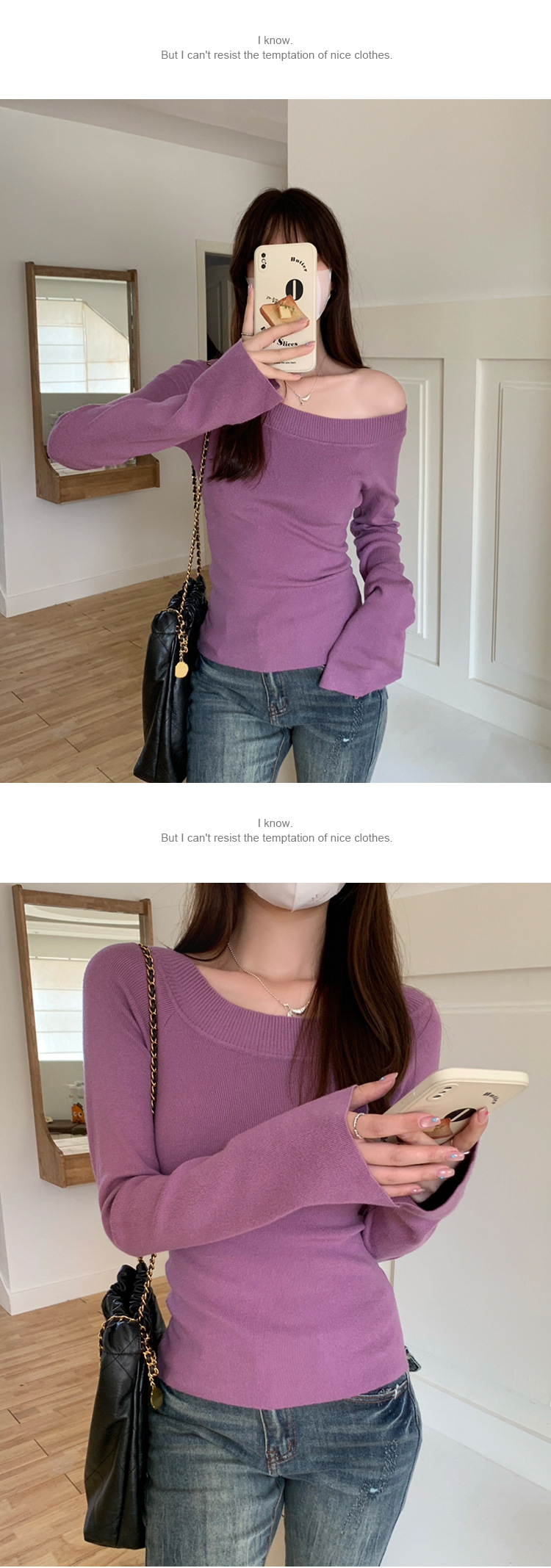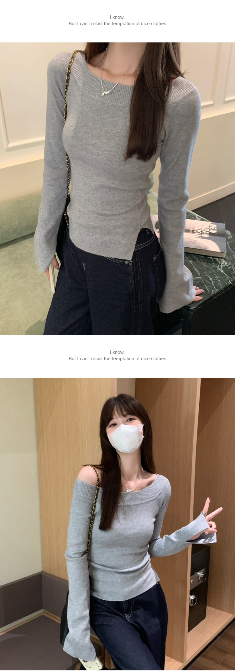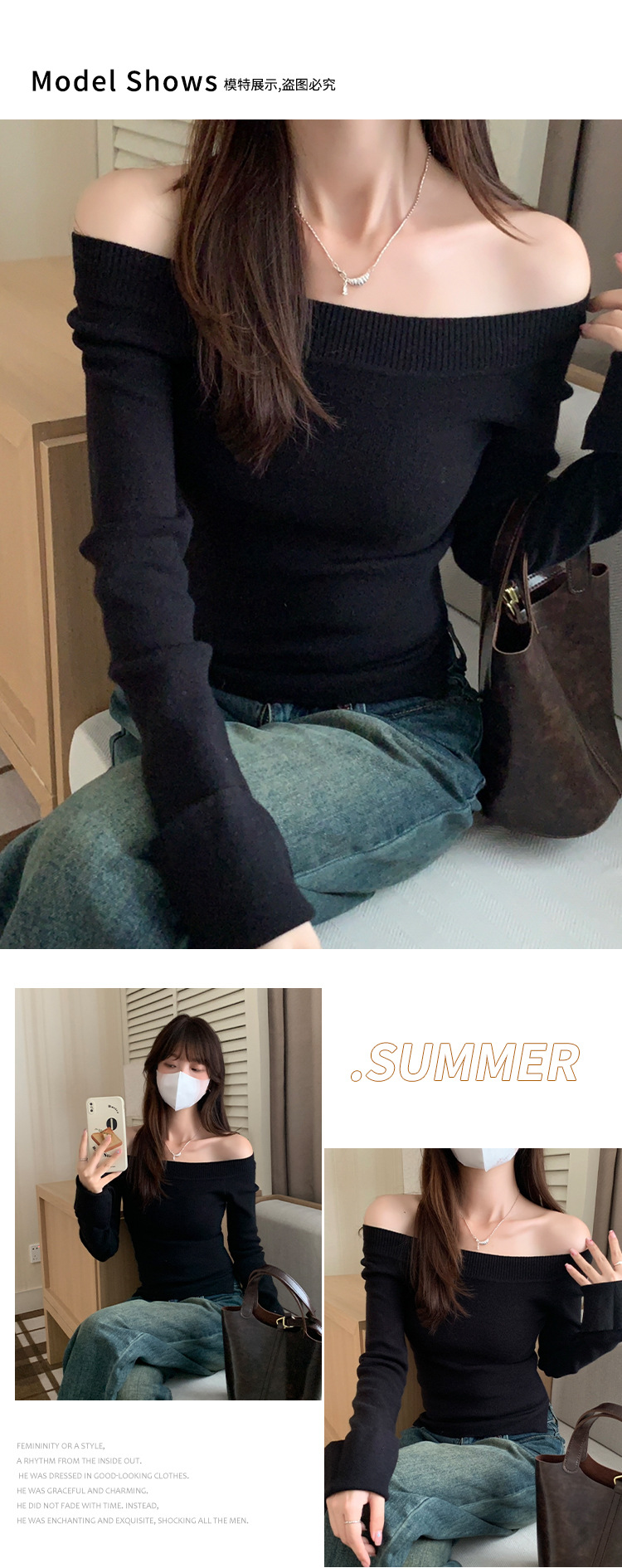 花灰纯欲斜肩针织打底衫女秋软糯露肩喇叭袖毛衣修身显瘦内搭上衣