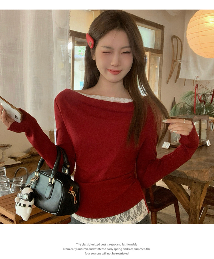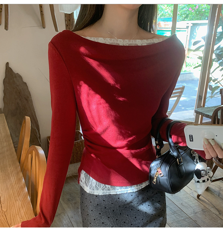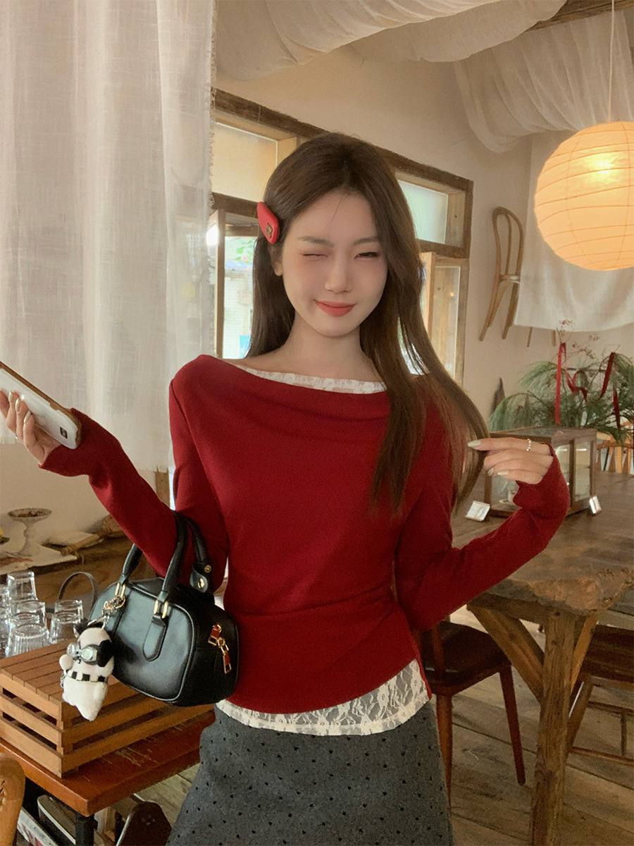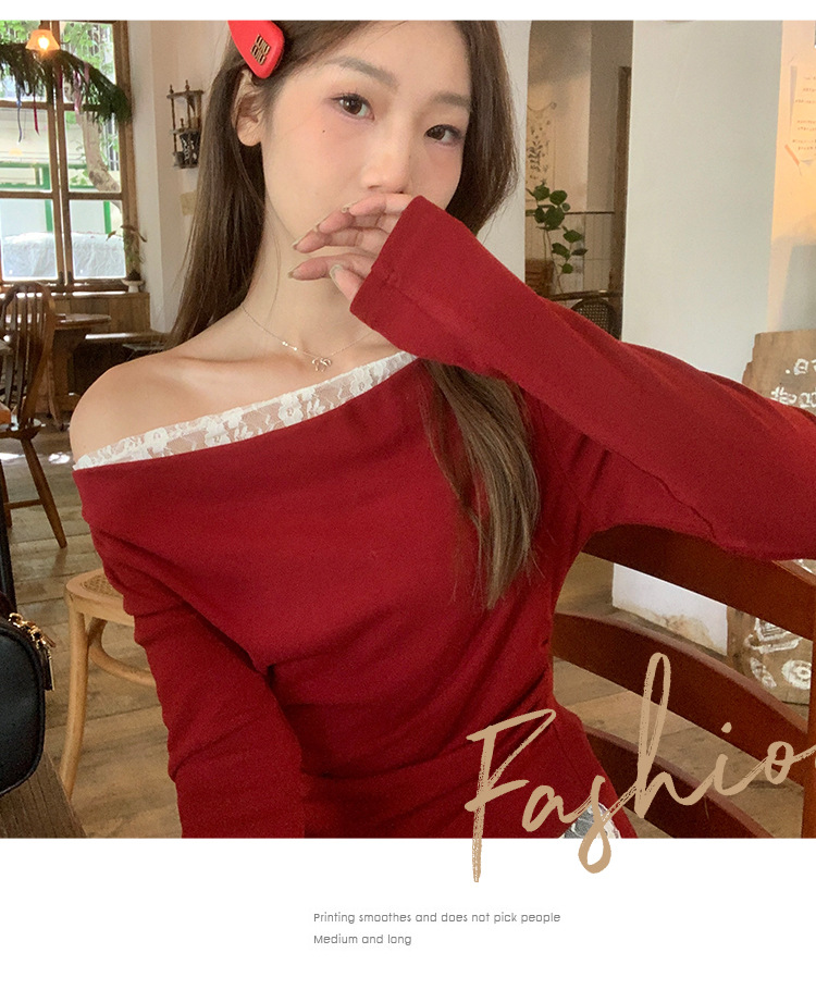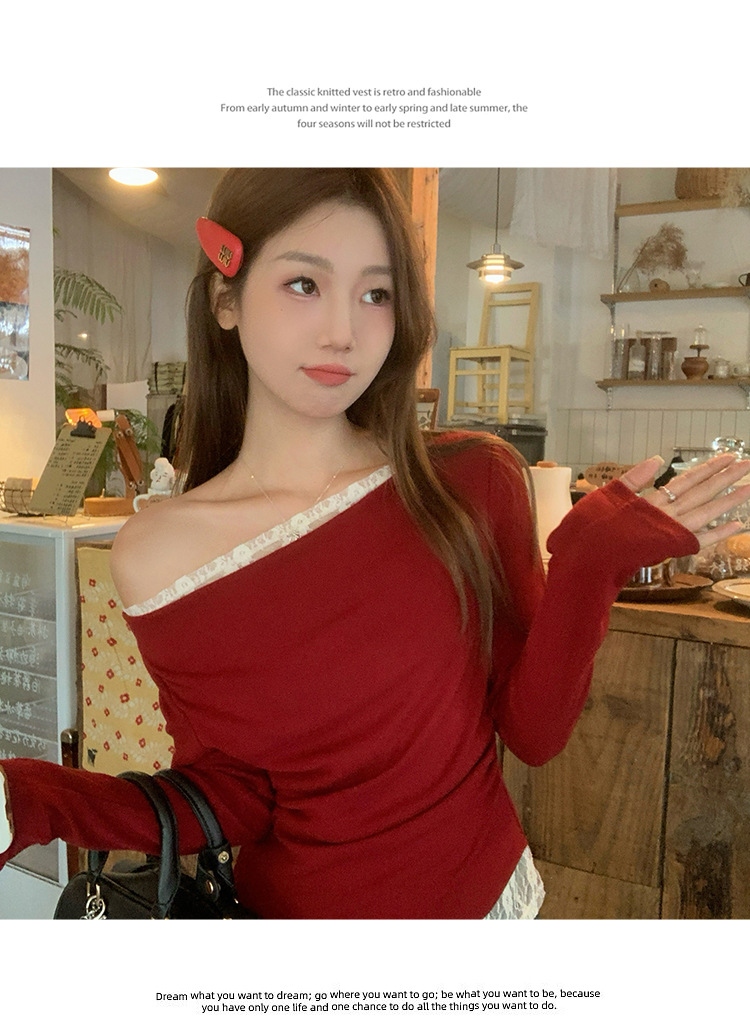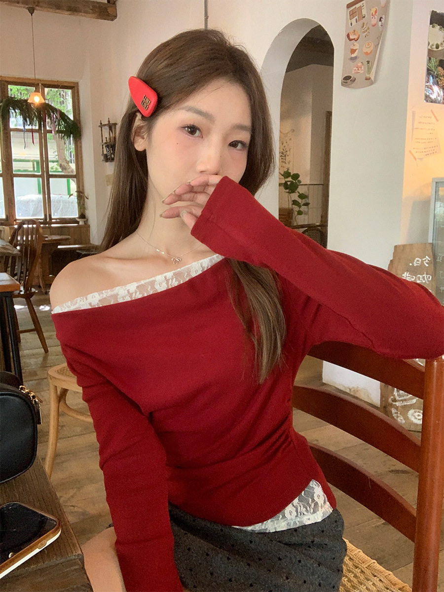 圣诞红色斜角露肩纯欲蕾丝拼接长袖打底衫女秋冬内搭外穿绝美上衣
