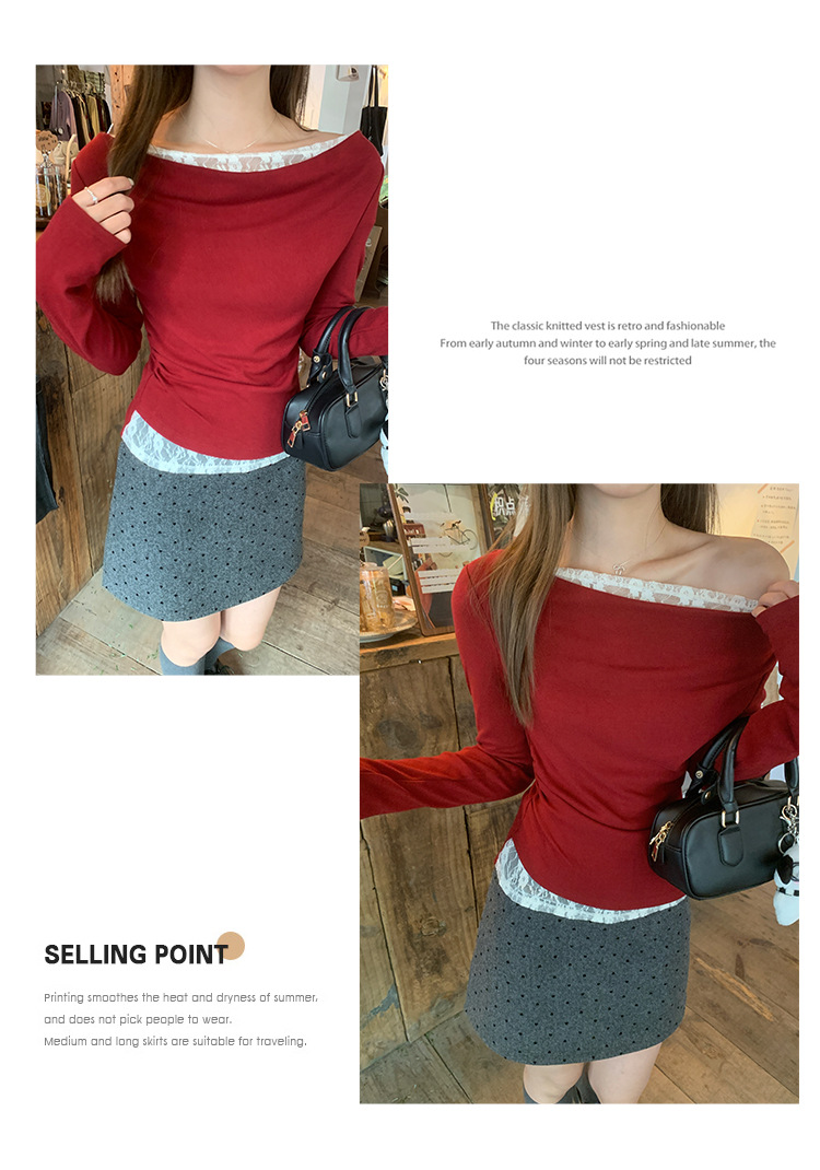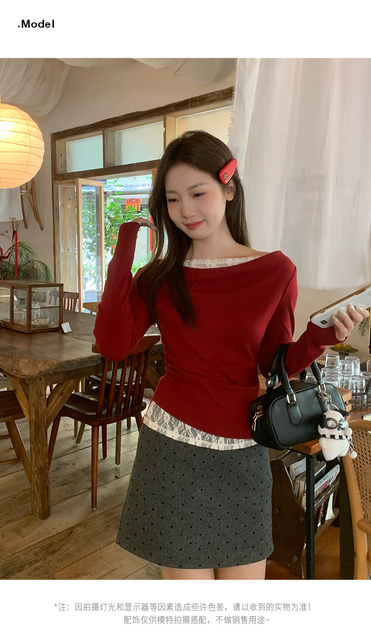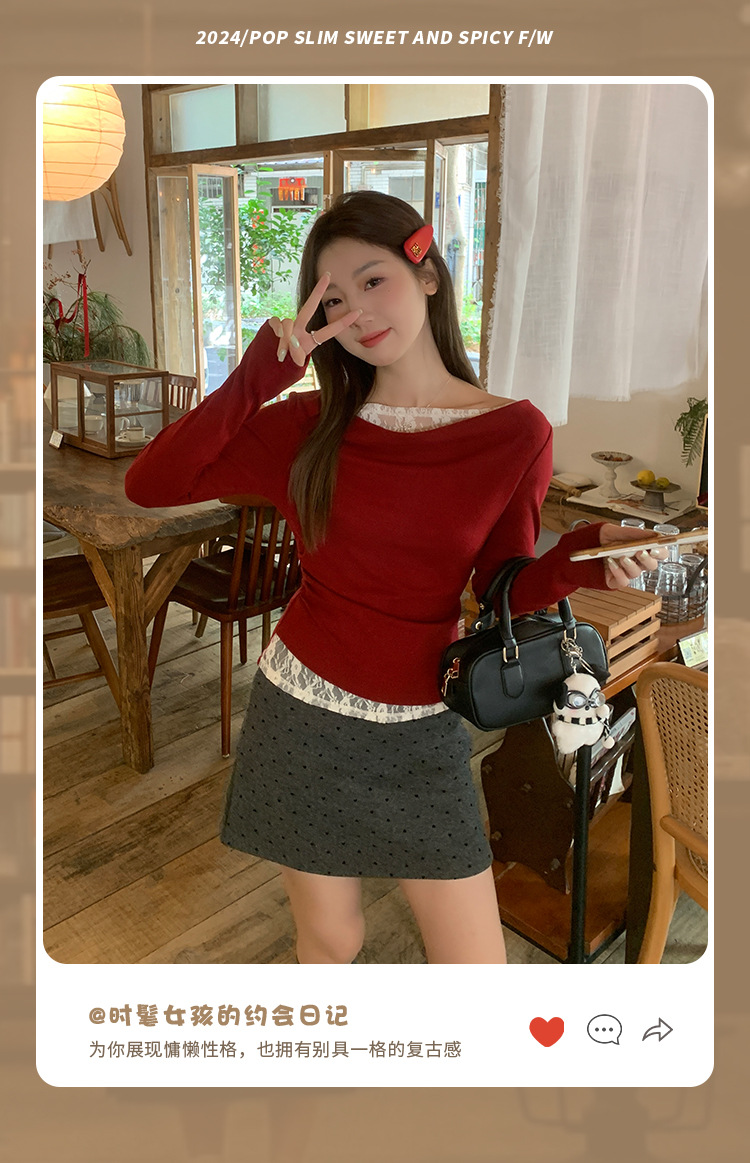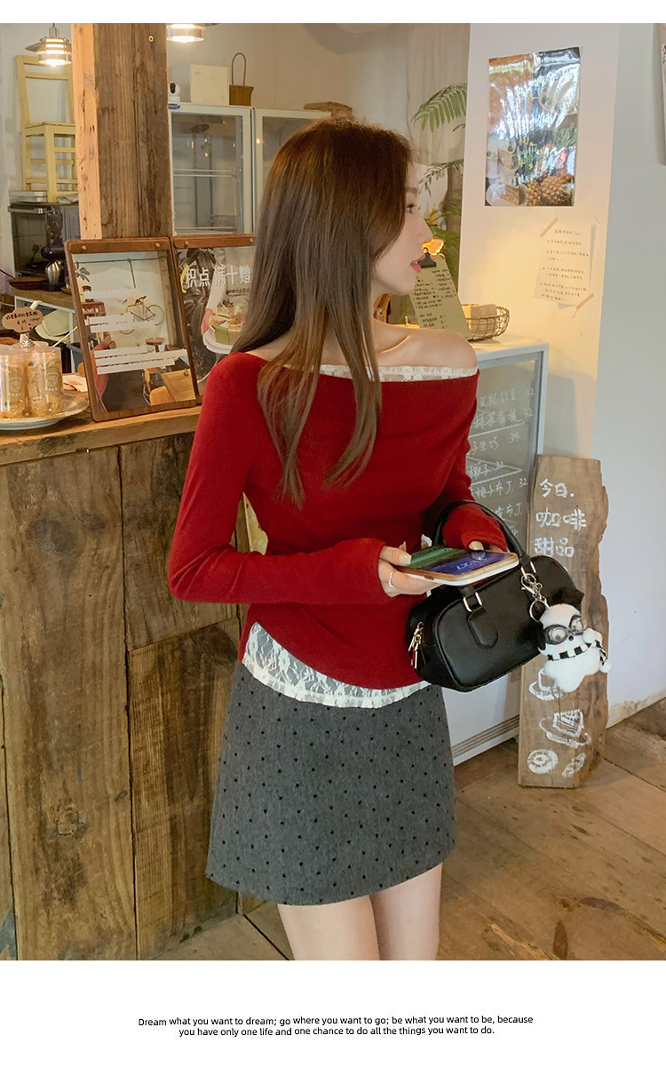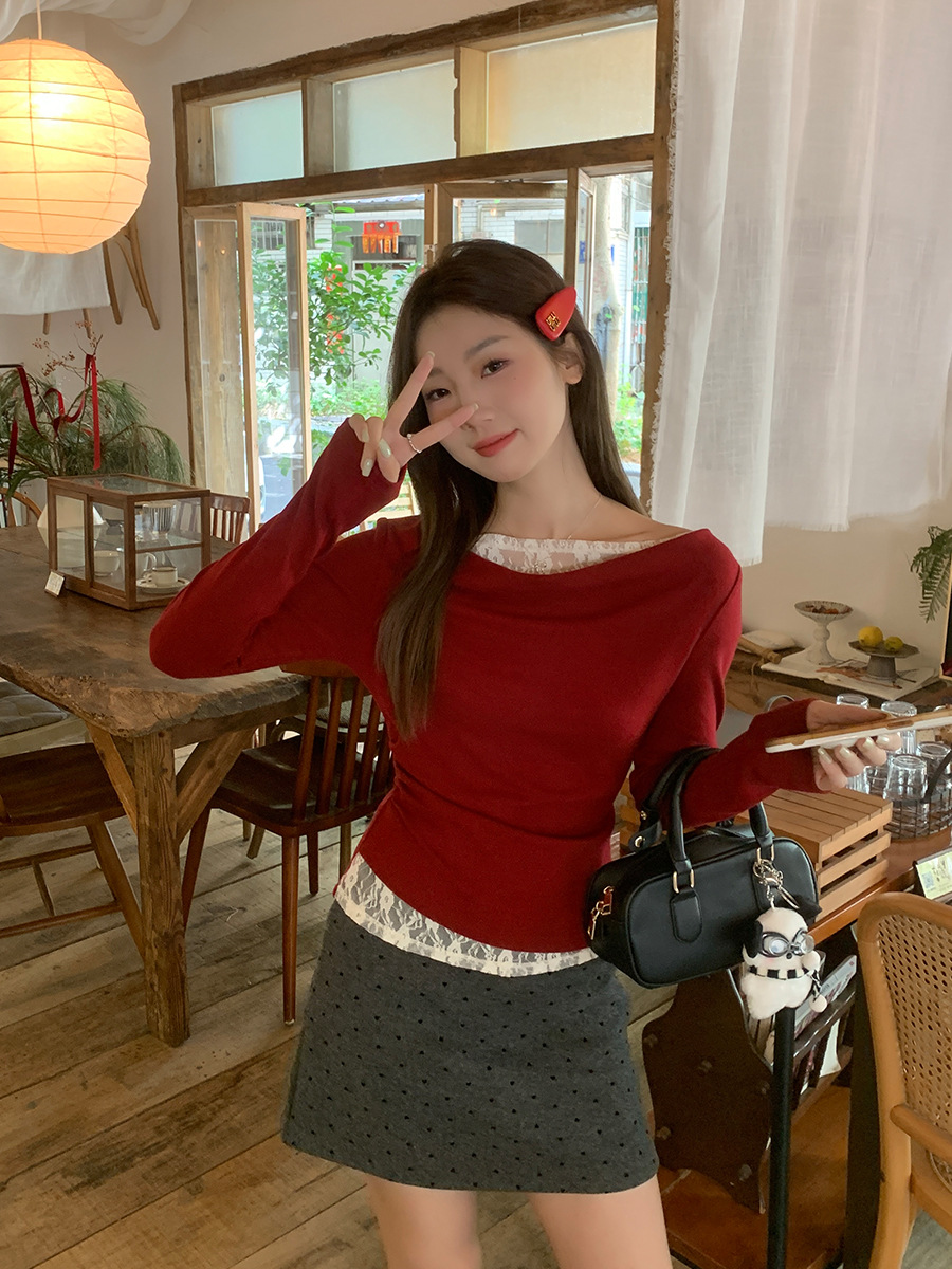 圣诞红色斜角露肩纯欲蕾丝拼接长袖打底衫女秋冬内搭外穿绝美上衣