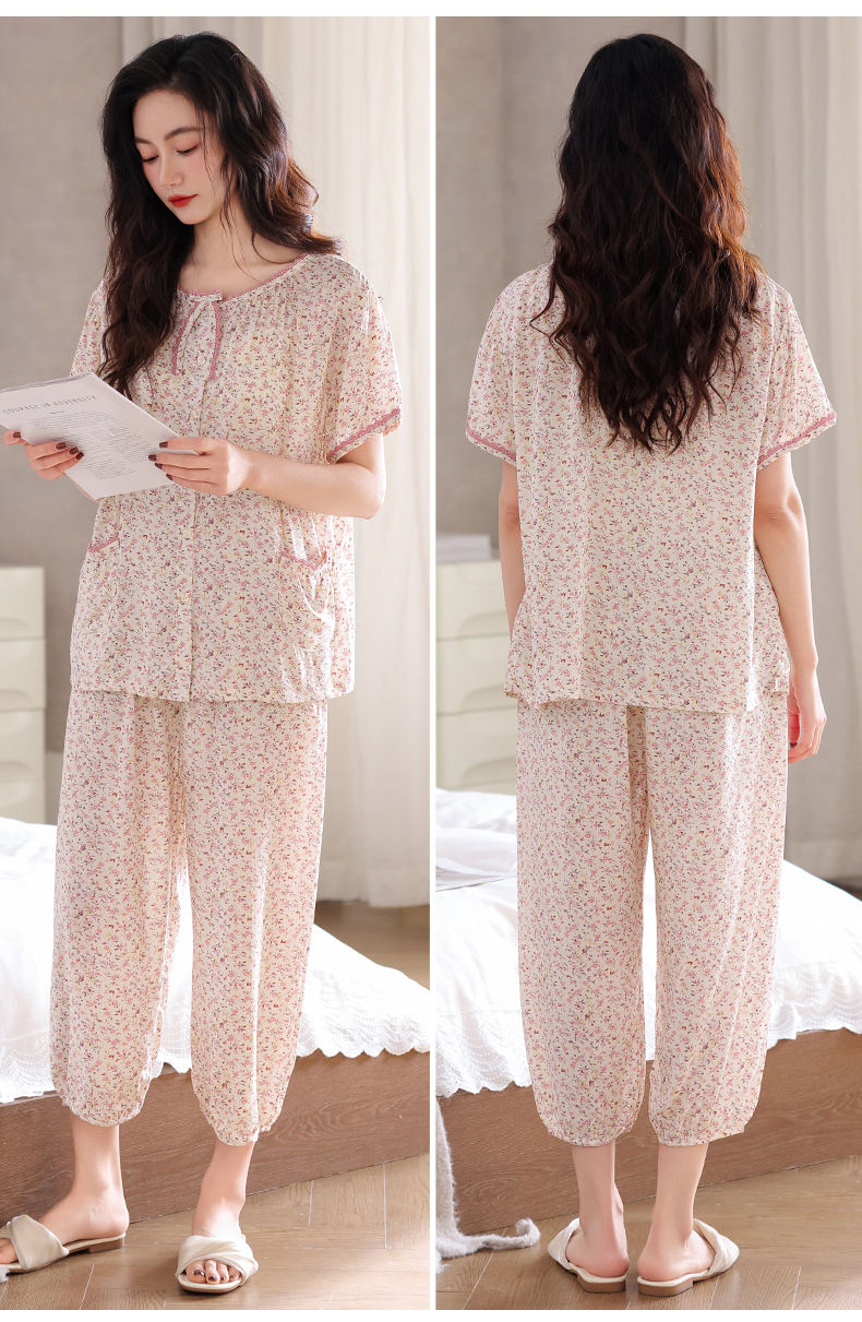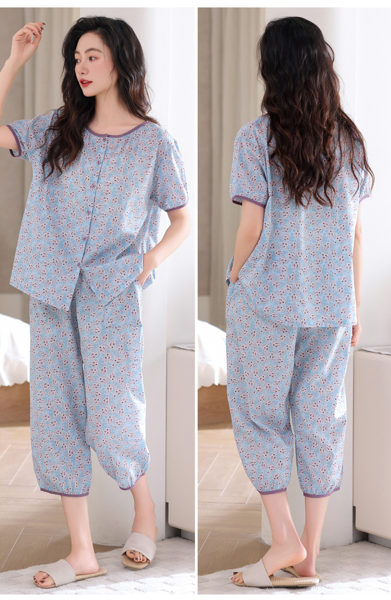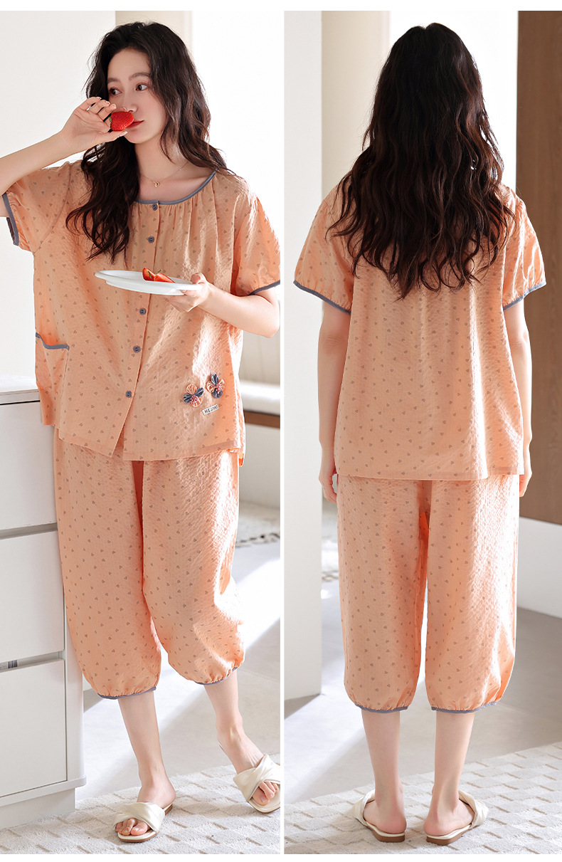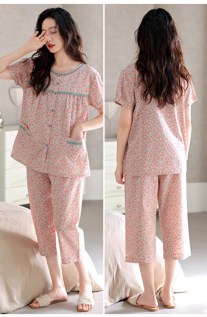 梭织棉纱布睡衣女士夏季薄款短袖七分裤纯棉家居服套装开衫可外穿