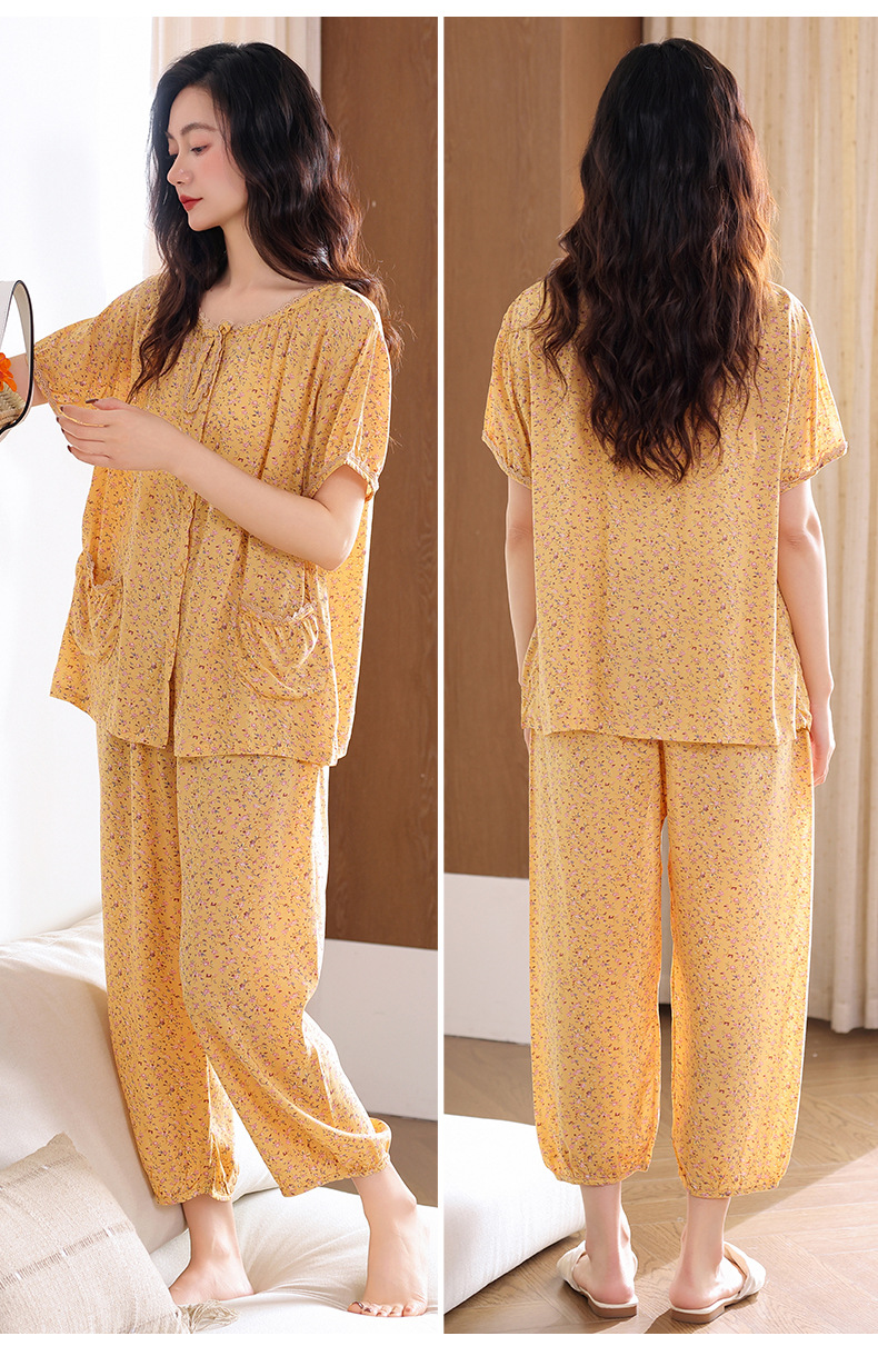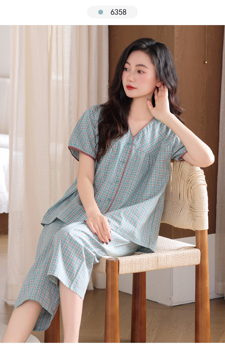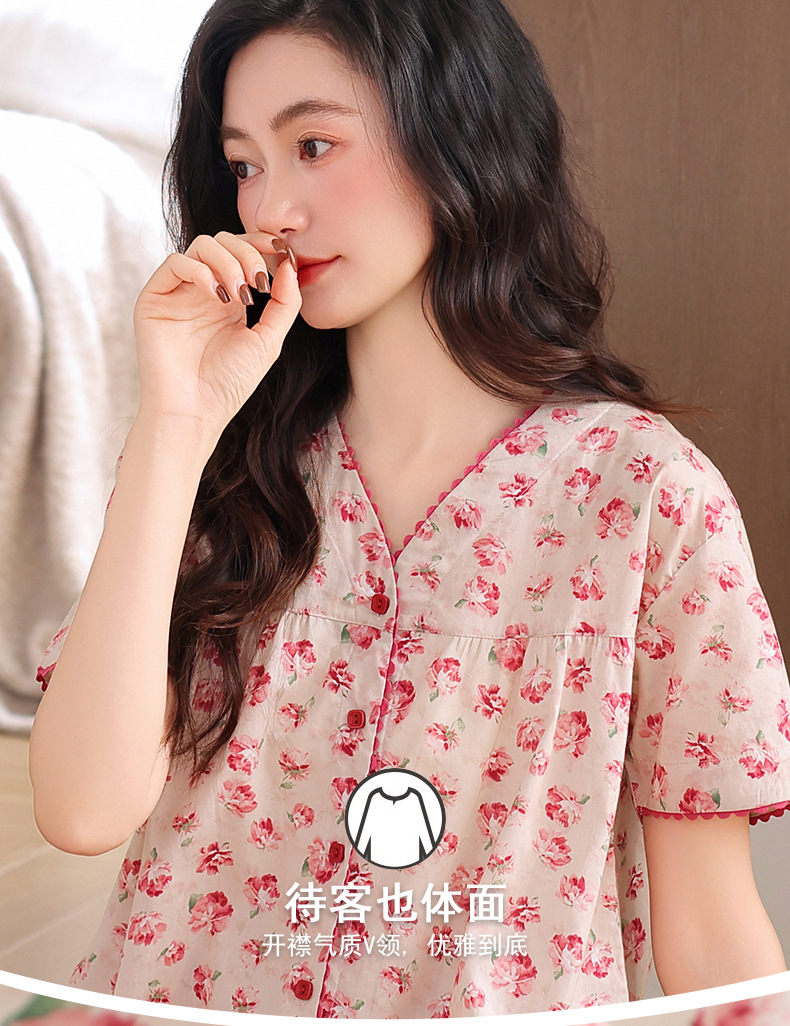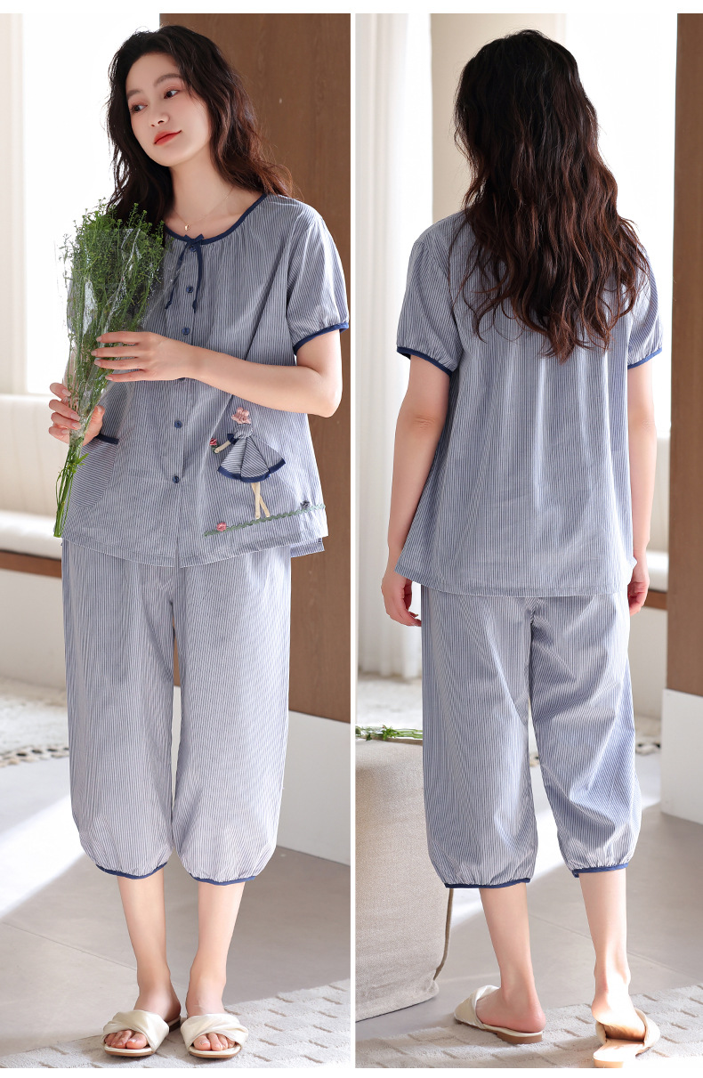 梭织棉纱布睡衣女士夏季薄款短袖七分裤纯棉家居服套装开衫可外穿