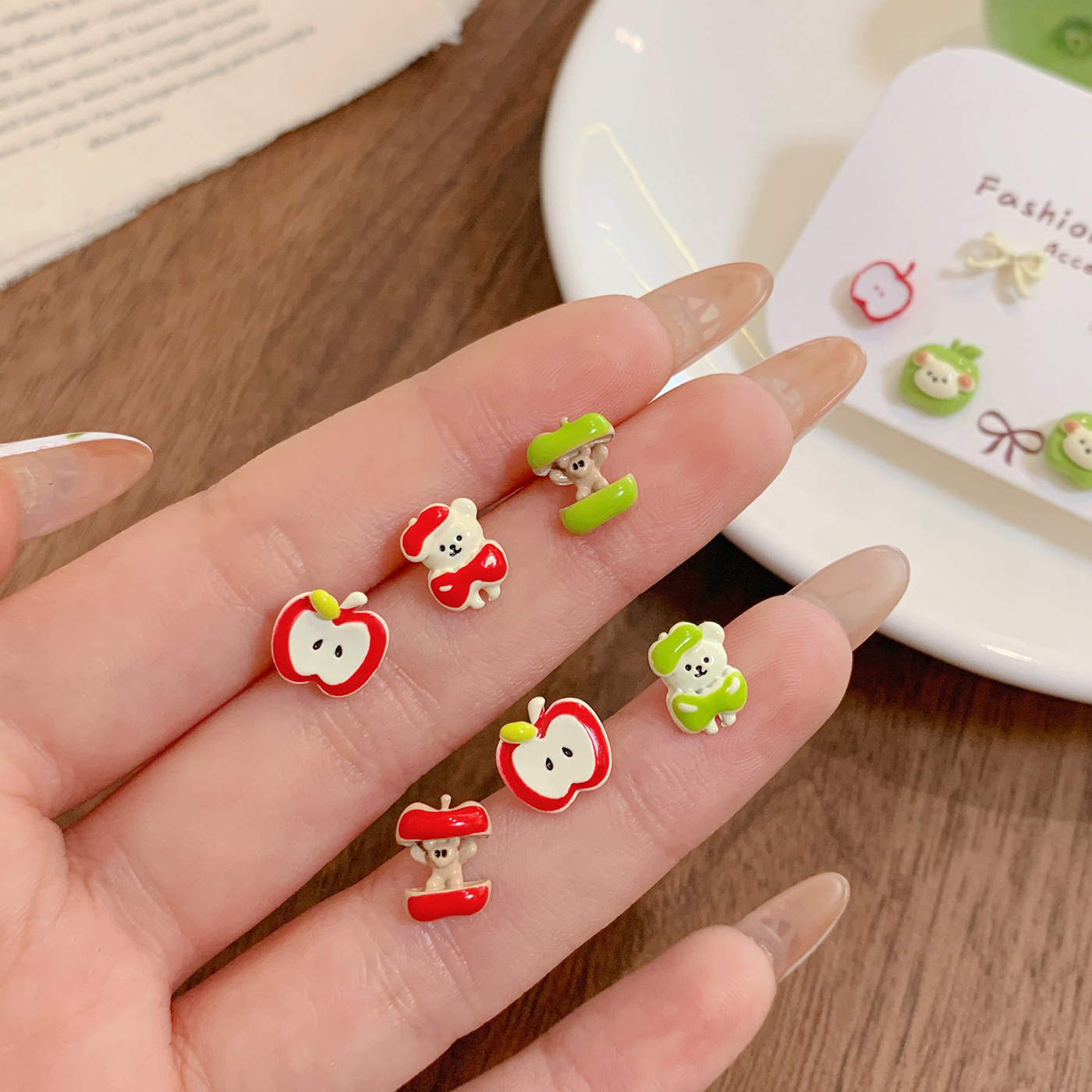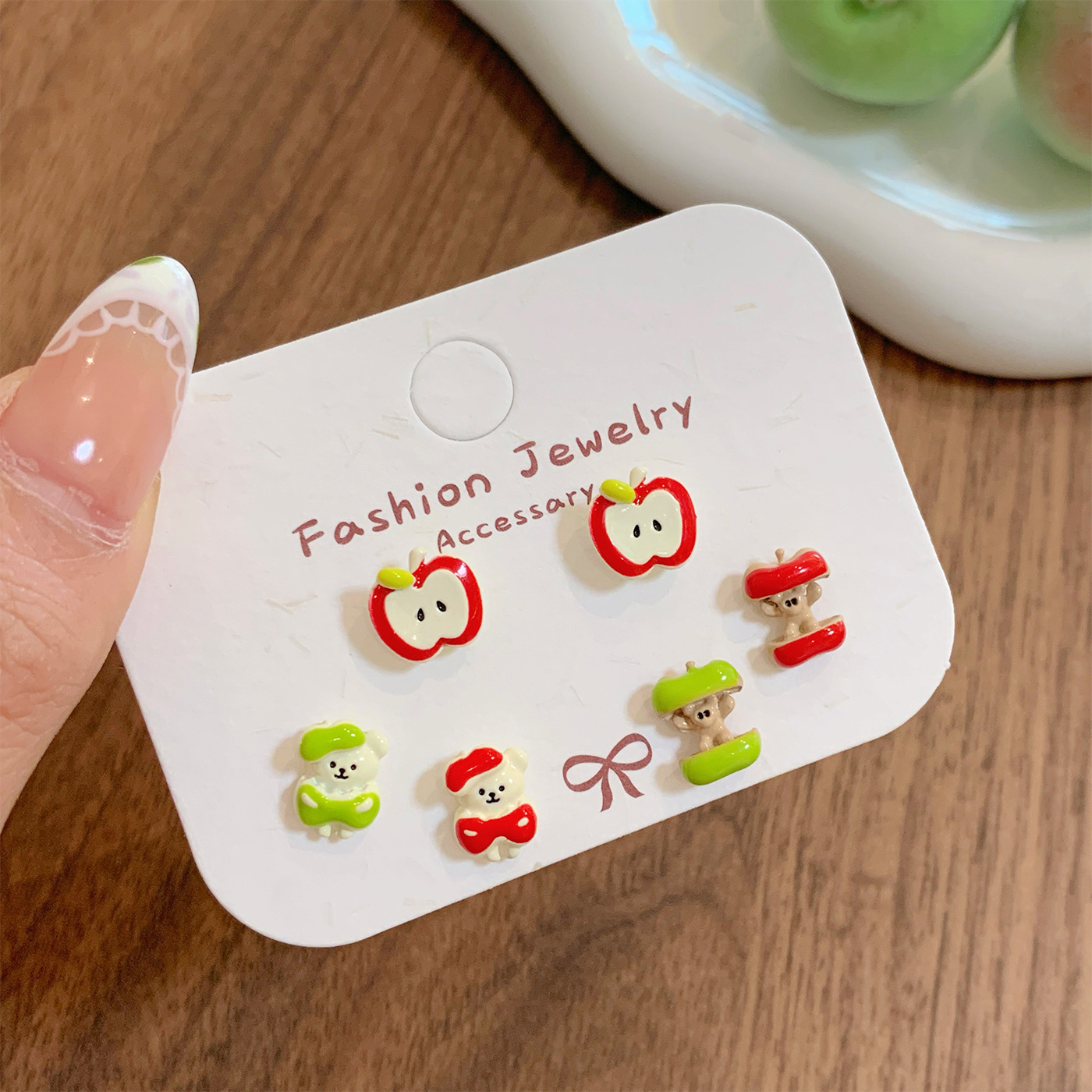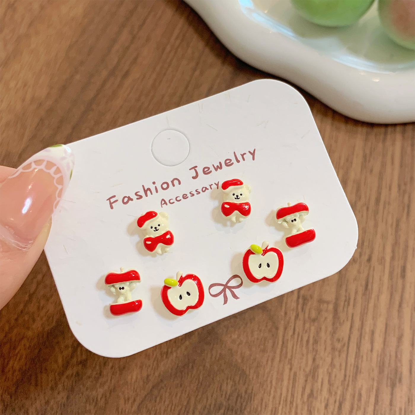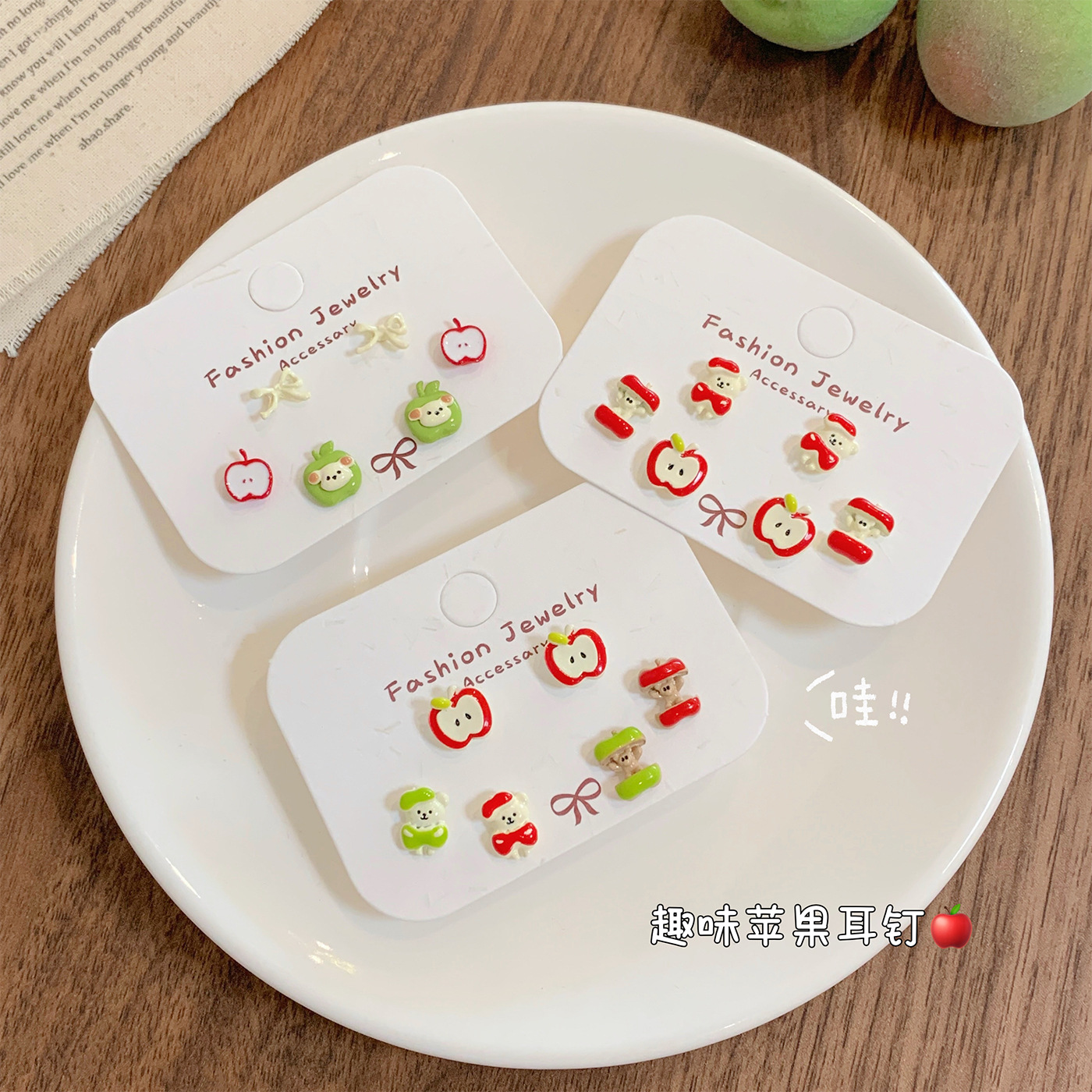 卡通趣味滴油苹果小熊耳钉三件套女银针小巧精致百搭显白学生耳饰