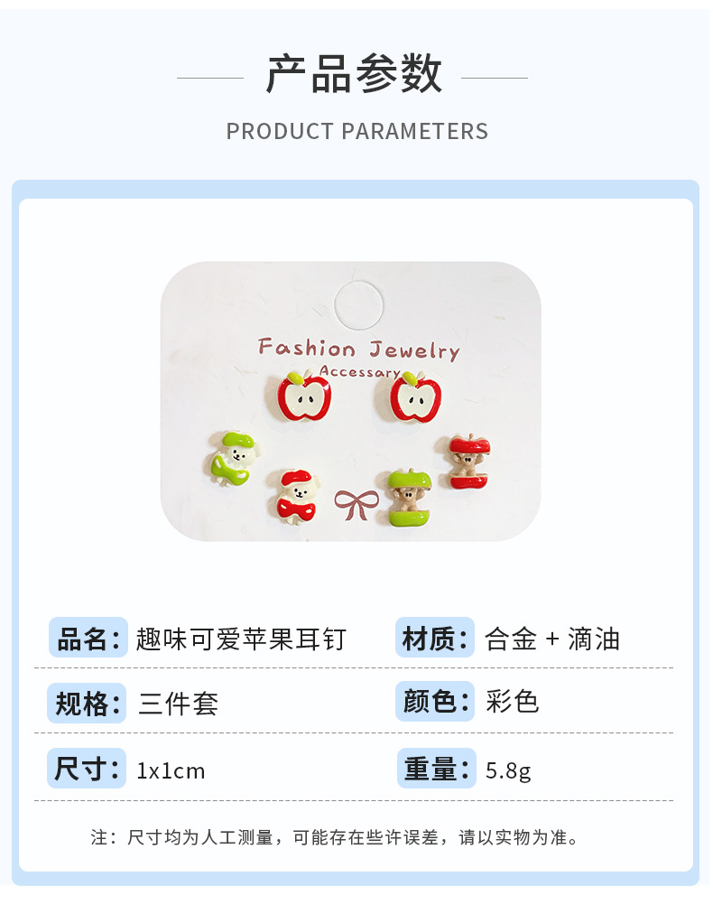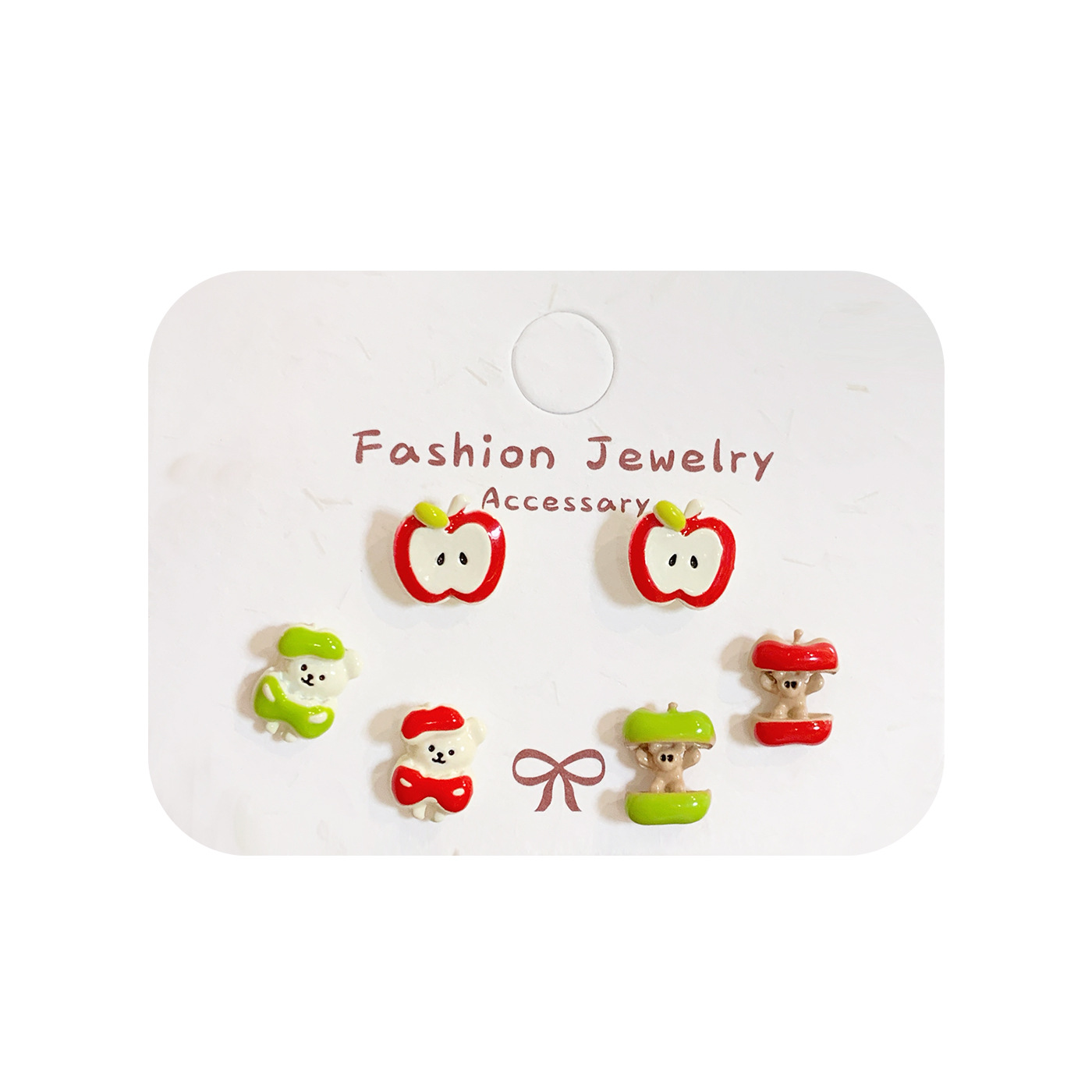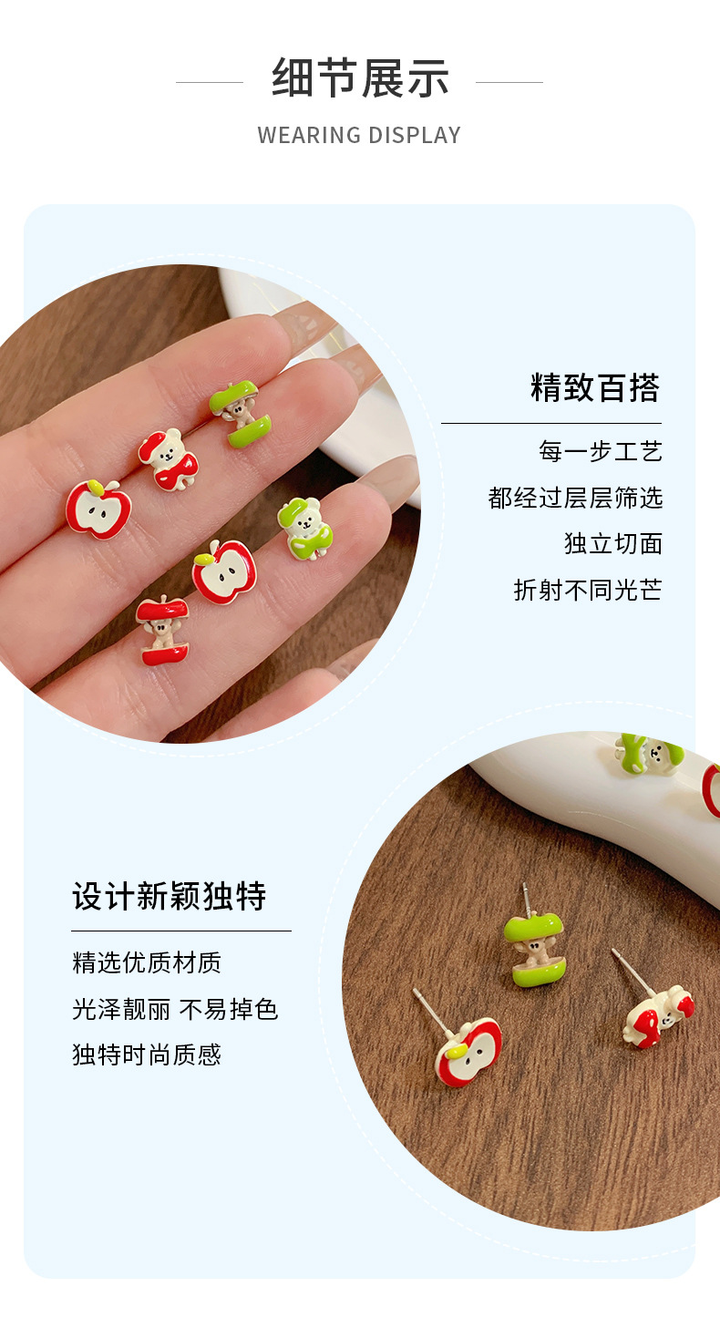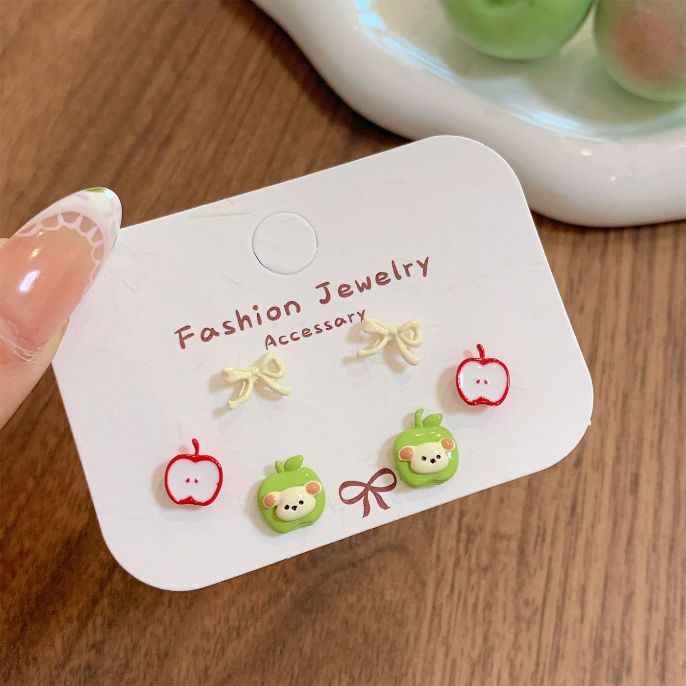 卡通趣味滴油苹果小熊耳钉三件套女银针小巧精致百搭显白学生耳饰