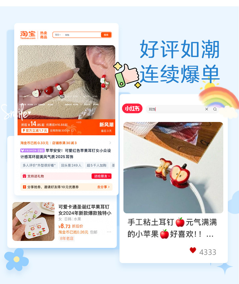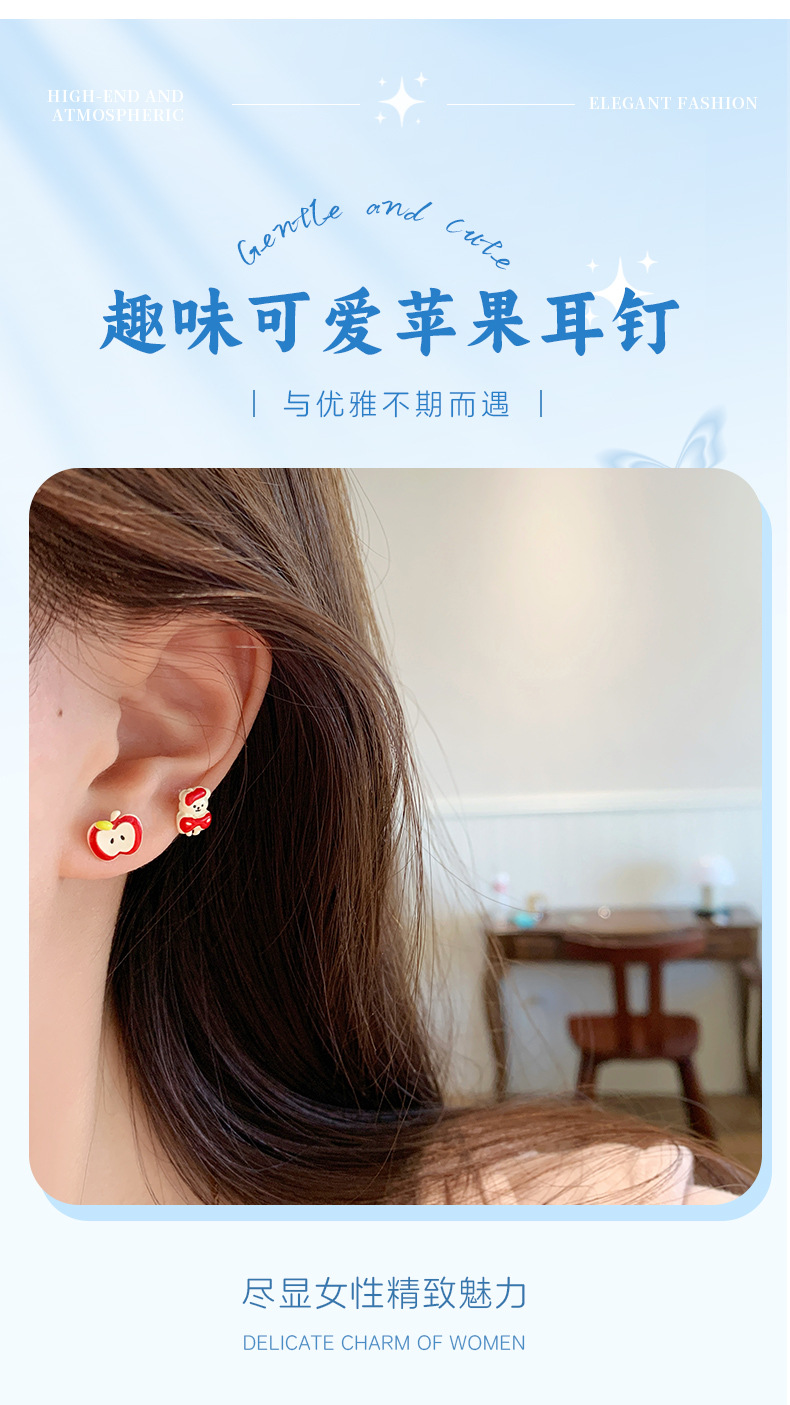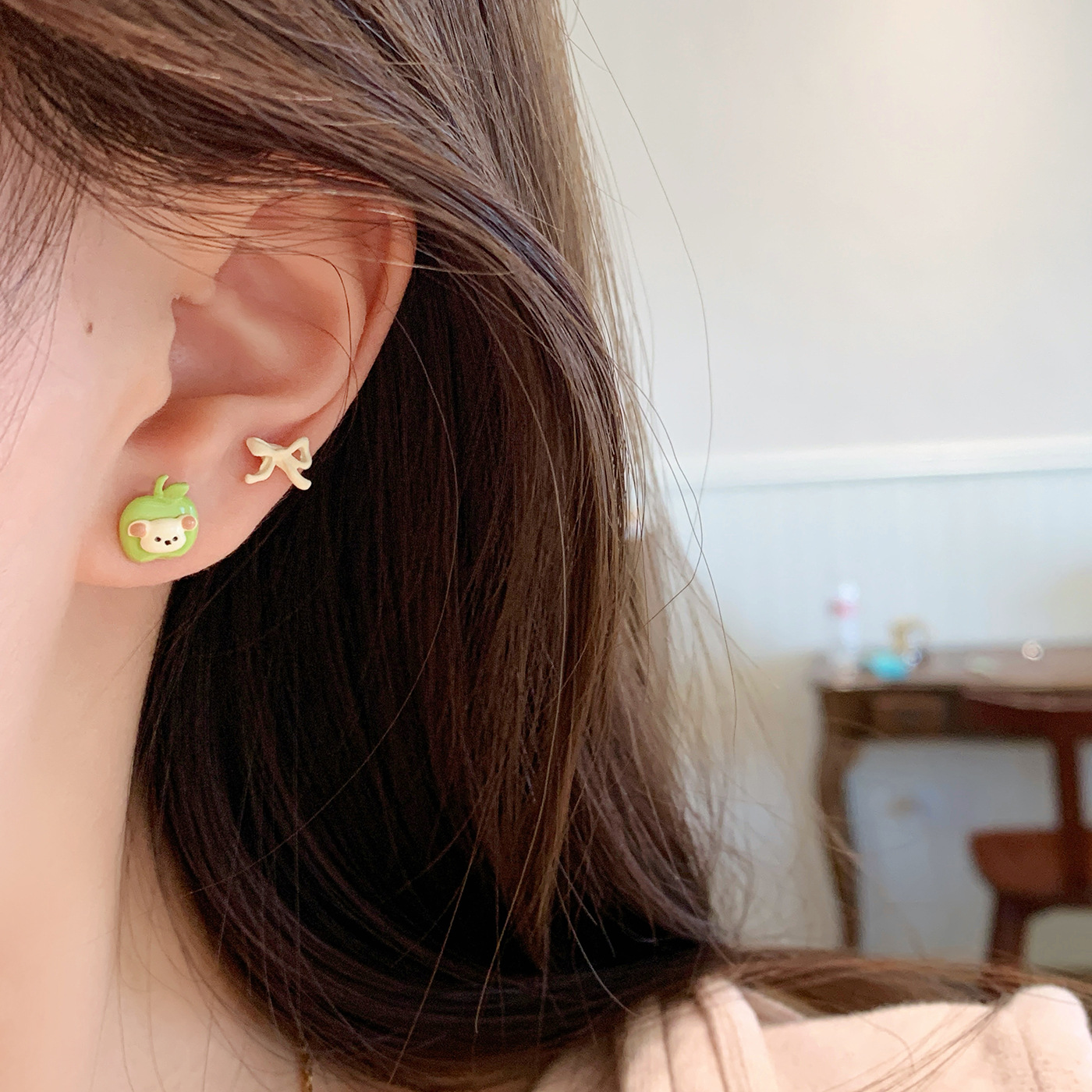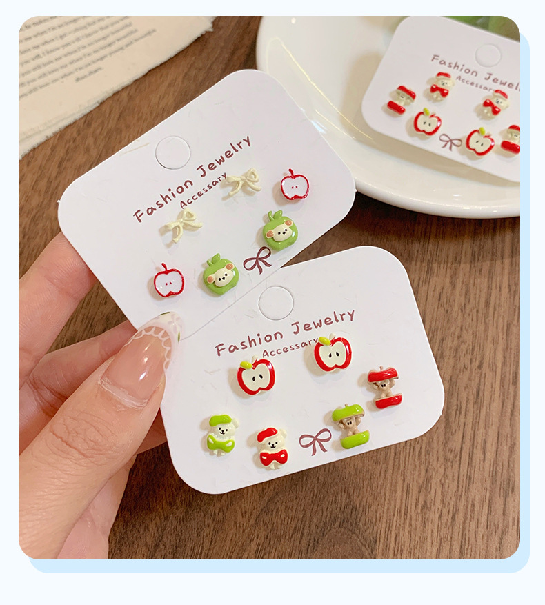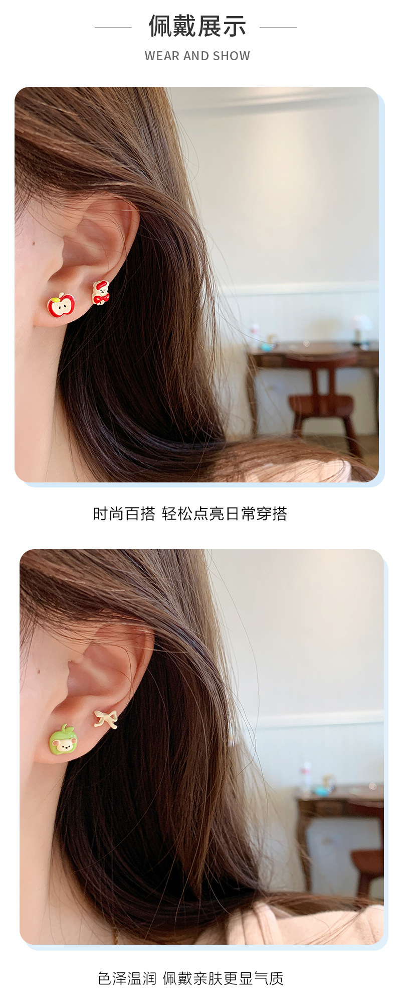 卡通趣味滴油苹果小熊耳钉三件套女银针小巧精致百搭显白学生耳饰