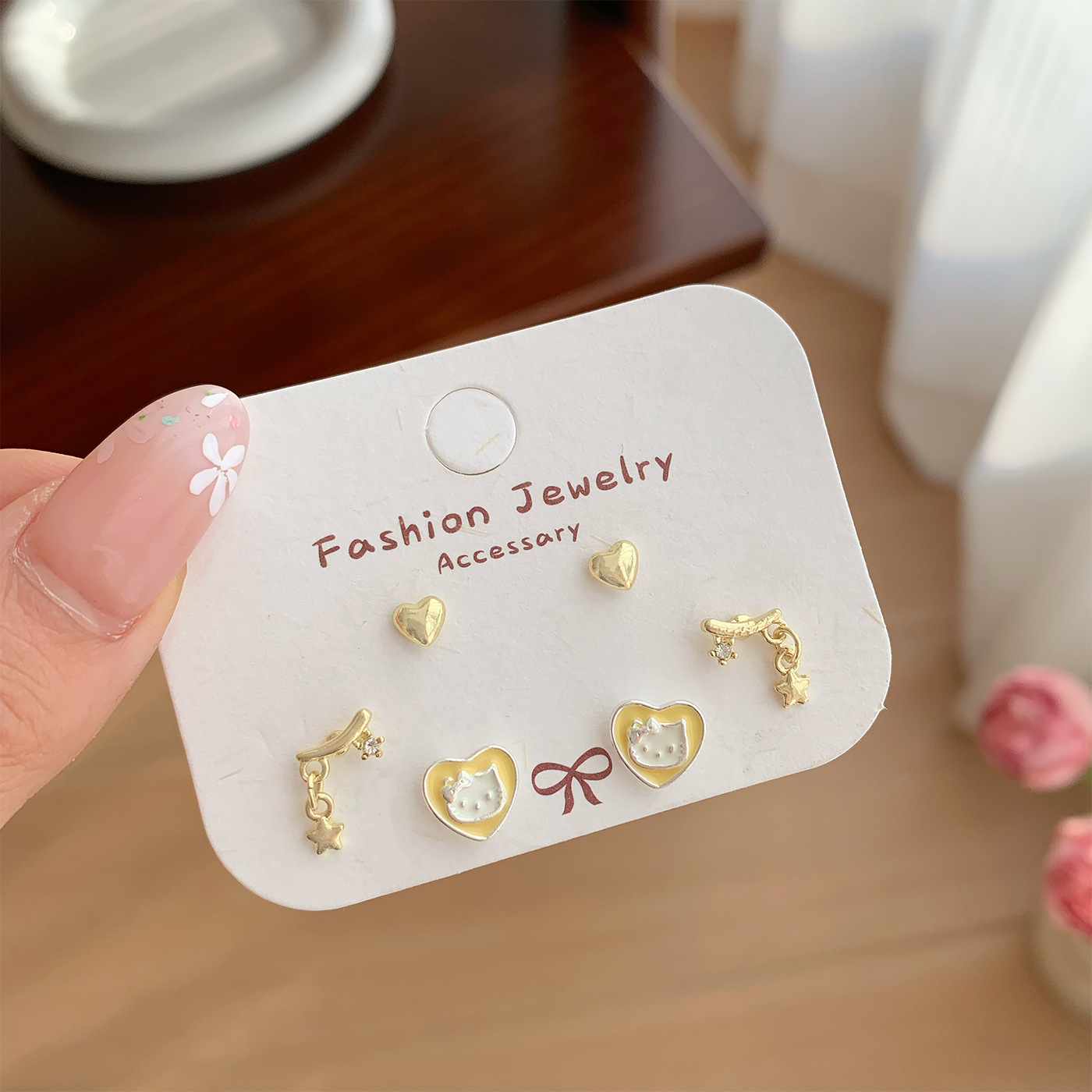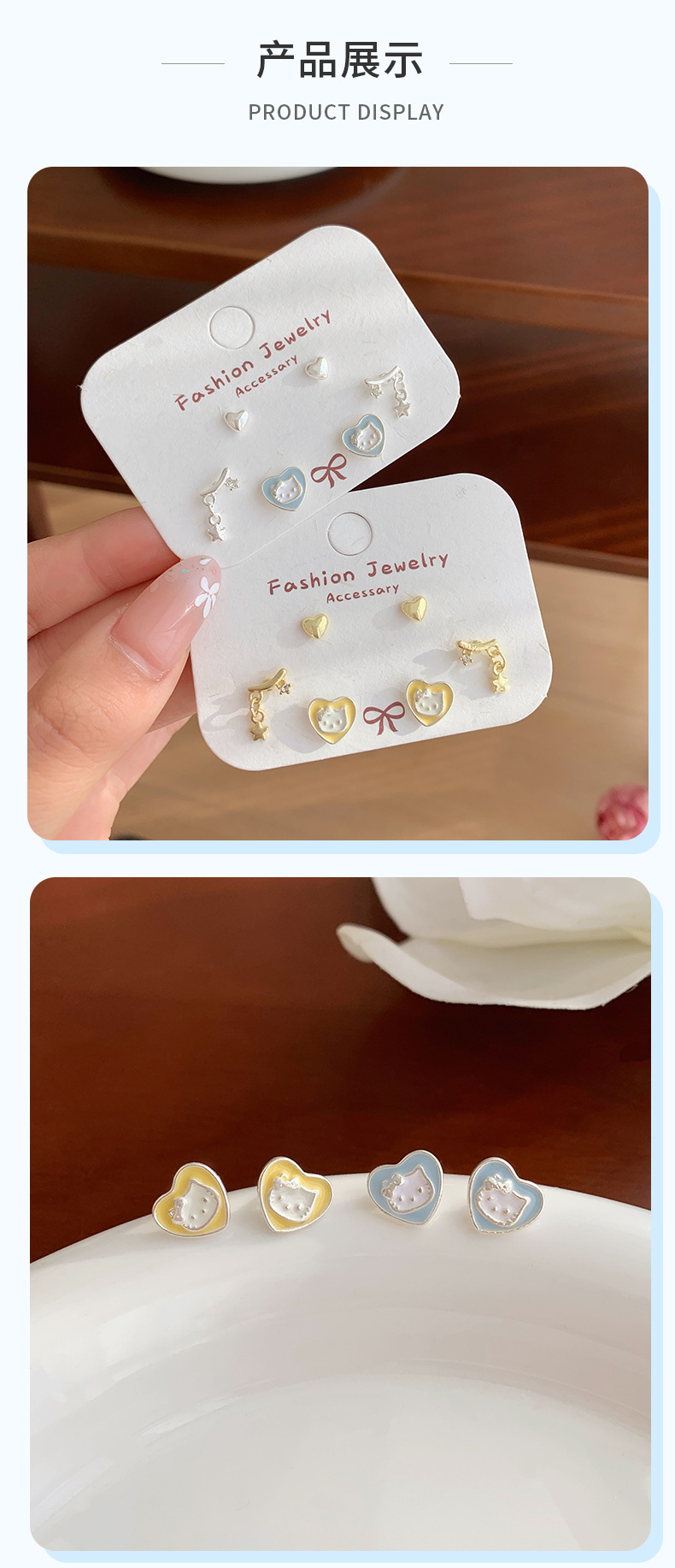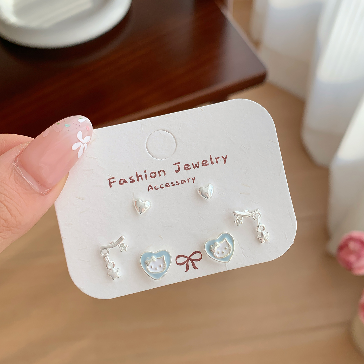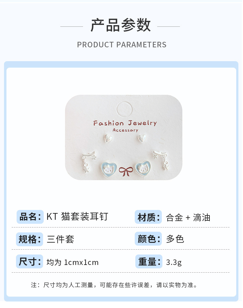卡通可爱滴油爱心KT猫咪耳钉三件套女银针小巧精致甜美少女心耳饰