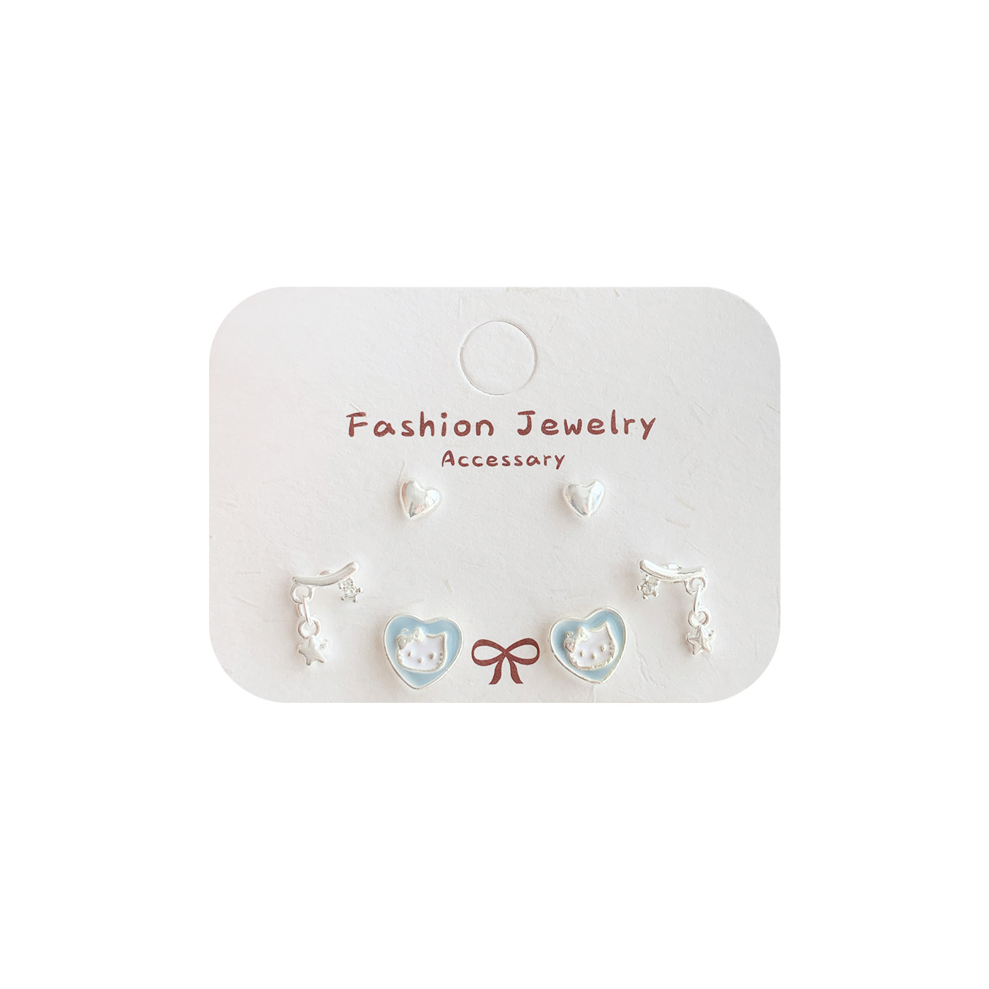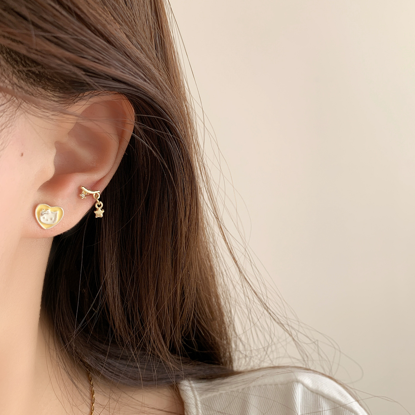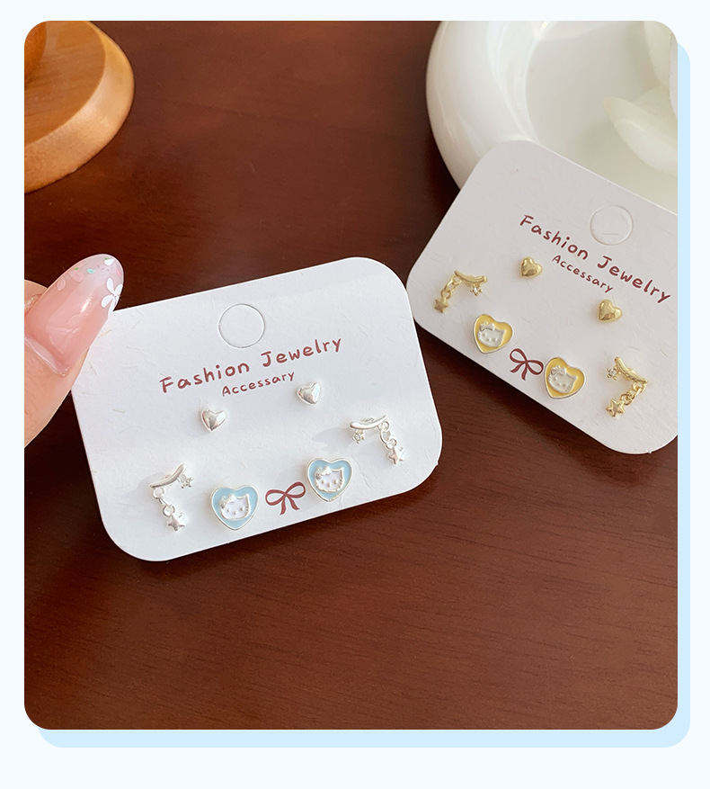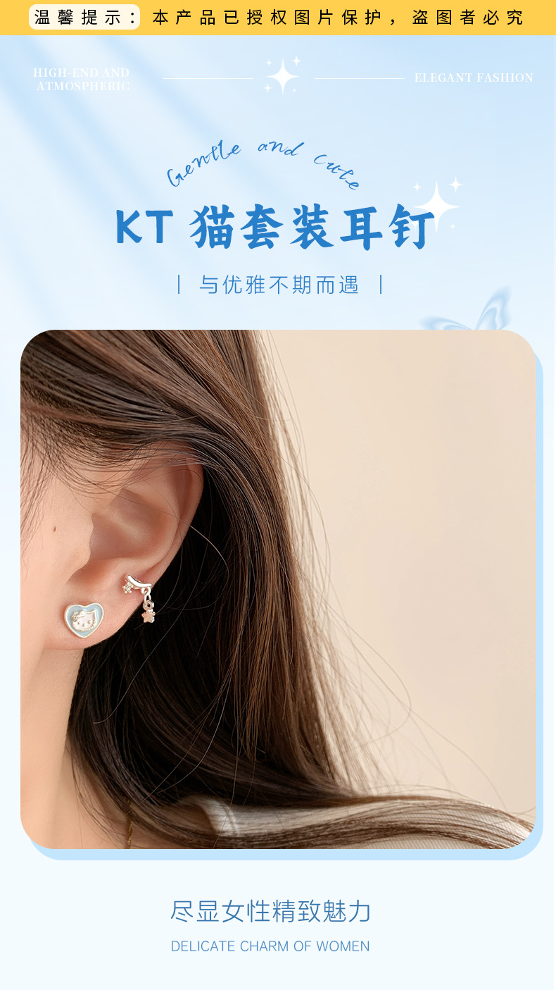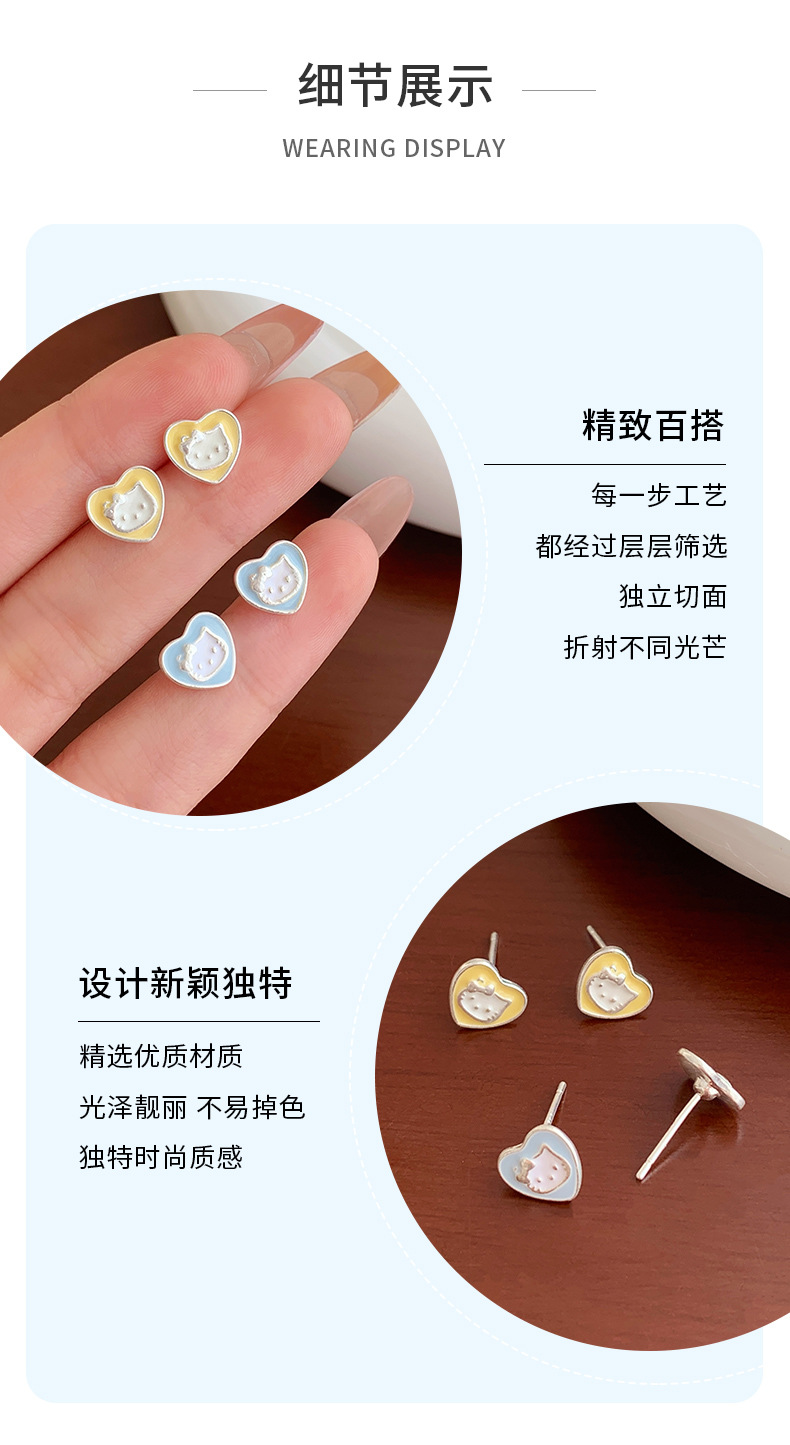 卡通可爱滴油爱心KT猫咪耳钉三件套女银针小巧精致甜美少女心耳饰