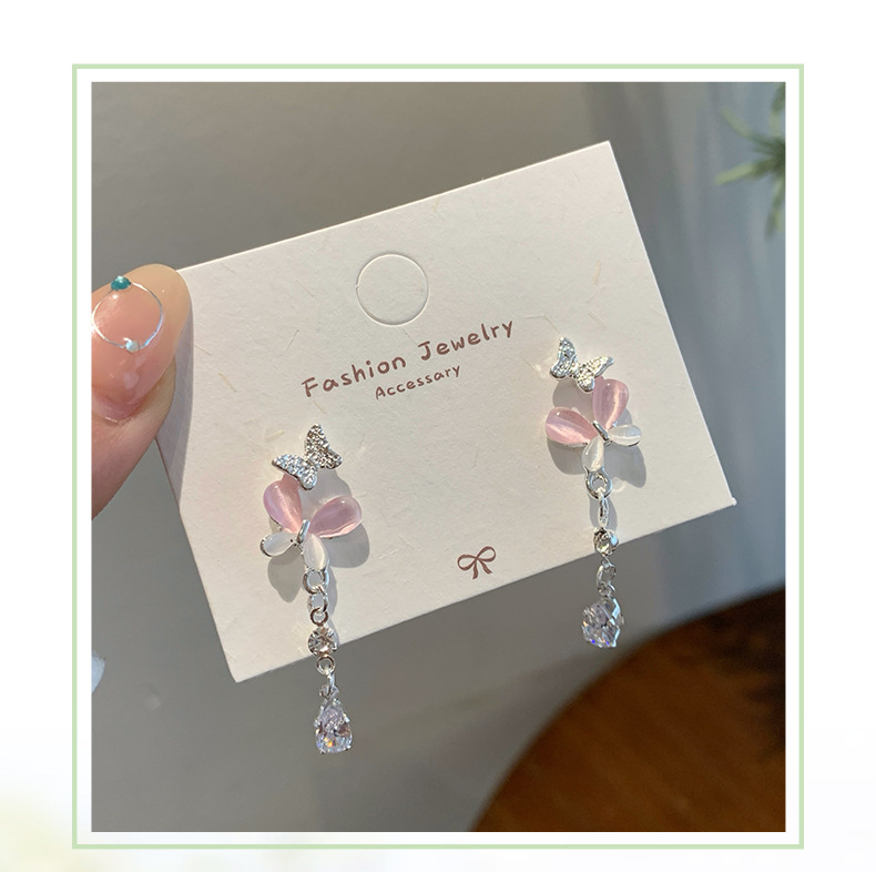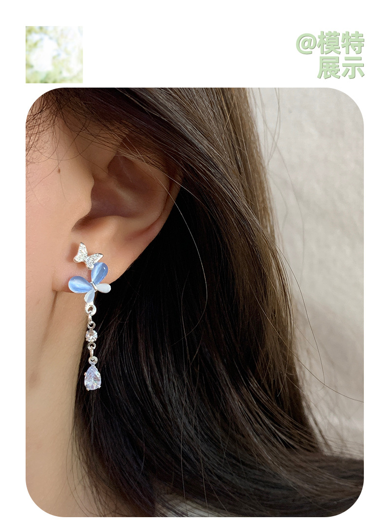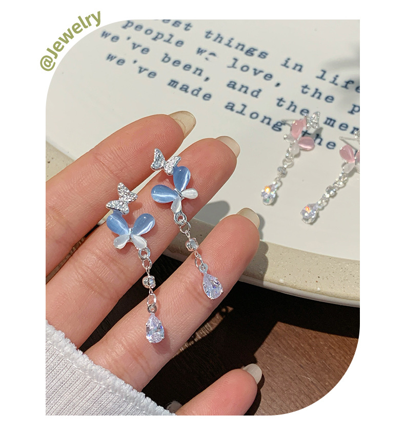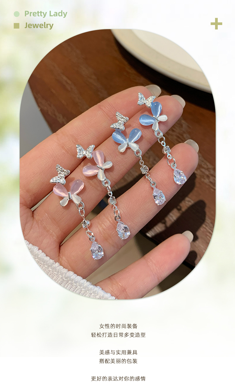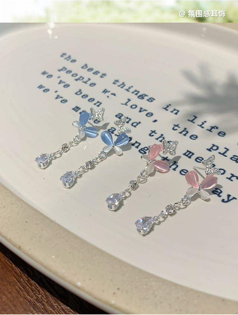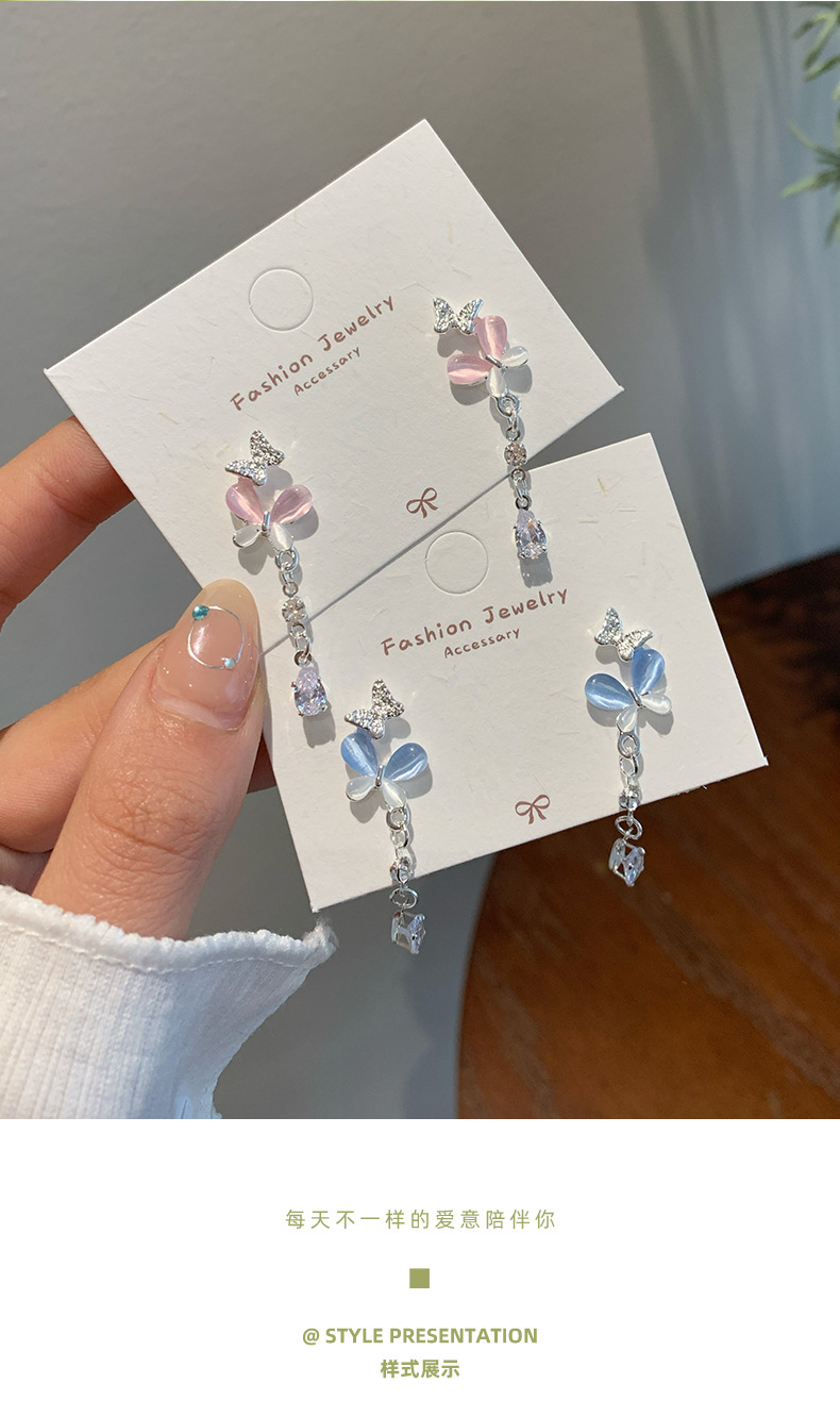 韩版轻奢粉蓝蝴蝶猫眼石耳环女银针长款吊坠流苏气质高级感耳饰