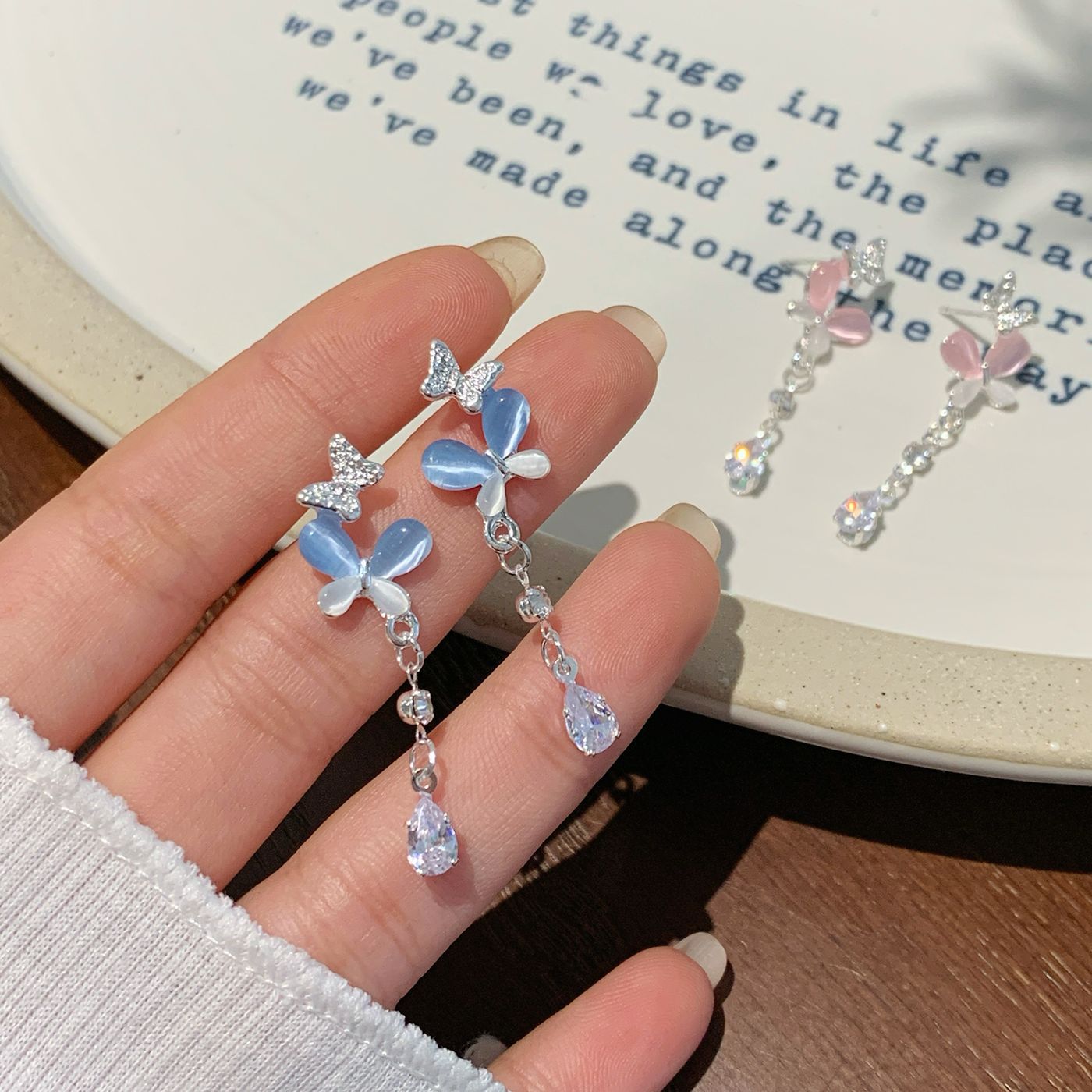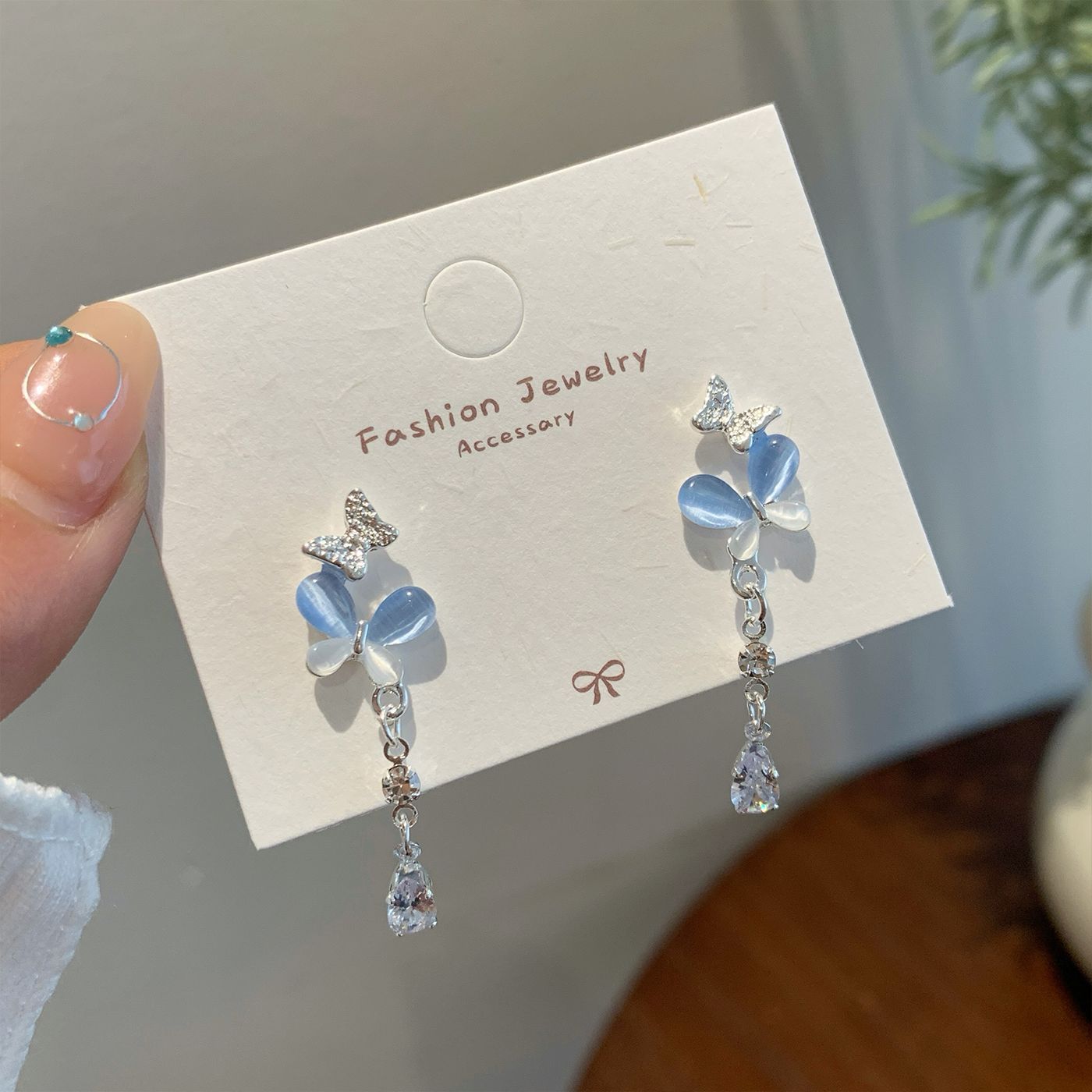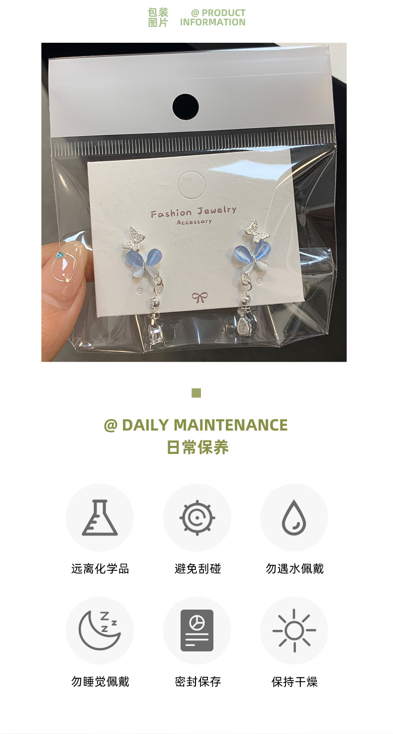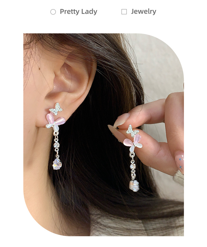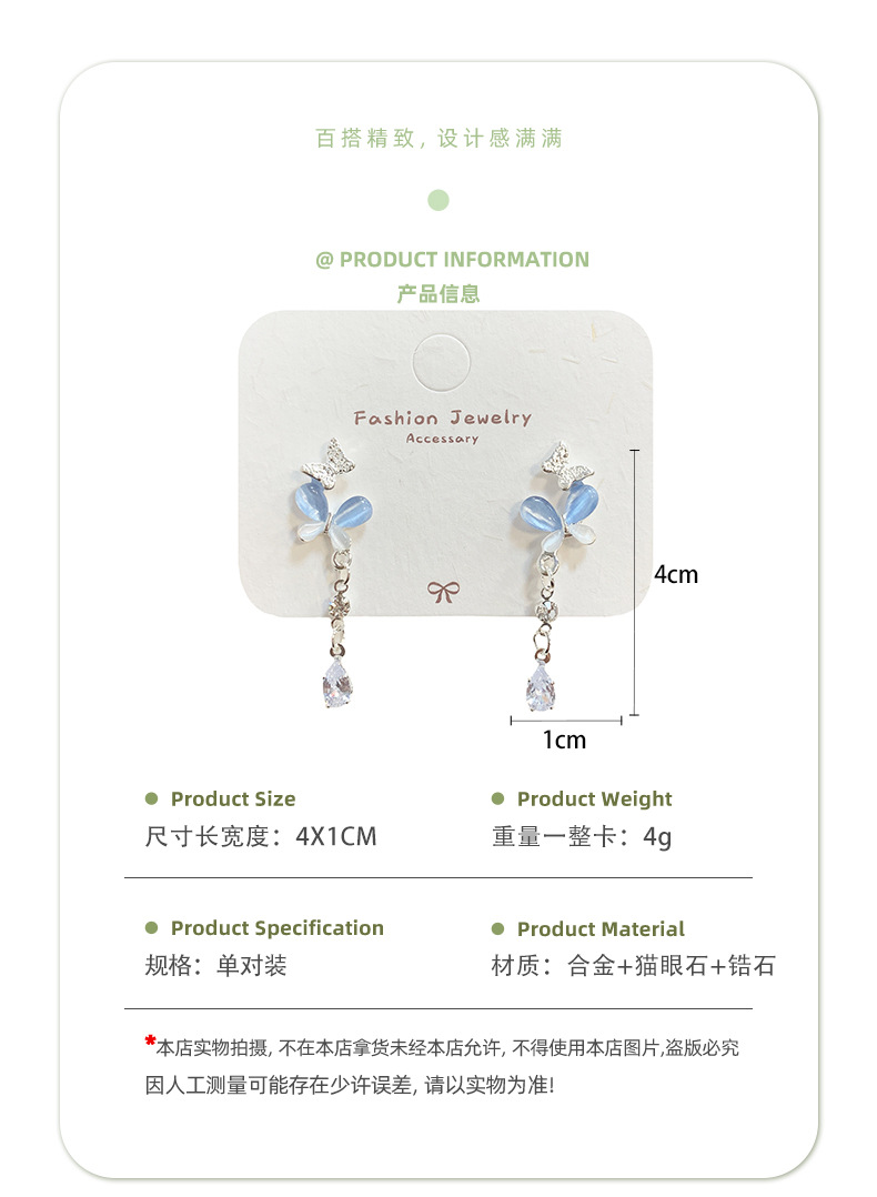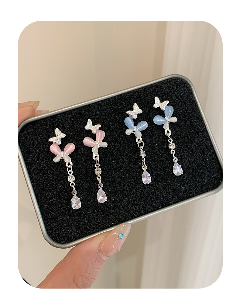 韩版轻奢粉蓝蝴蝶猫眼石耳环女银针长款吊坠流苏气质高级感耳饰
