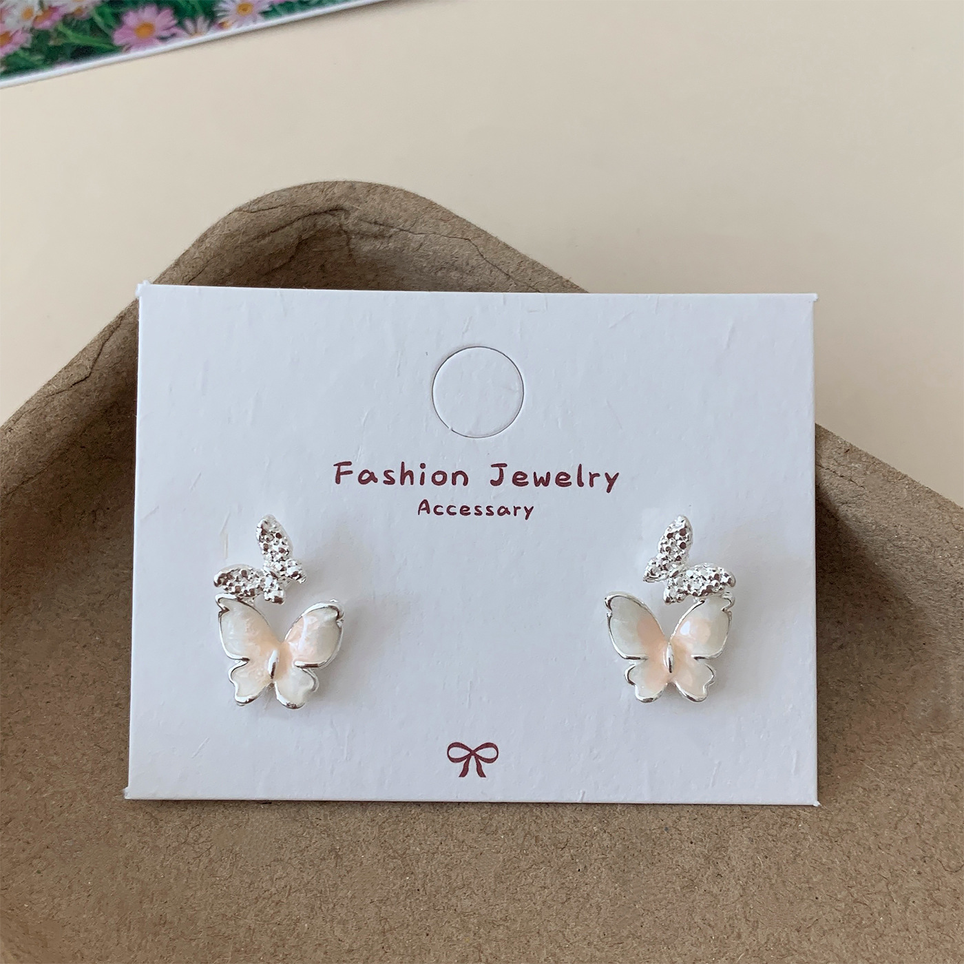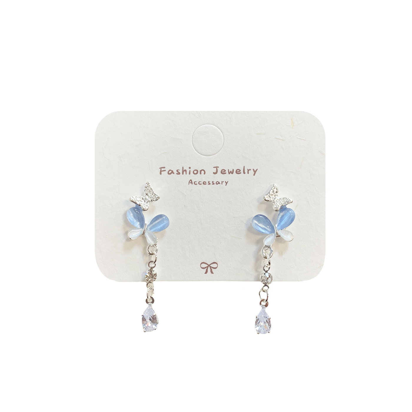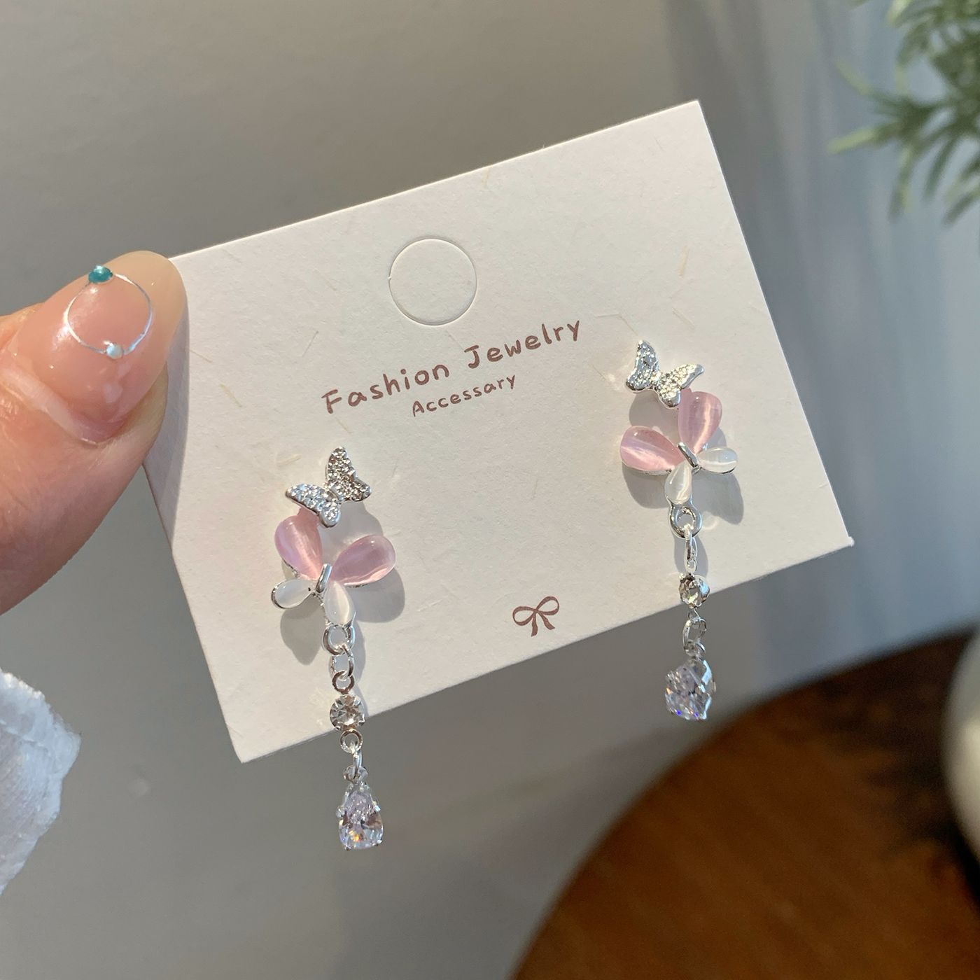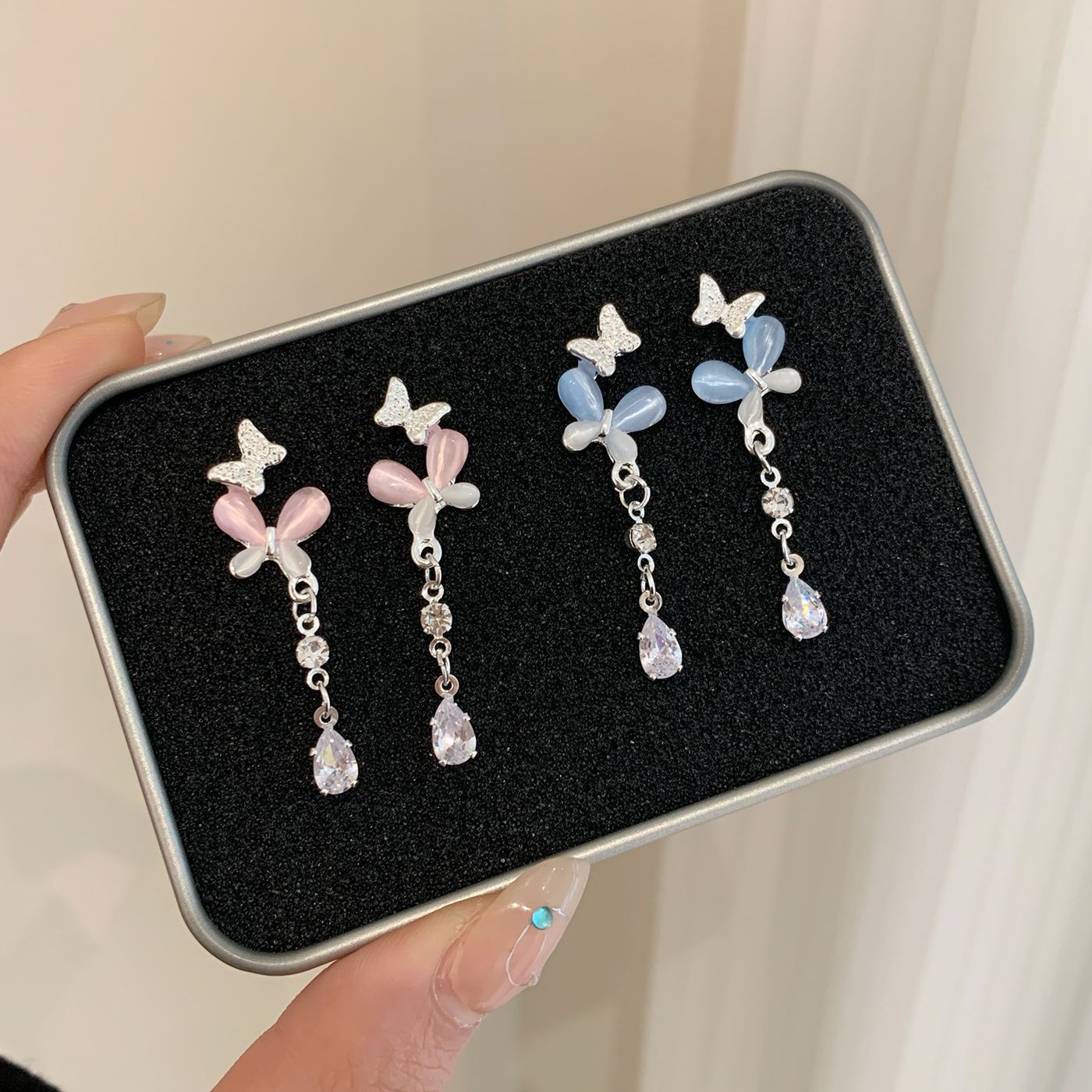韩版轻奢粉蓝蝴蝶猫眼石耳环女银针长款吊坠流苏气质高级感耳饰