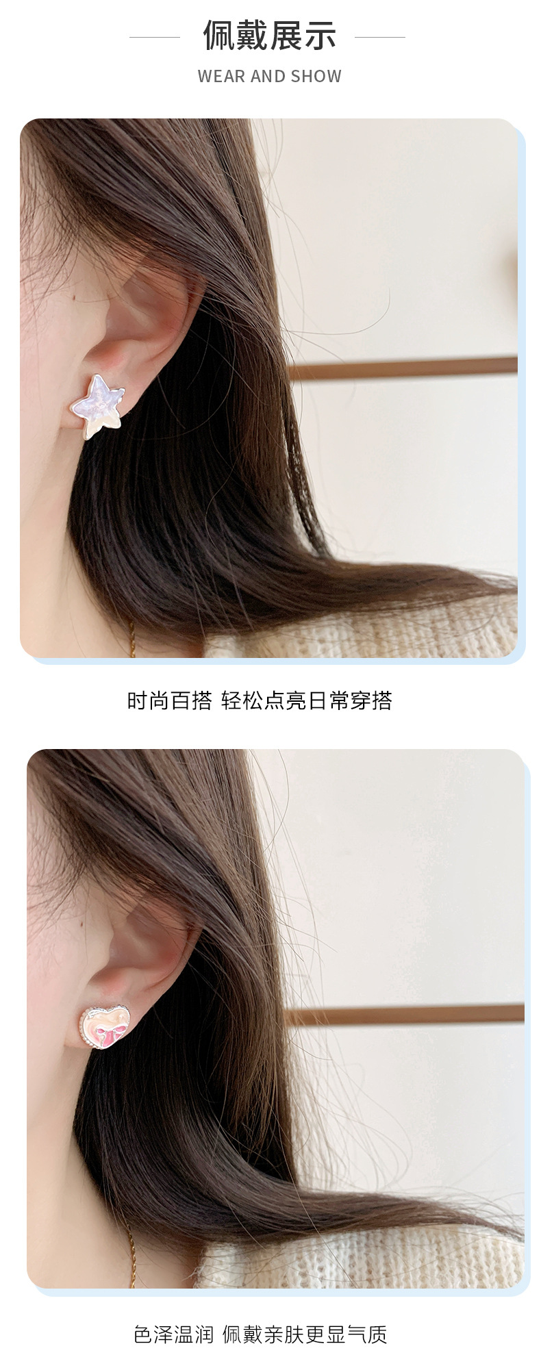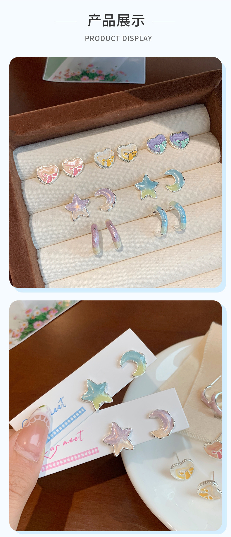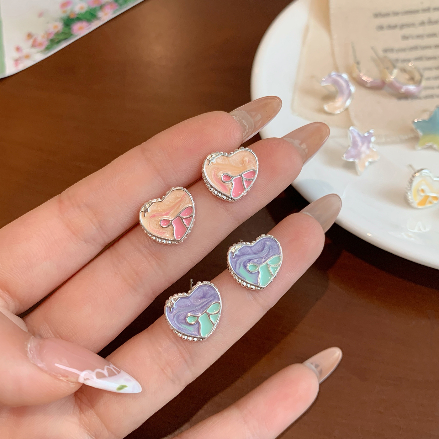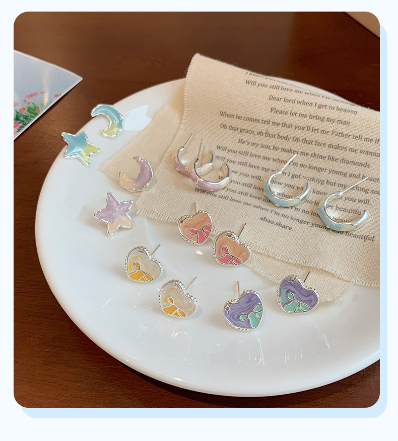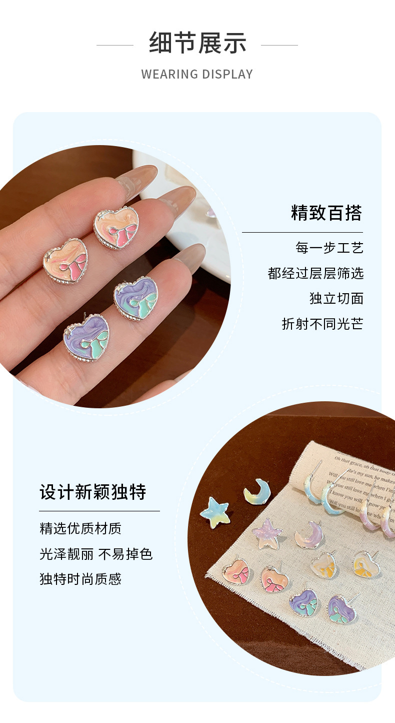 新款滴油炫彩晕染爱心蝴蝶结C圈耳钉女银针星星甜美精致百搭耳饰