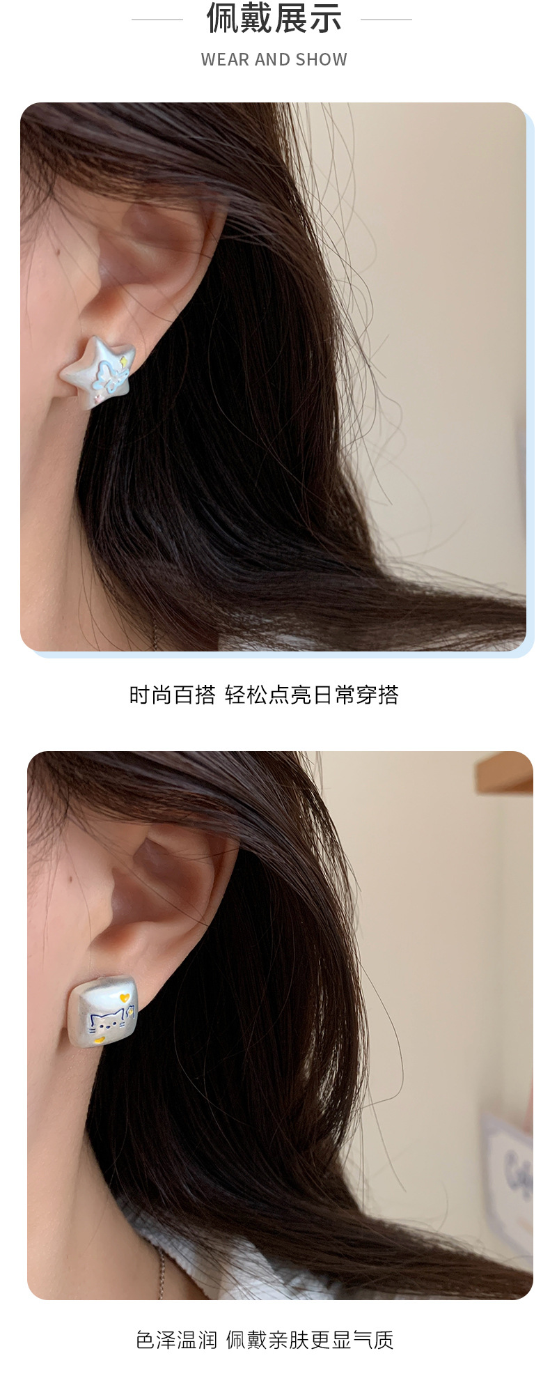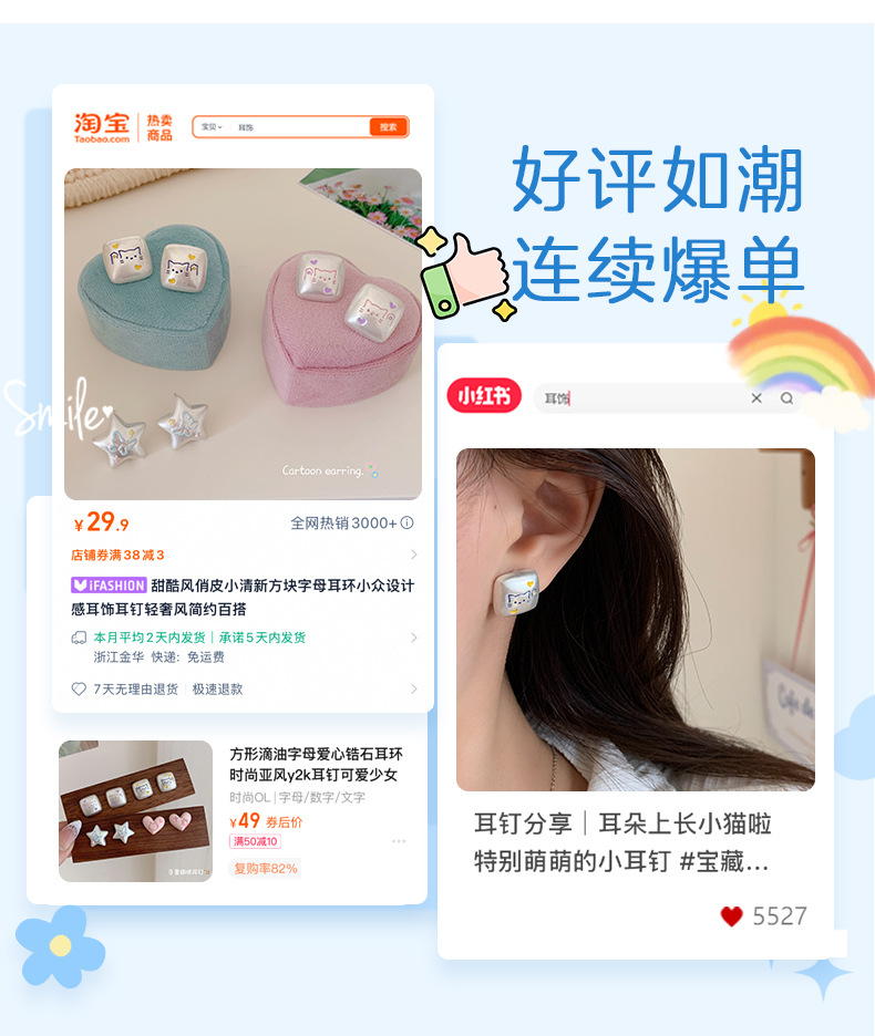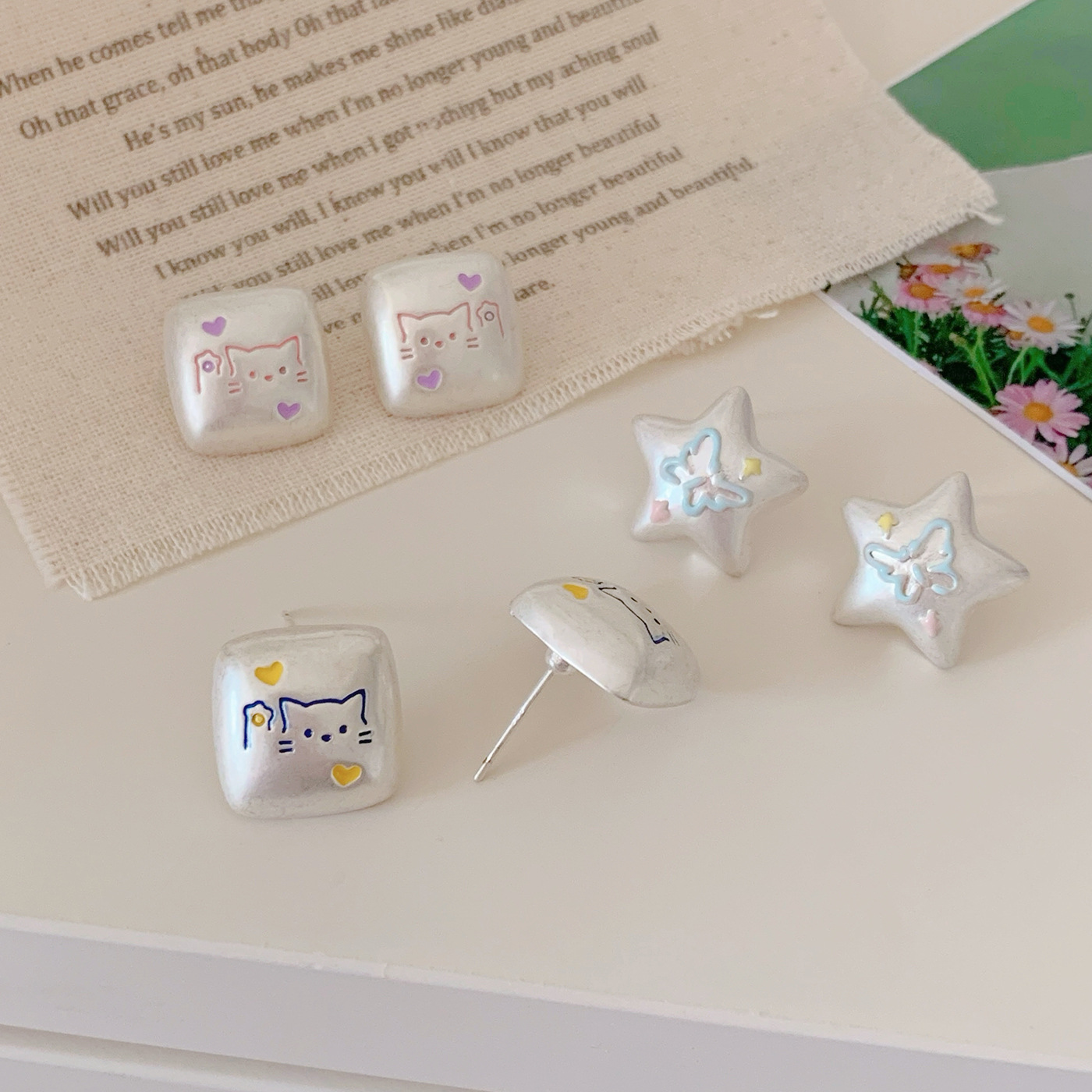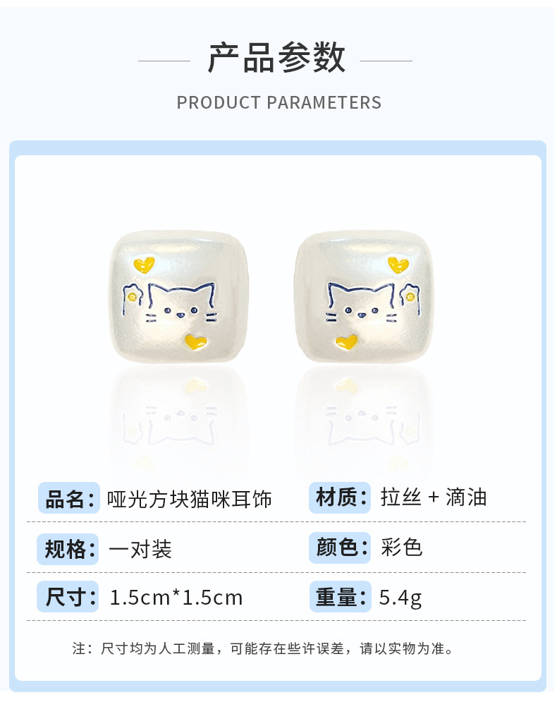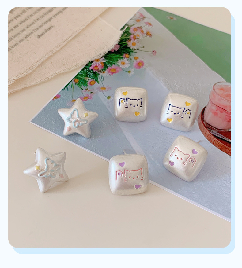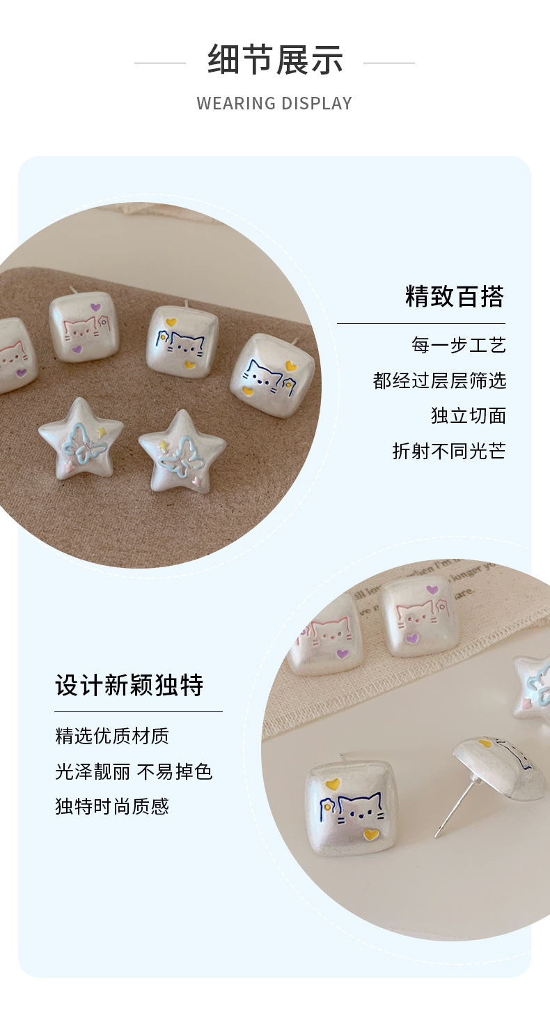 银色亚银方块涂鸦可爱猫咪耳钉女银针小众高级感五角星蝴蝶耳环