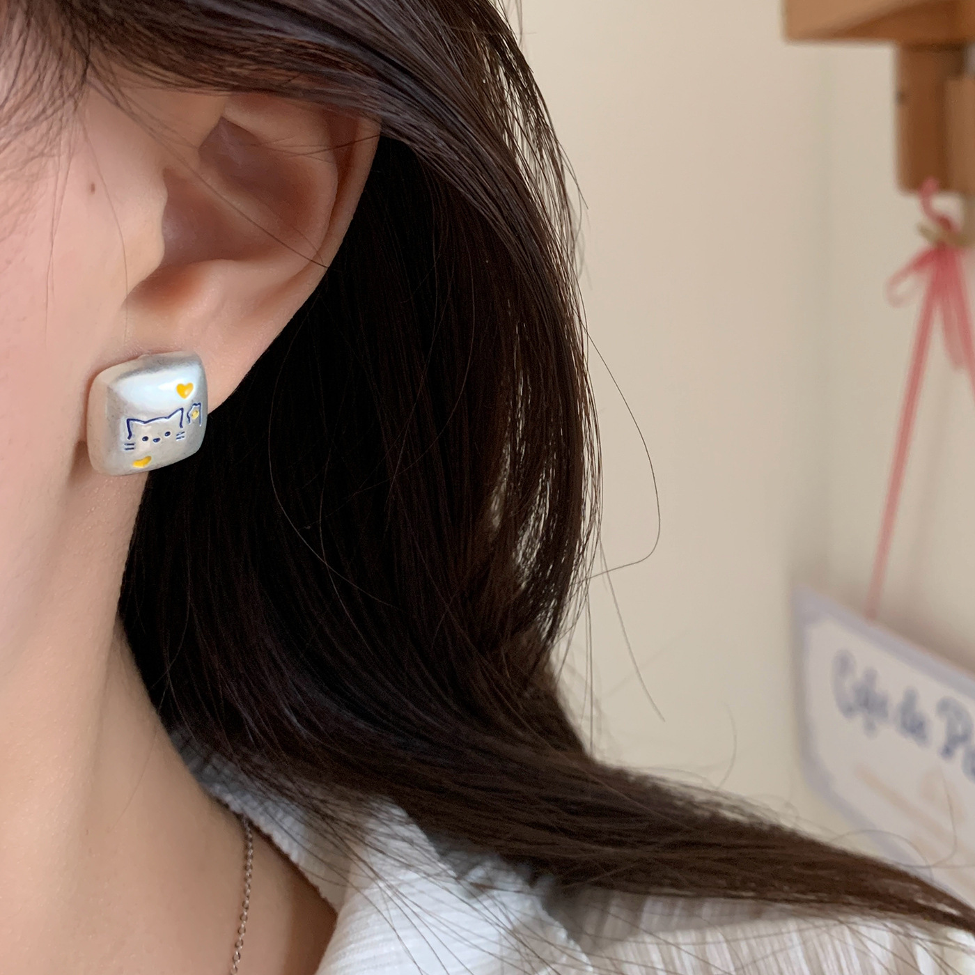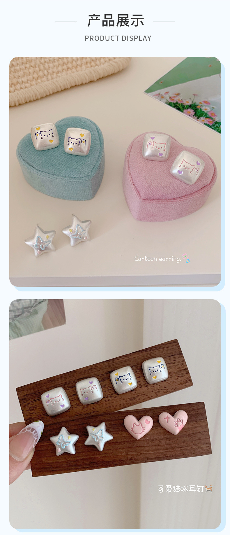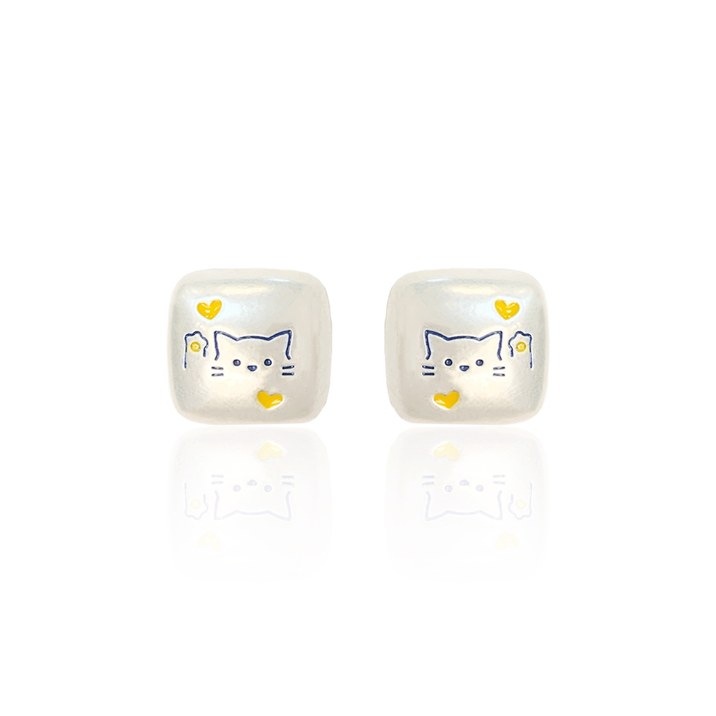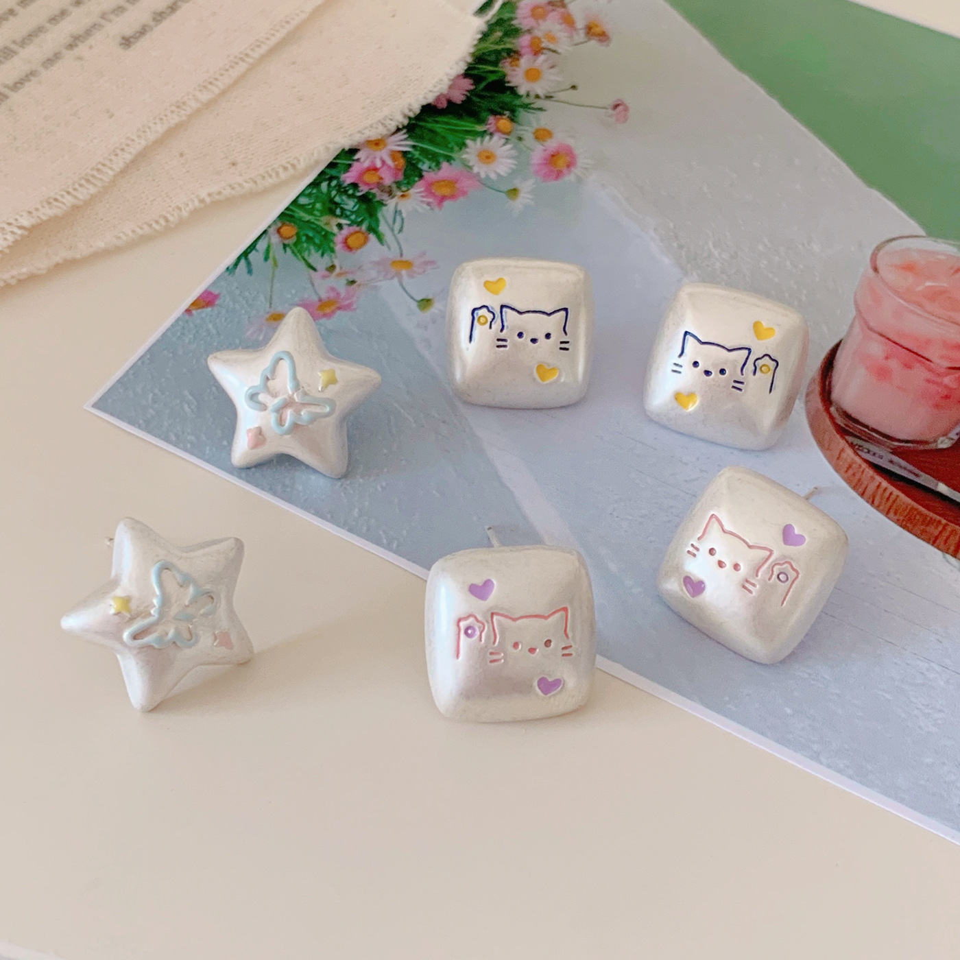 银色亚银方块涂鸦可爱猫咪耳钉女银针小众高级感五角星蝴蝶耳环