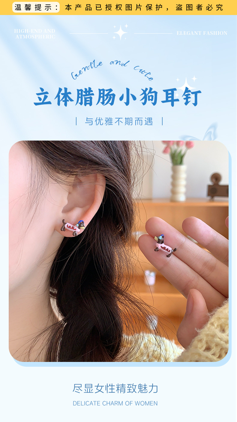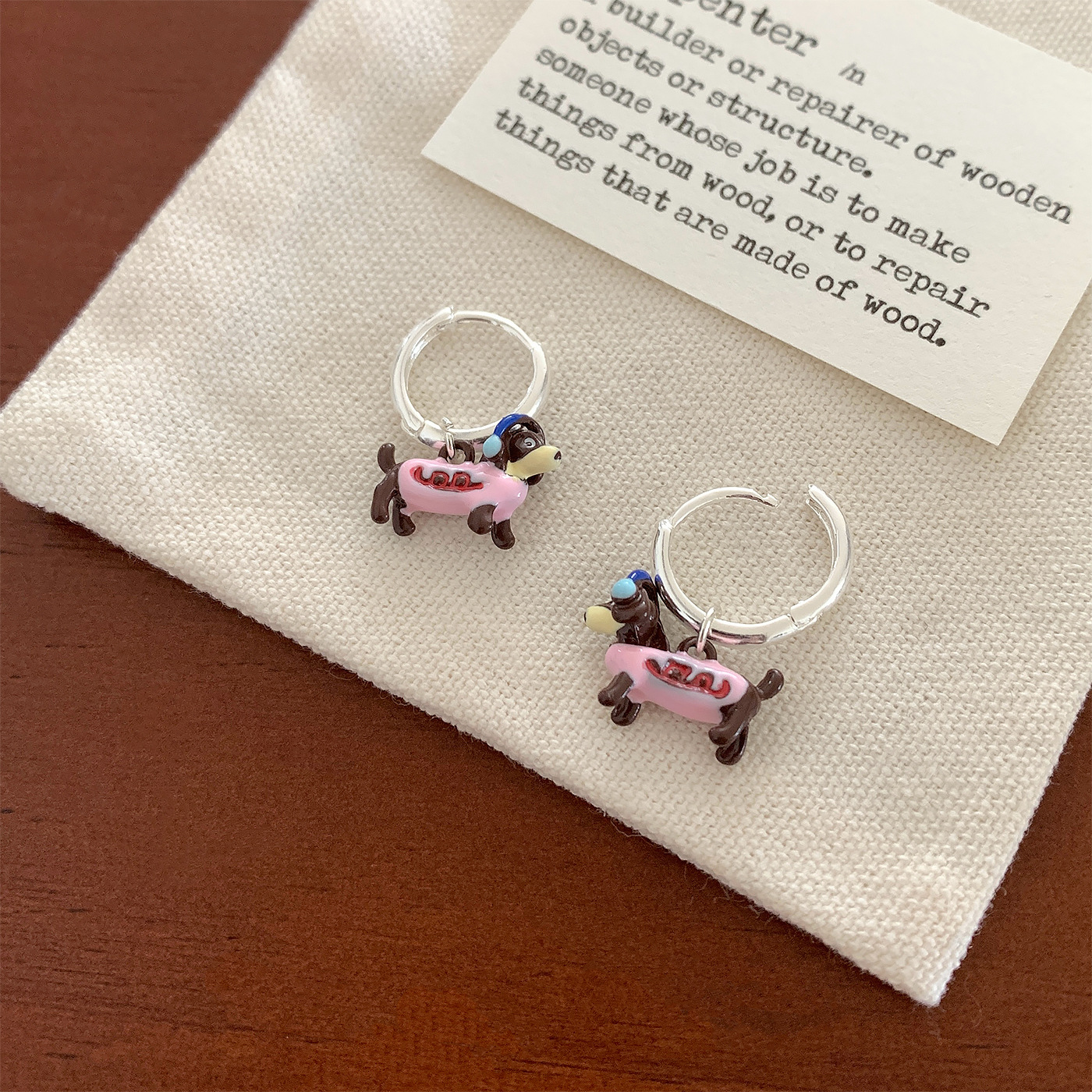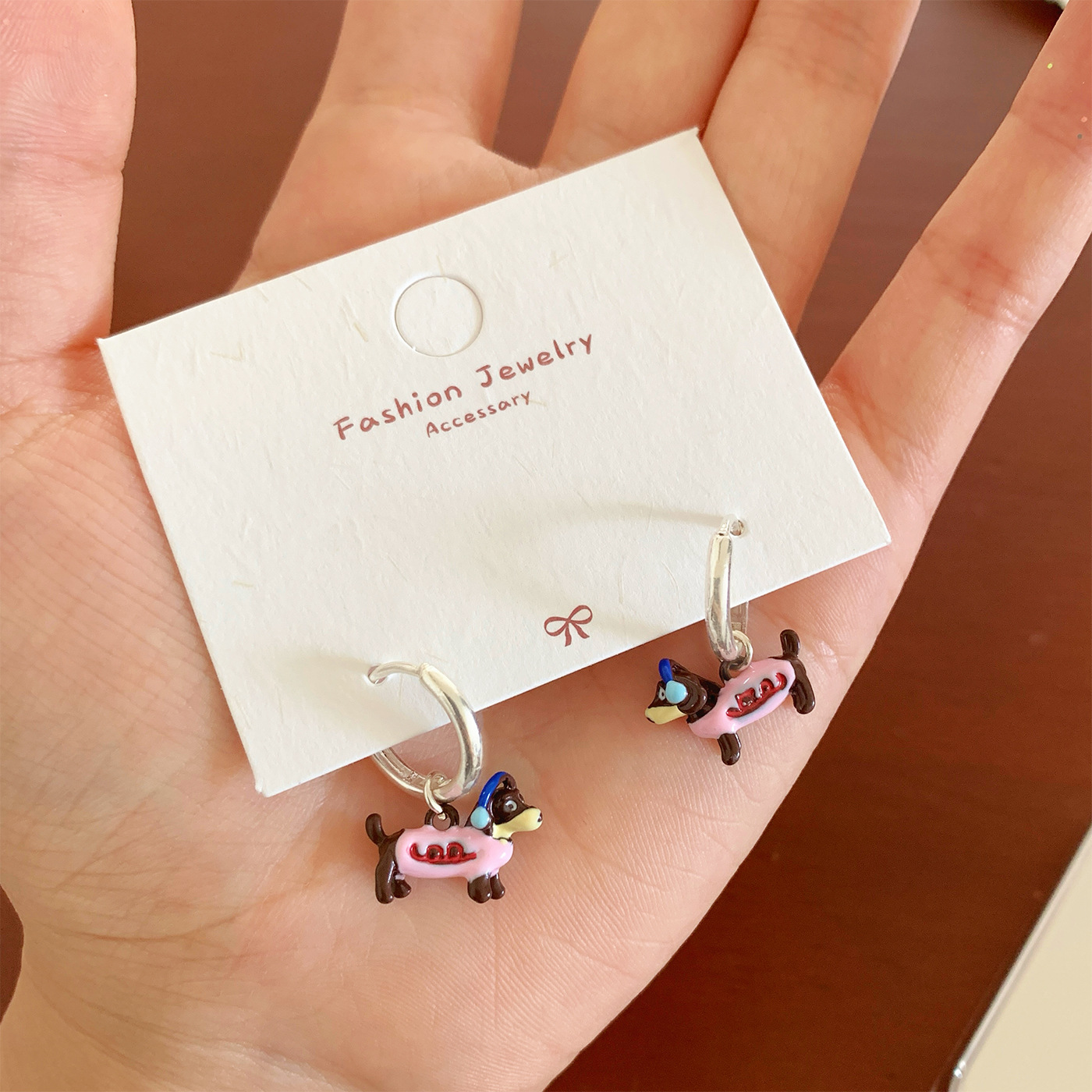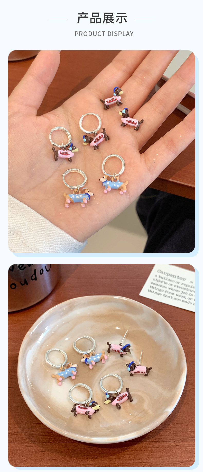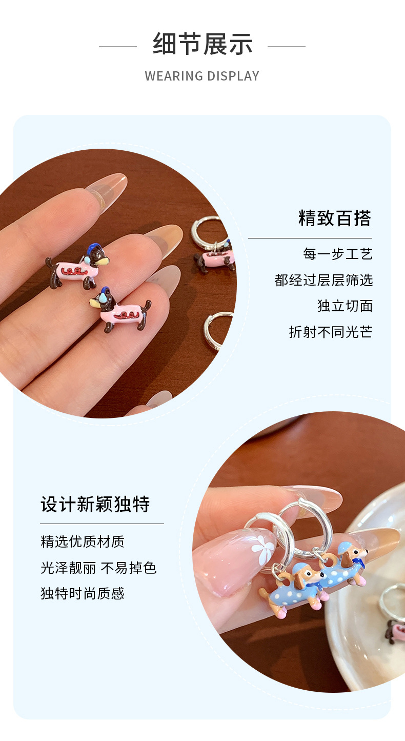 新款卡通彩色滴油腊肠狗耳扣女可爱精致小众设计感童趣学生耳饰