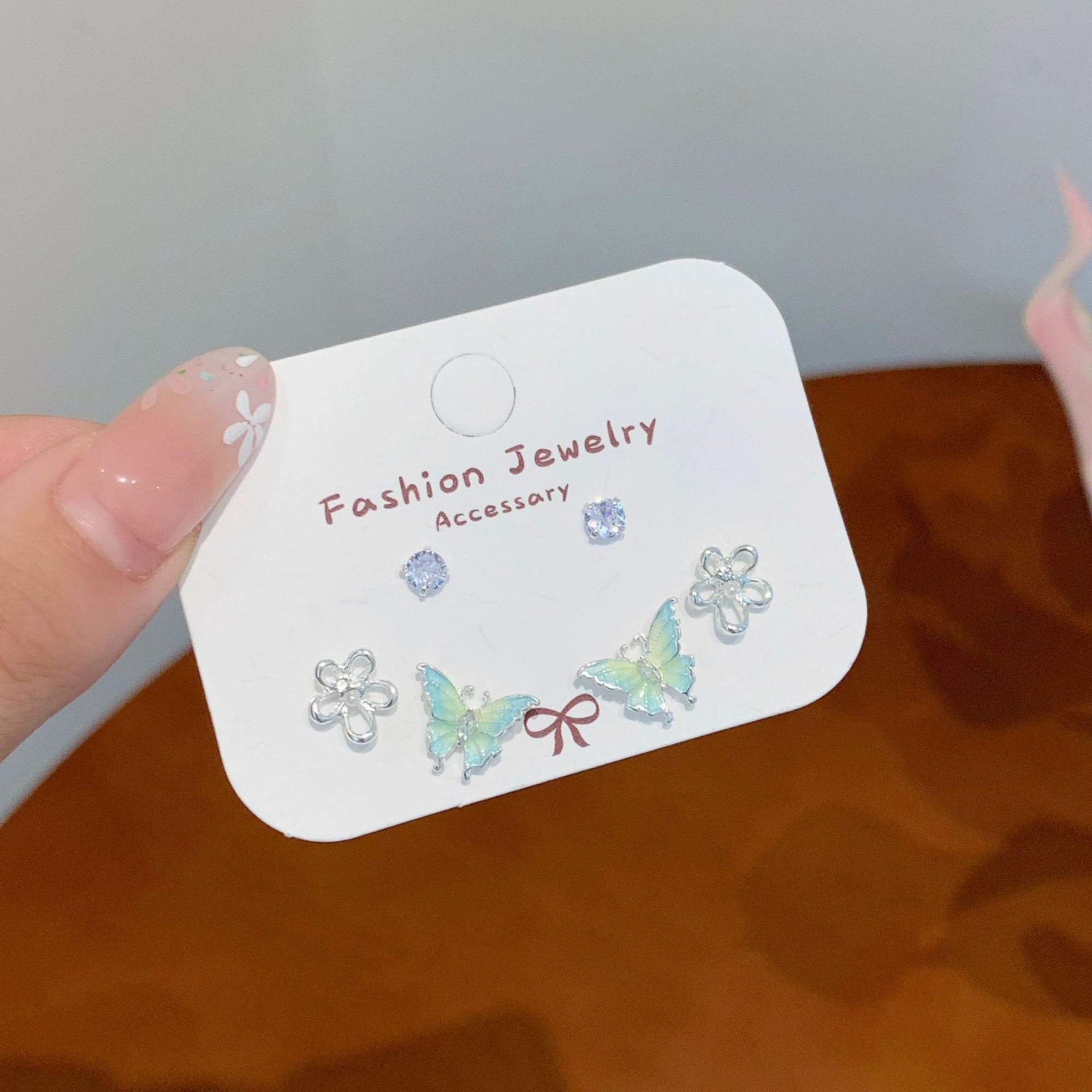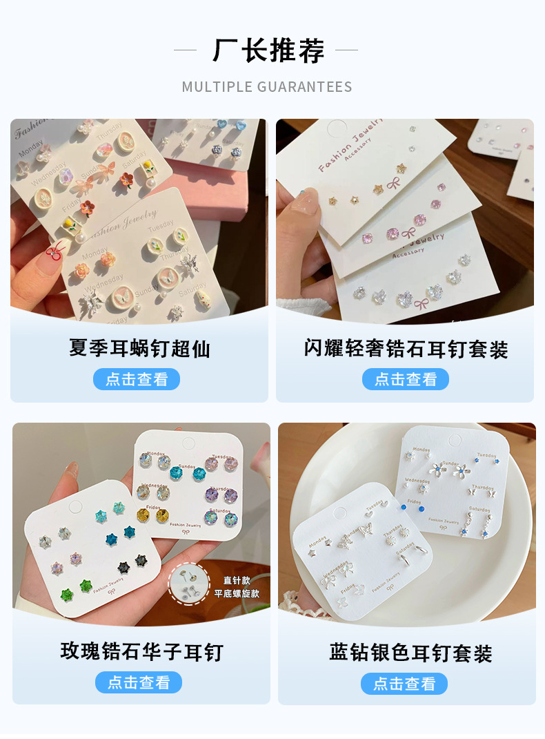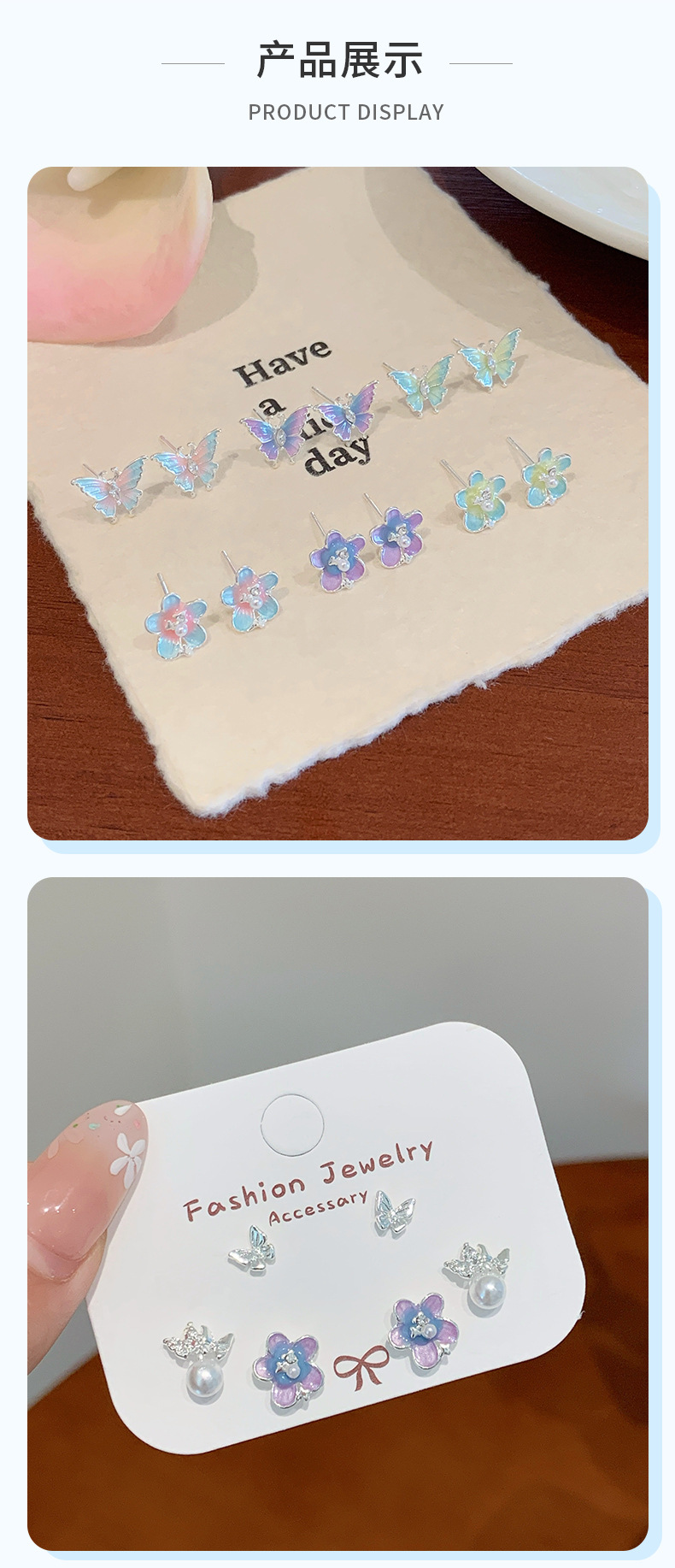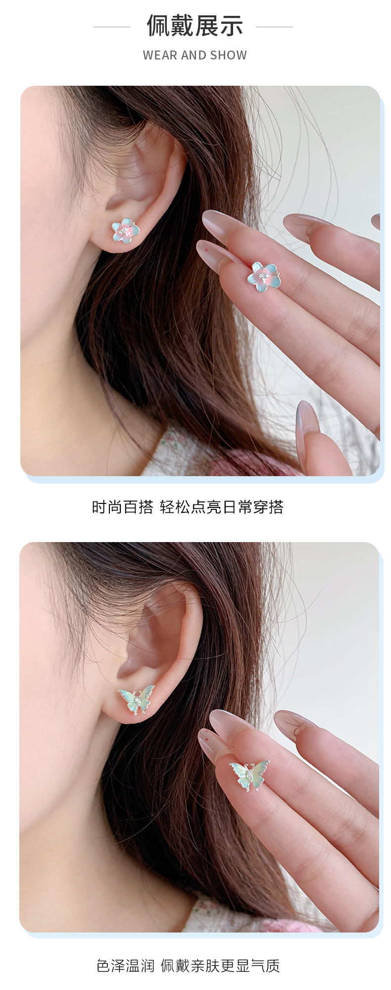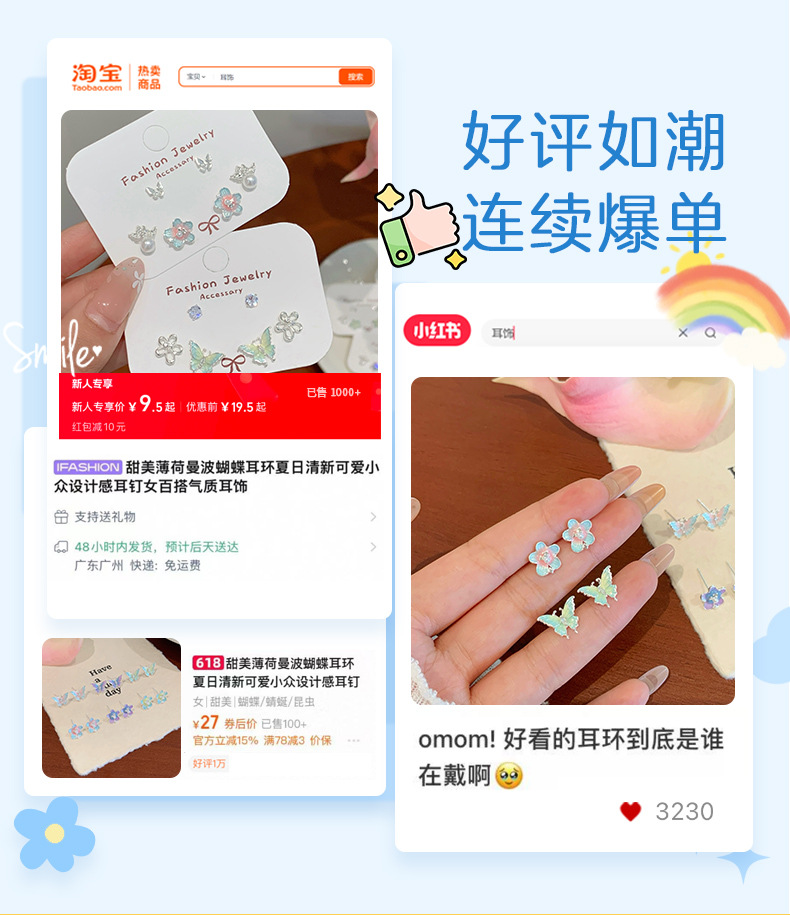 夏日甜美薄荷曼波蝴蝶耳环套装女银针小清新花朵小众轻奢百搭耳饰