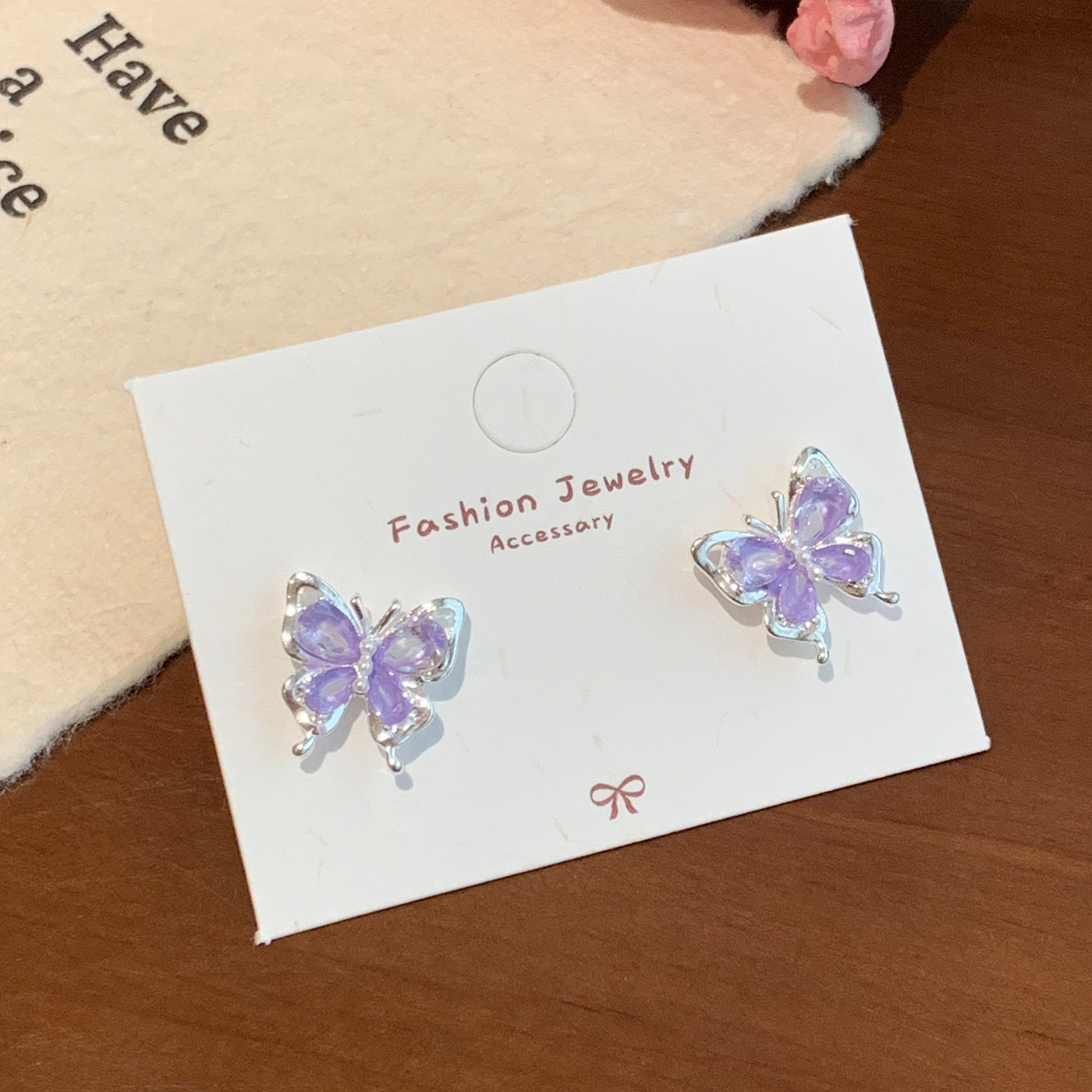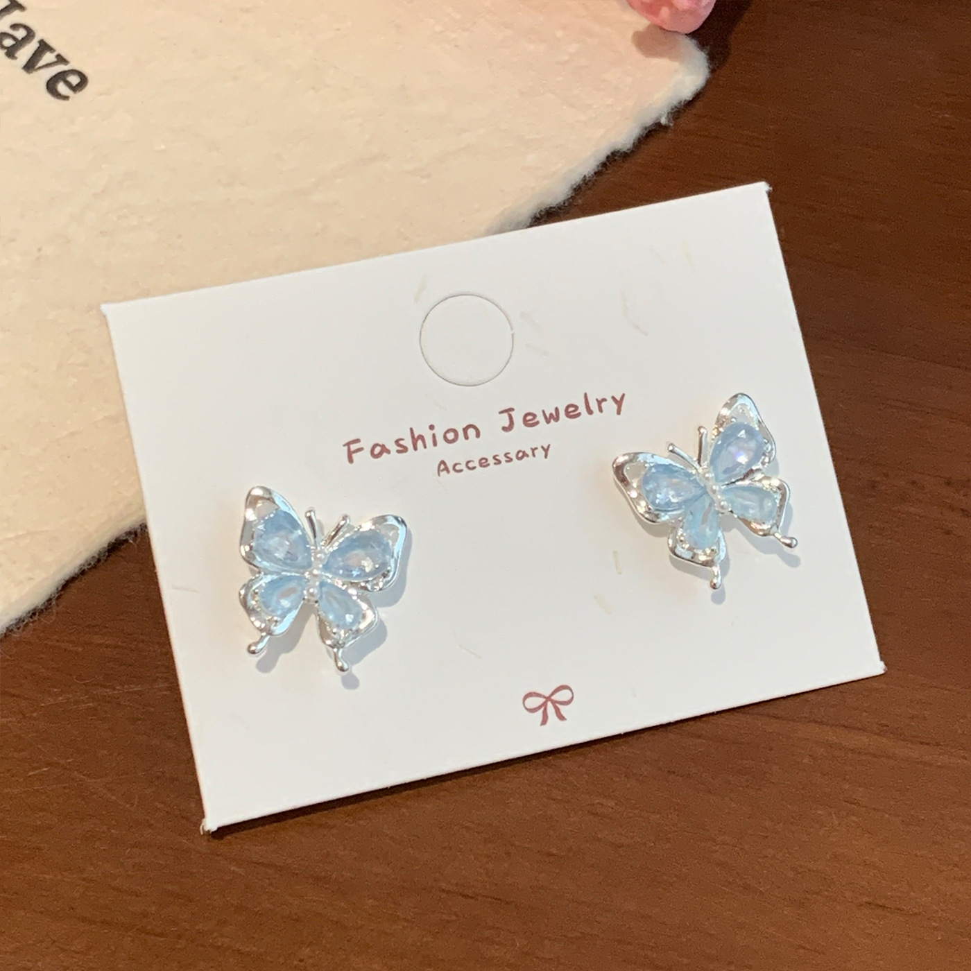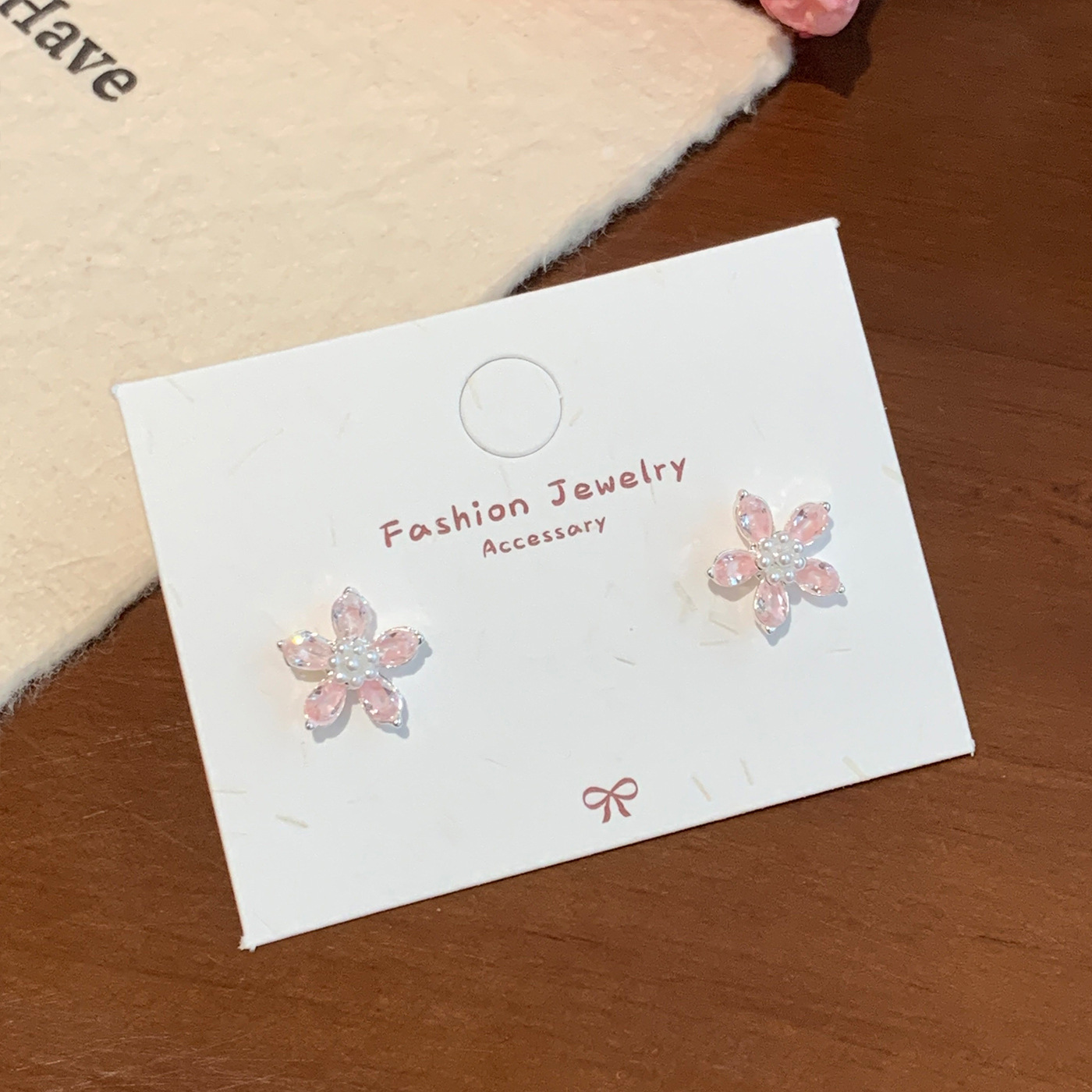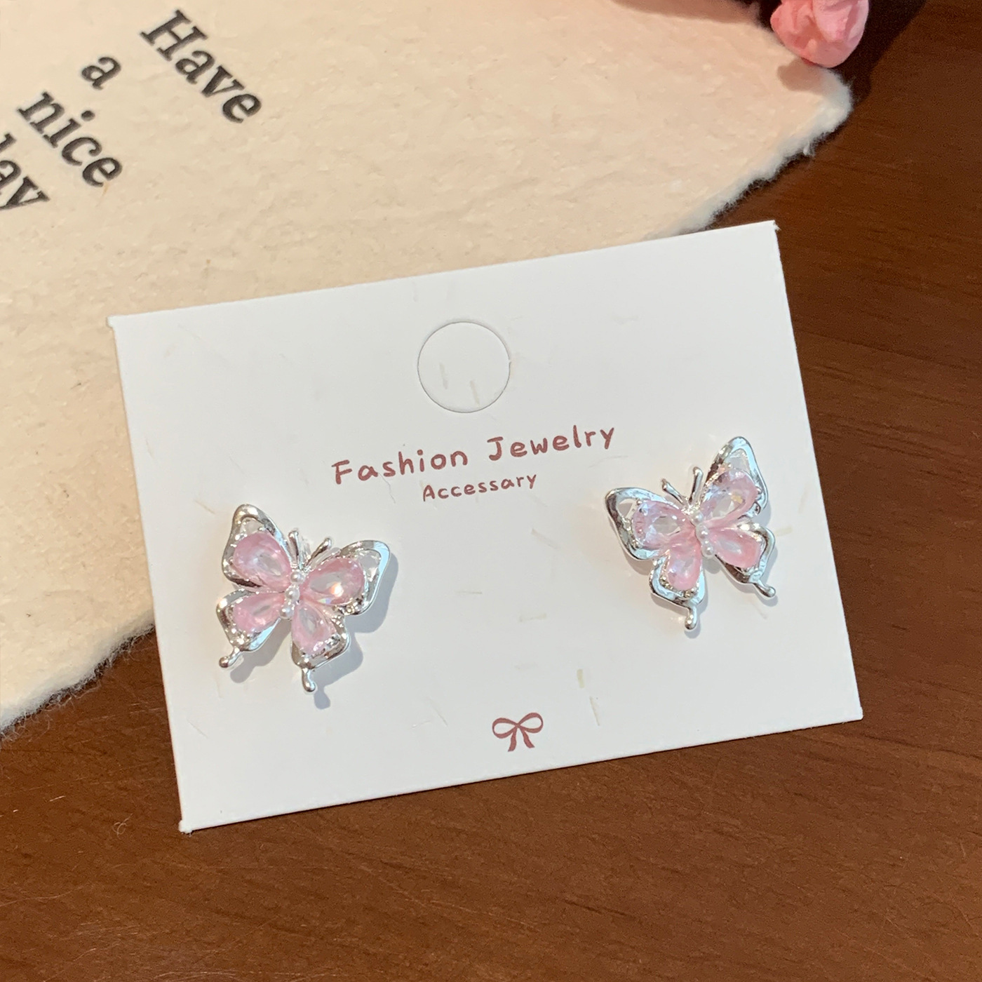 韩版新款轻奢冰晶锆石蝴蝶耳钉女银针彩色花朵气质精致珍珠耳饰