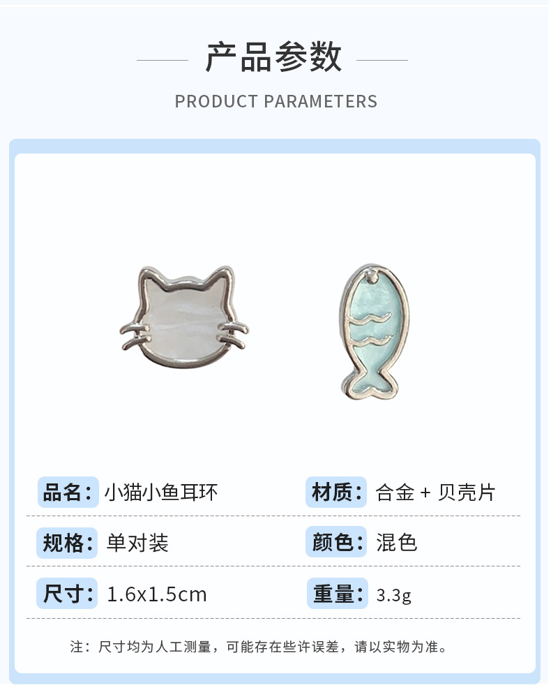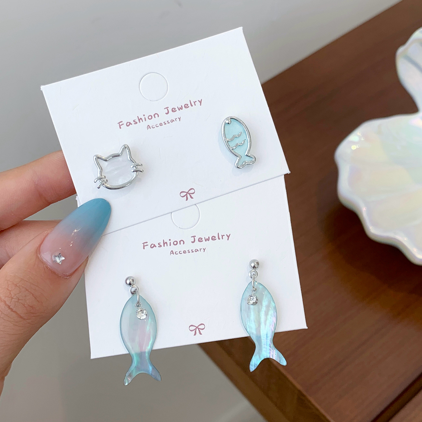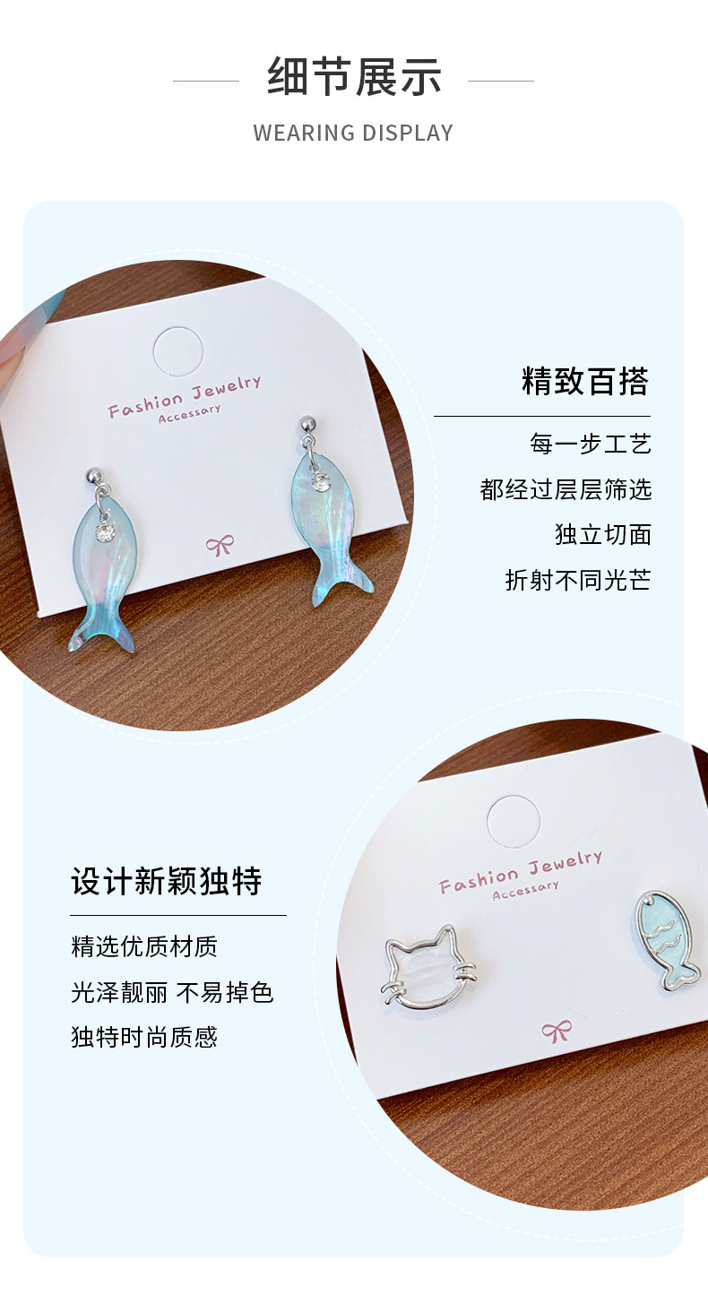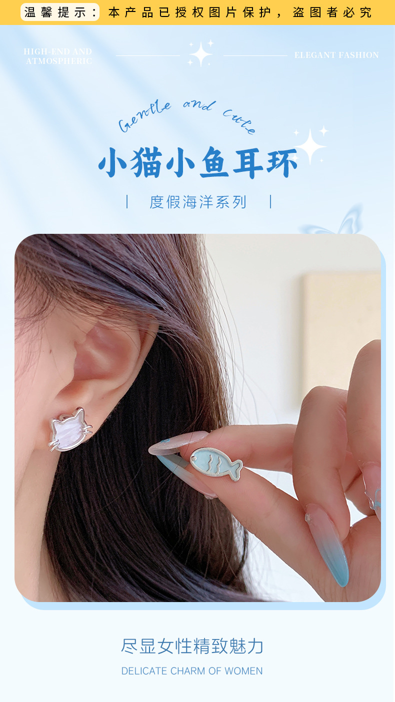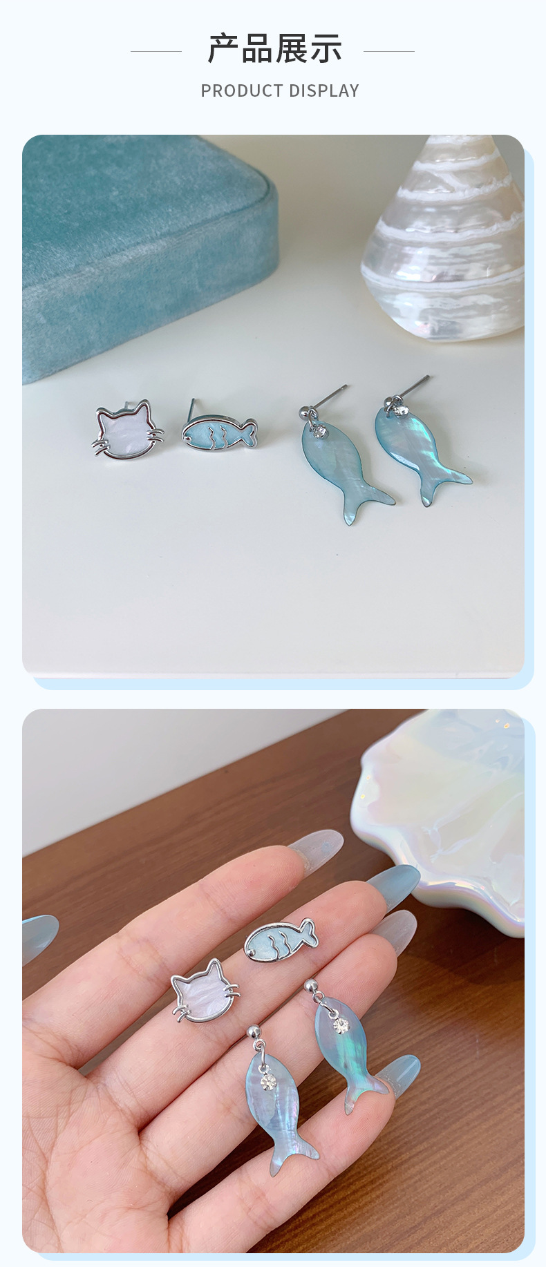 海洋蓝色贝母镭射猫咪小鱼耳环女银针简约清冷感可爱卡通清新耳饰