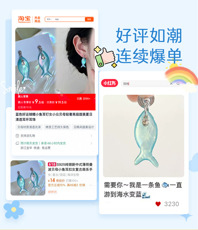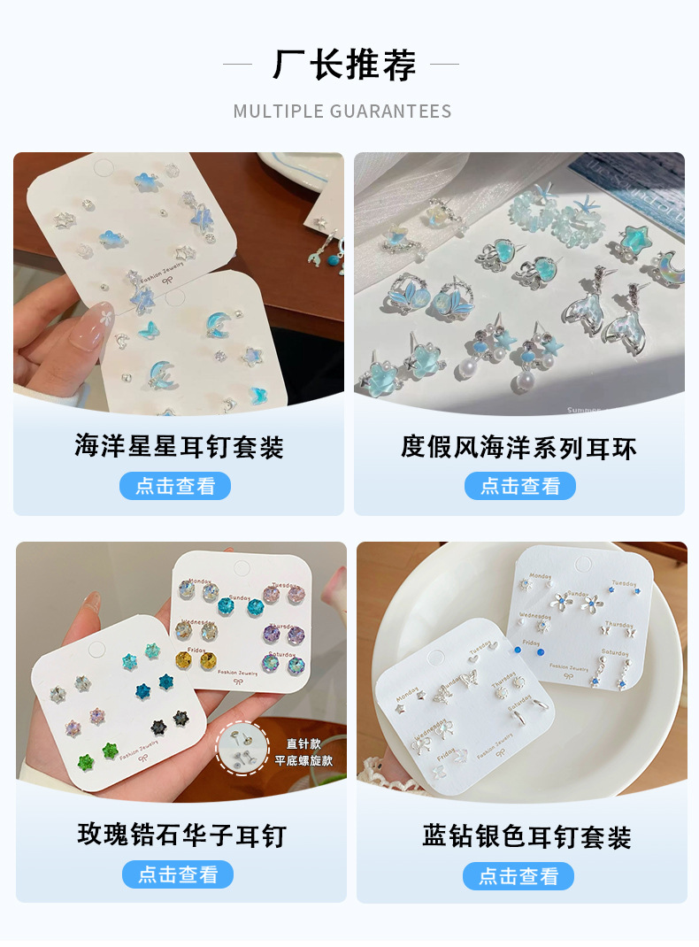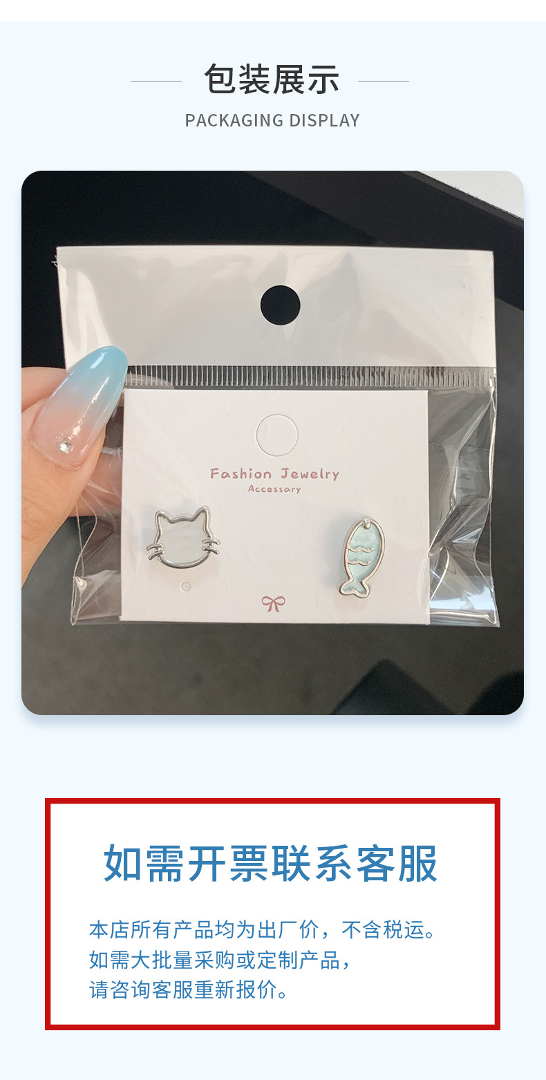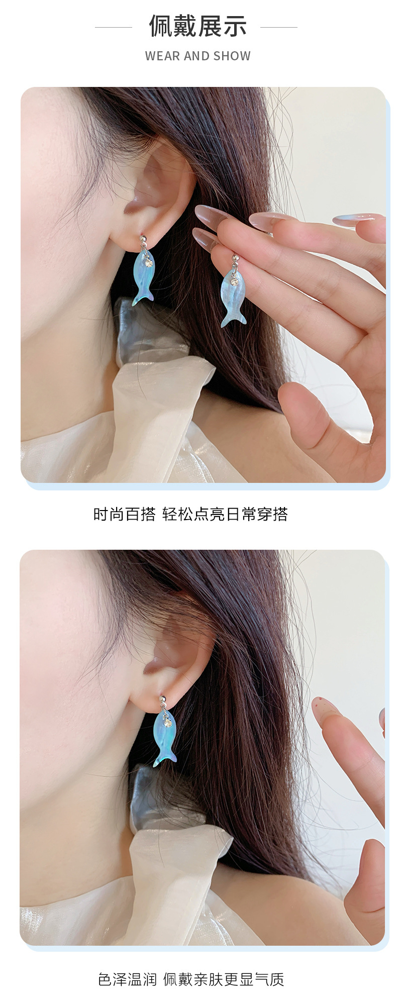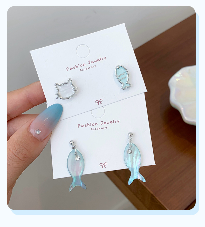 海洋蓝色贝母镭射猫咪小鱼耳环女银针简约清冷感可爱卡通清新耳饰