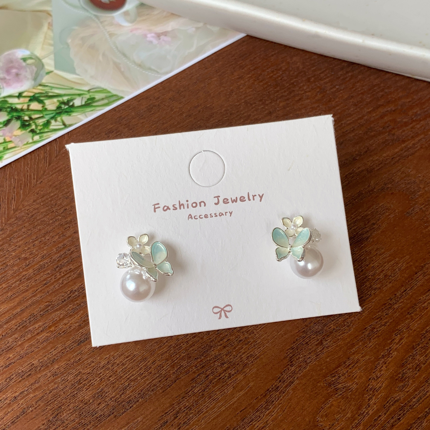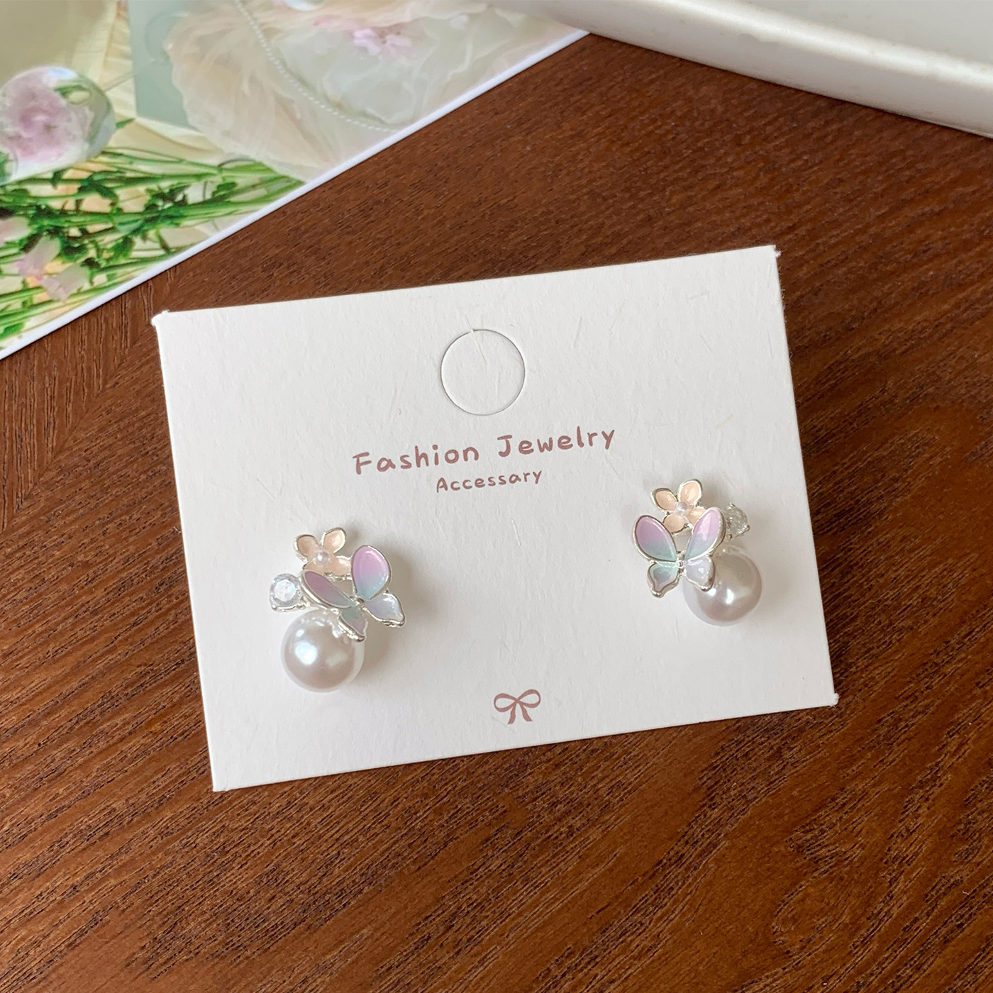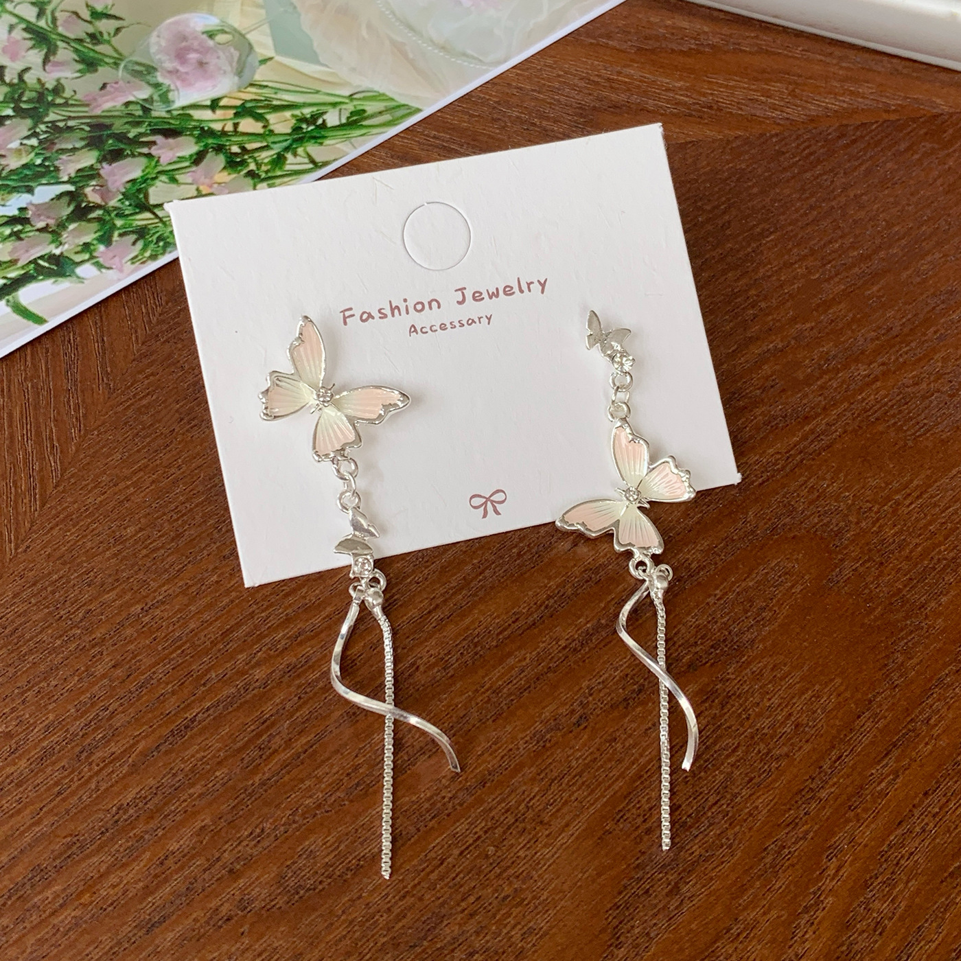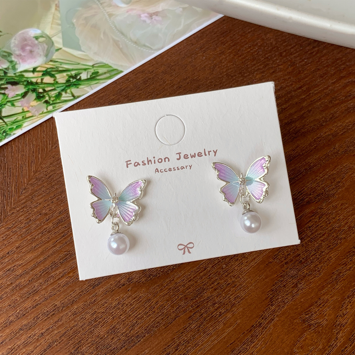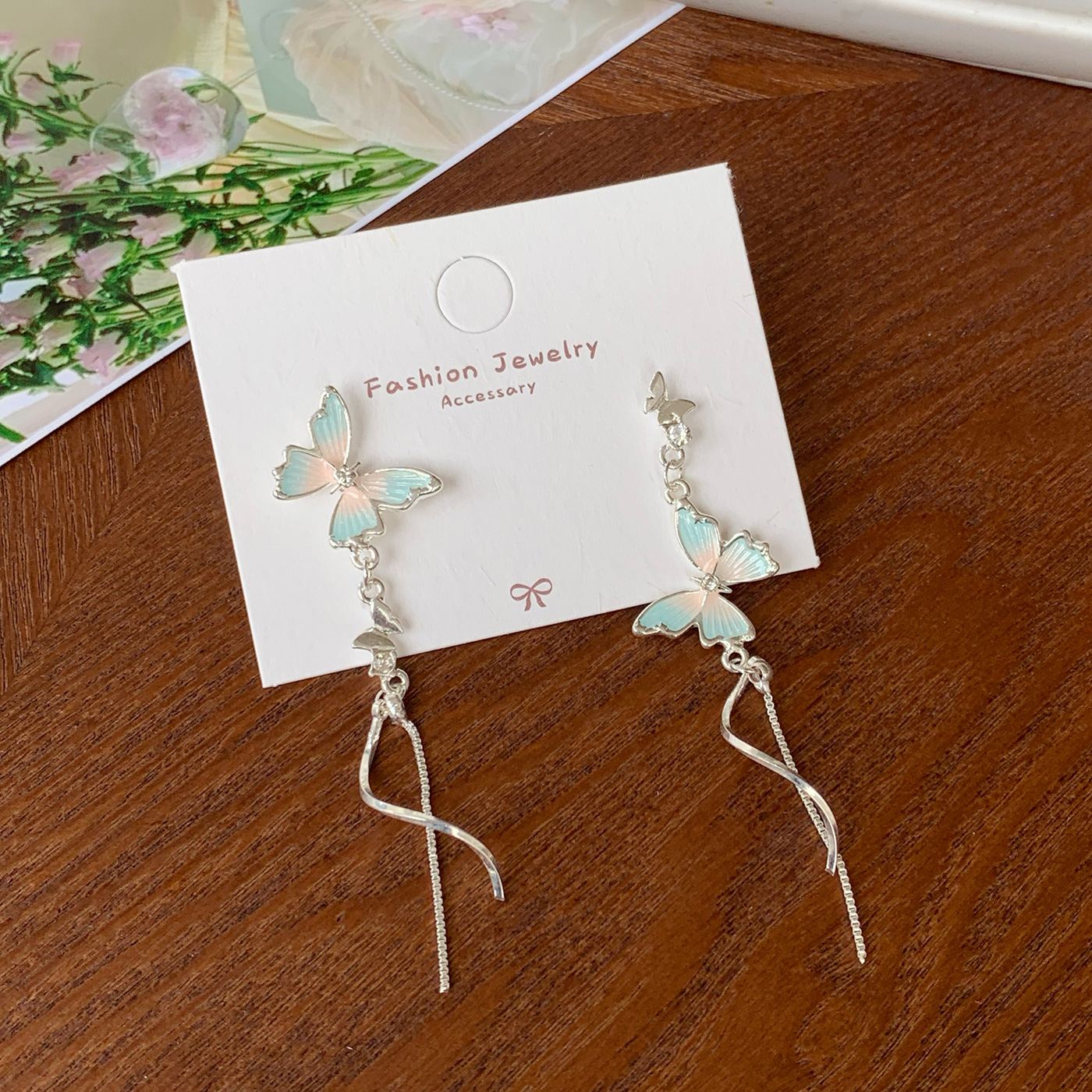 韩版梦幻渐变滴油蝴蝶珍珠流苏耳环女银针气质长款设计感立体耳饰