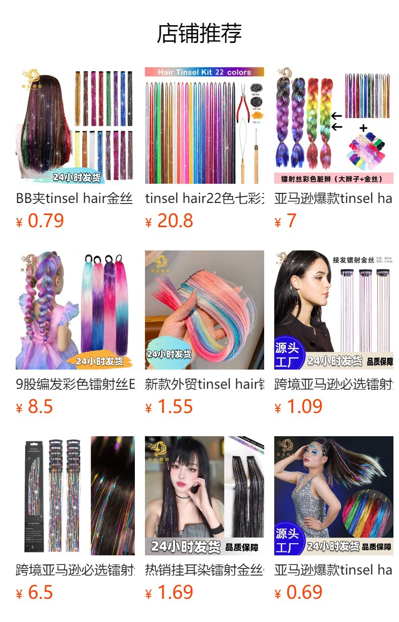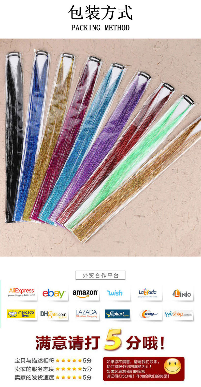 跨境必选欧美tinsel hair七彩接发金丝自产自销现货稳定PET镭射丝