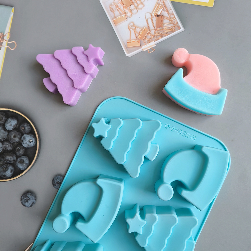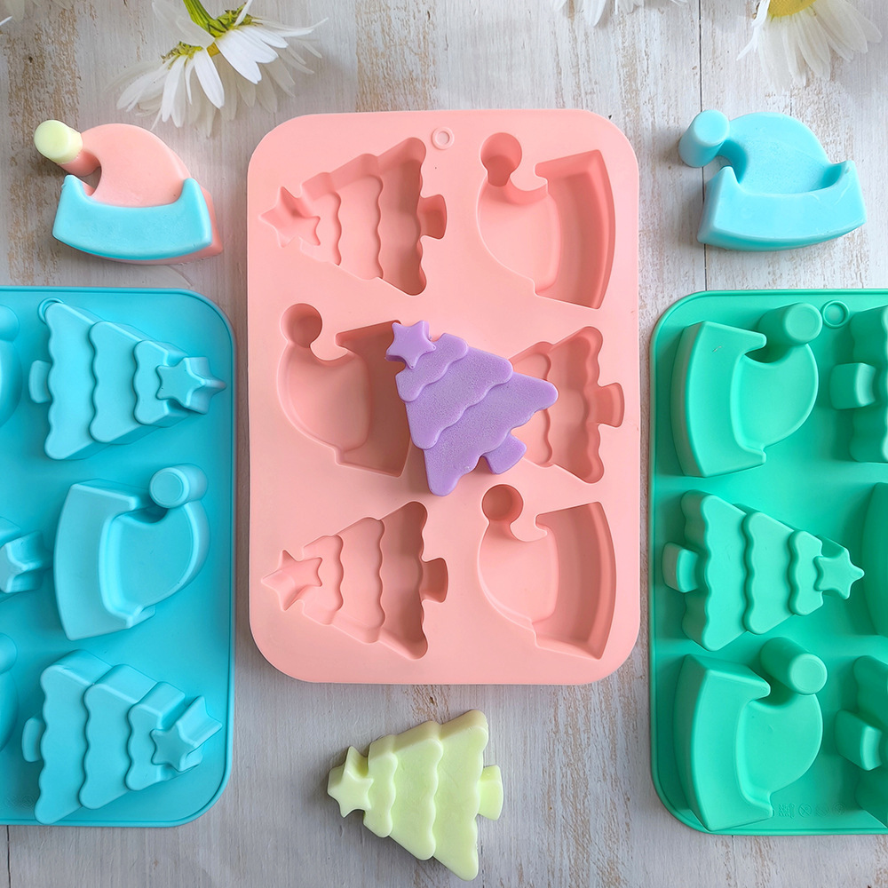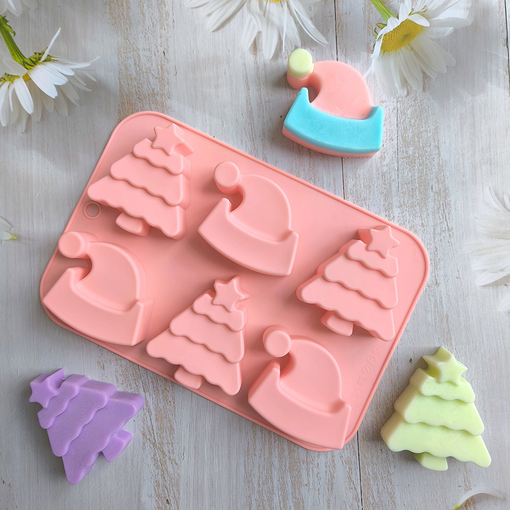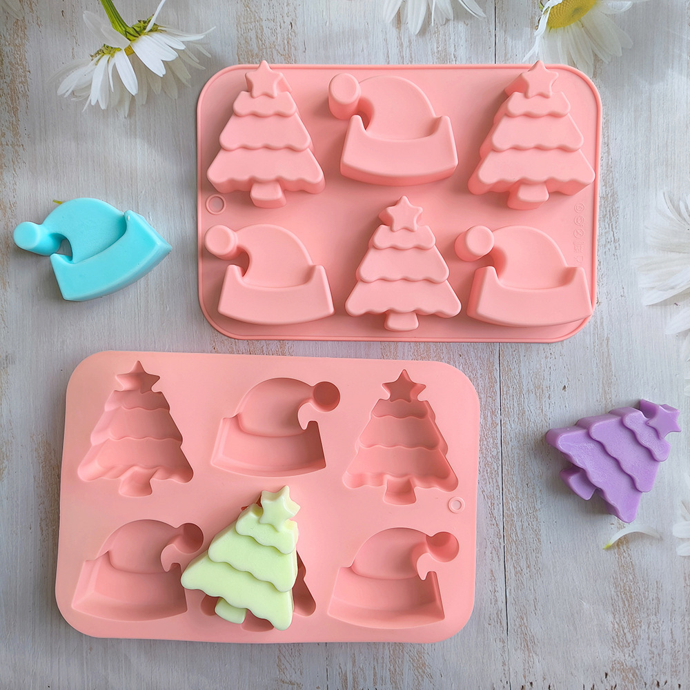 6连圣诞树帽子754蛋糕模具硅胶烤盘,3D圣诞帽形状饼干巧克力模具