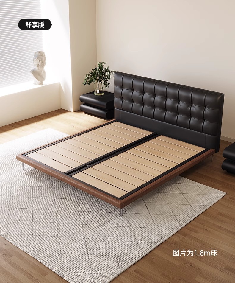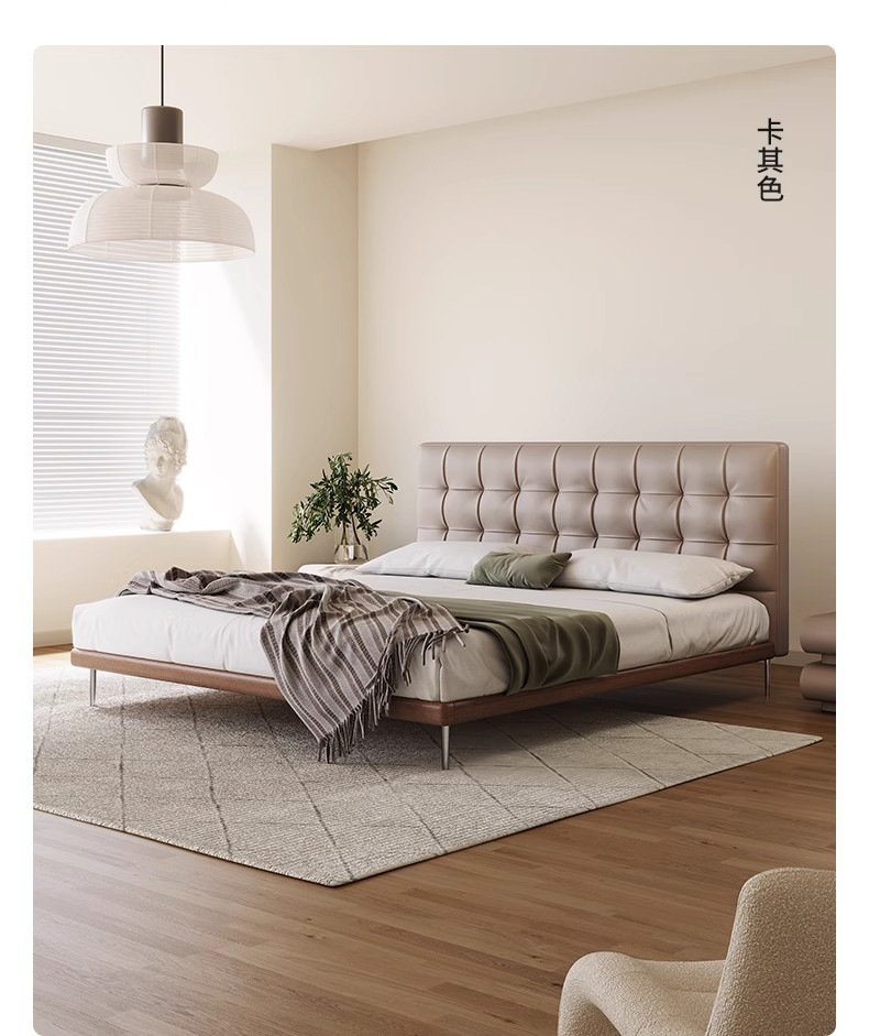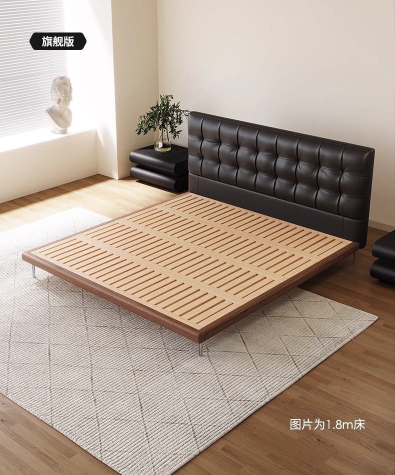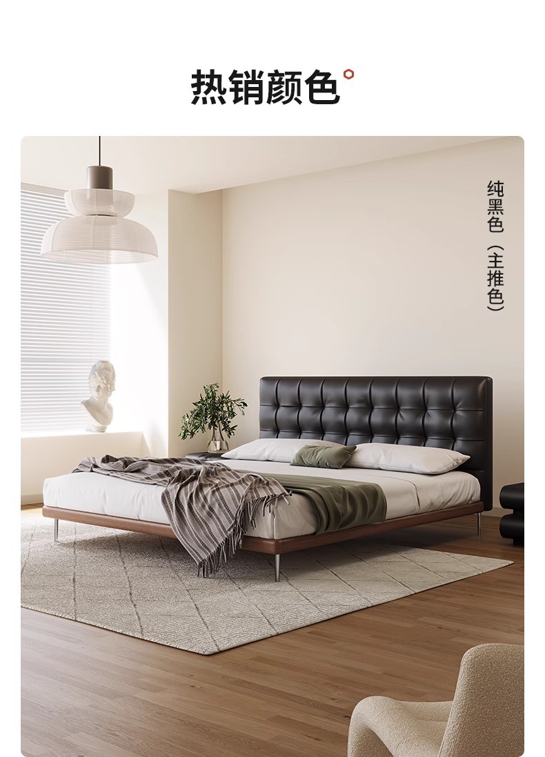 中古风实木真皮床头层牛皮华夫格意式极简复古软包大床薄床头婚床