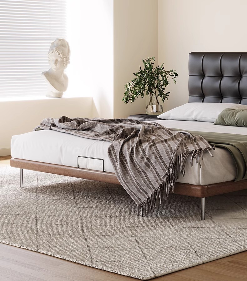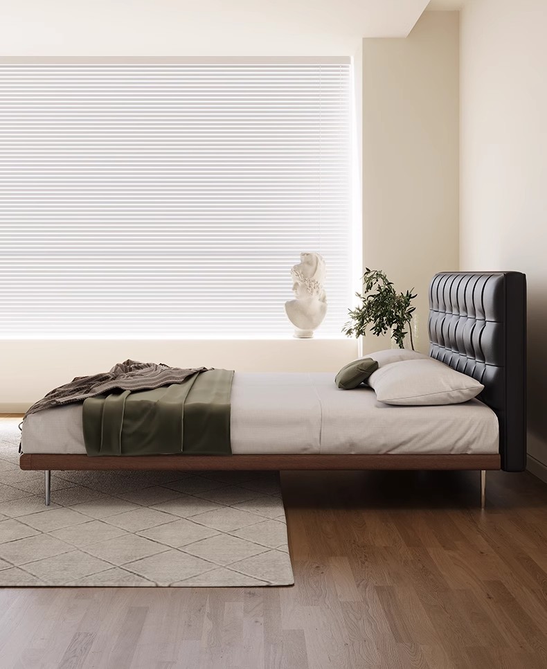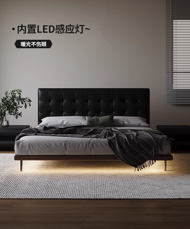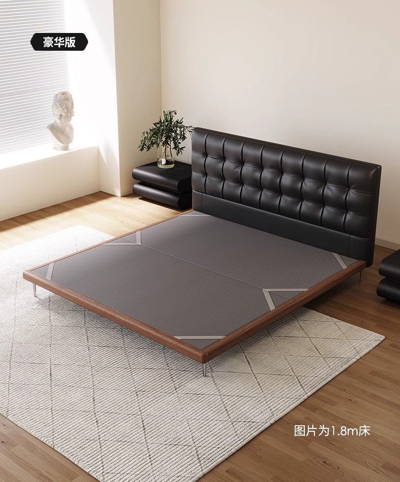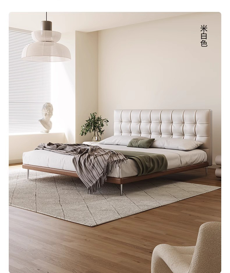 中古风实木真皮床头层牛皮华夫格意式极简复古软包大床薄床头婚床
