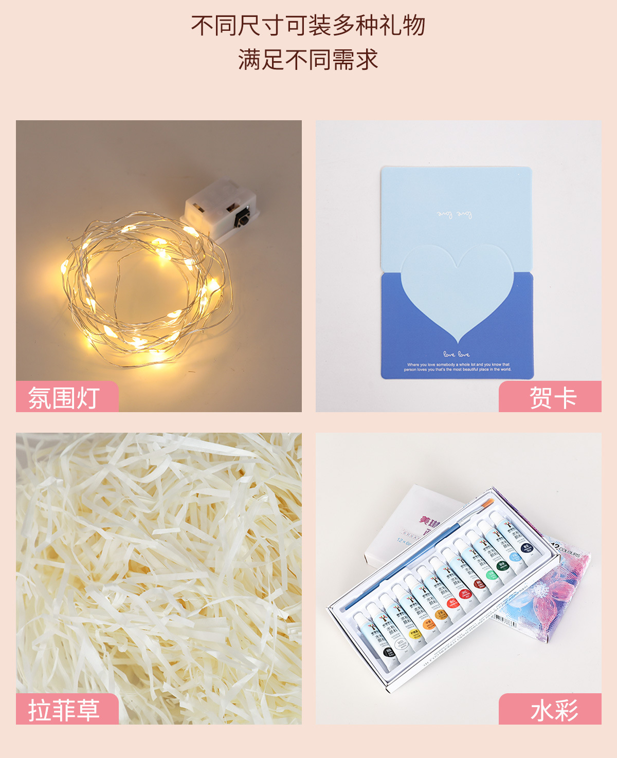 | box 2 + greeting card + raffia + light(二号箱+贺卡+拉菲草+灯) | USD $3.14 | 99556 piece available |