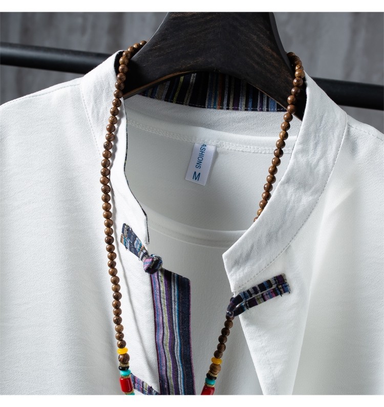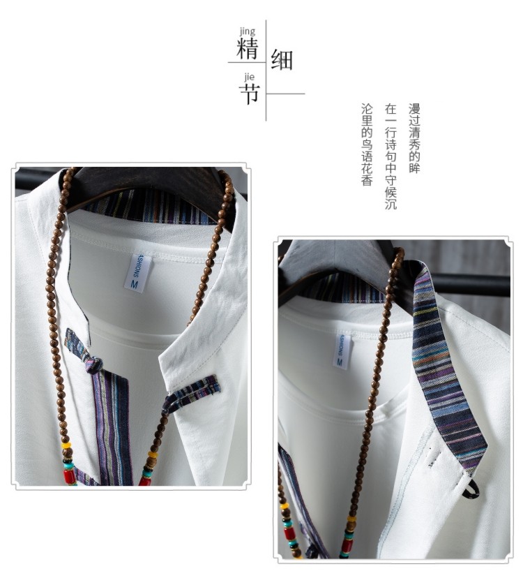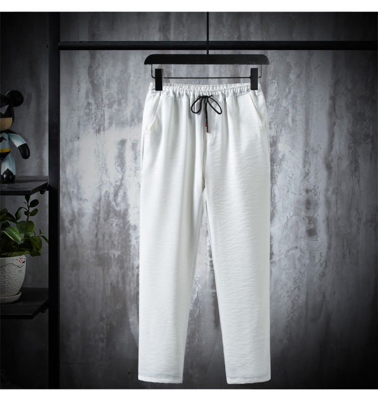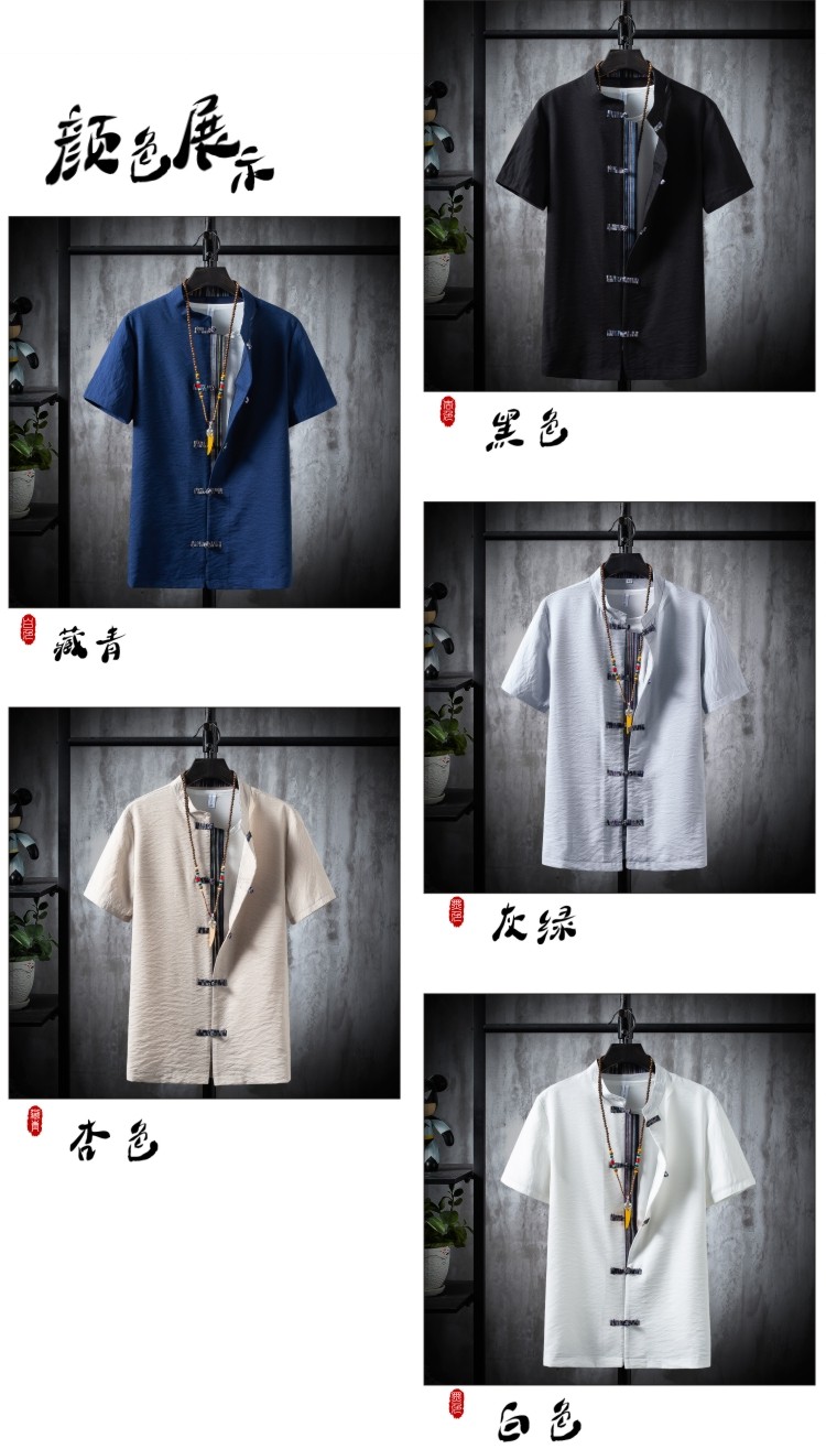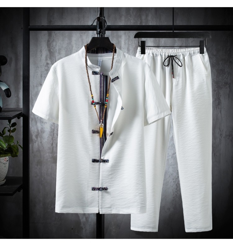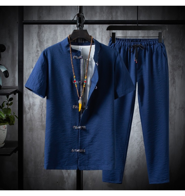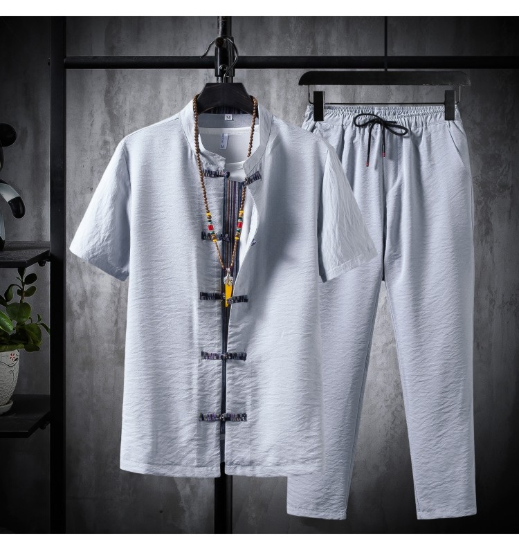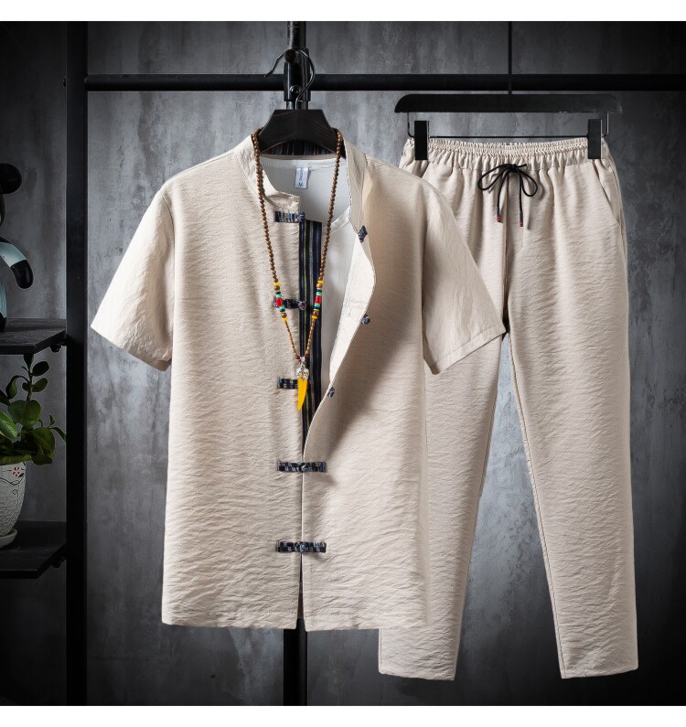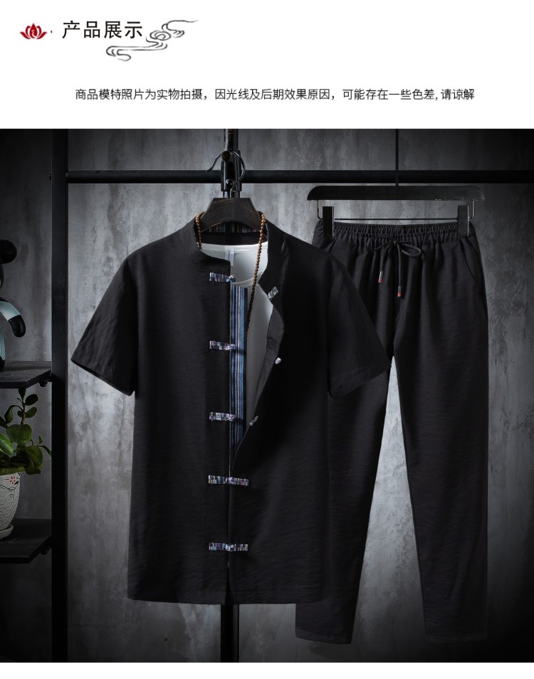 冰丝夏季中国风新款男士棉麻短袖T恤大码长裤套装休闲纯色套装男