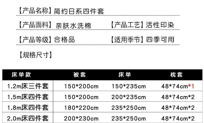 | 1.5 fitted sheet four-piece suit: quilt cover 200x230♜⚑♜(1.5床笠四件套:被套200x230♜⚑♜) | USD $25.3 | 7990 piece available |