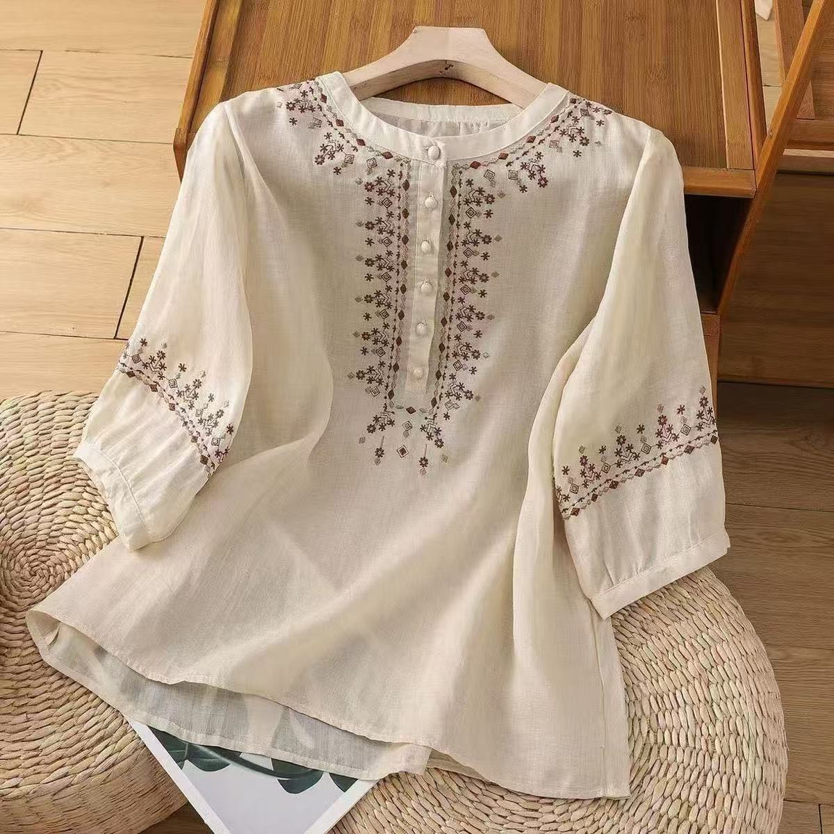 2025夏季新款棉麻衬衫女复古菱格刺绣套头款气质休闲套头小衫