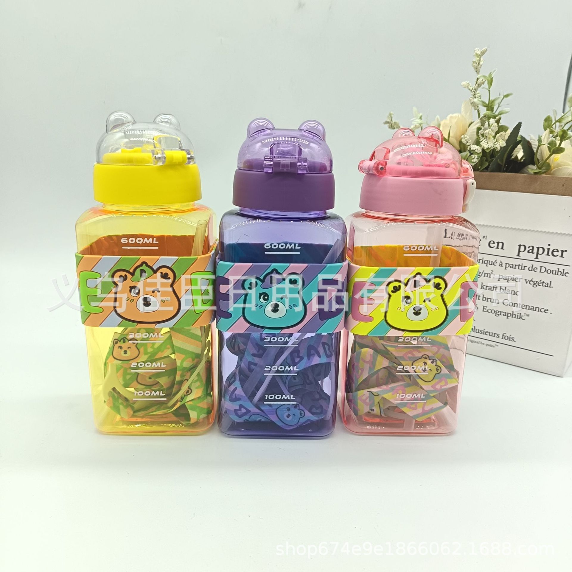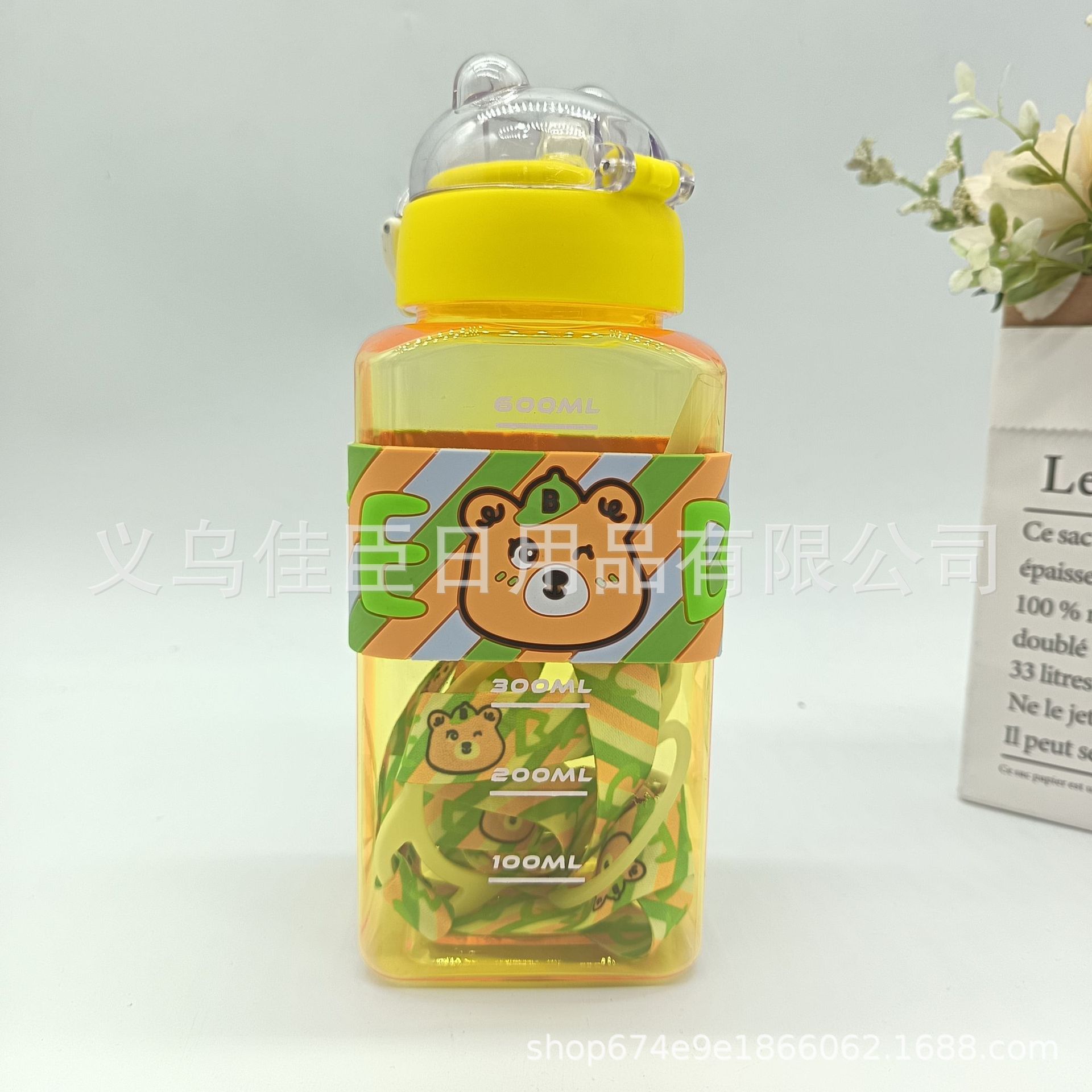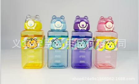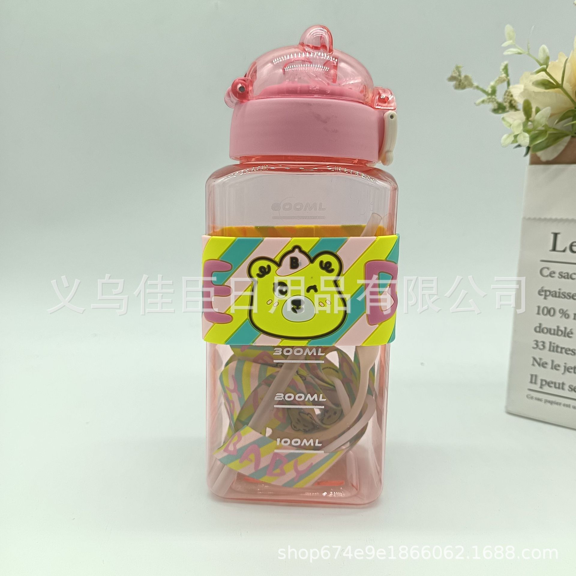 亚马逊夏季新款太空杯长方形小熊跳盖吸管杯儿童学生户外运动水杯