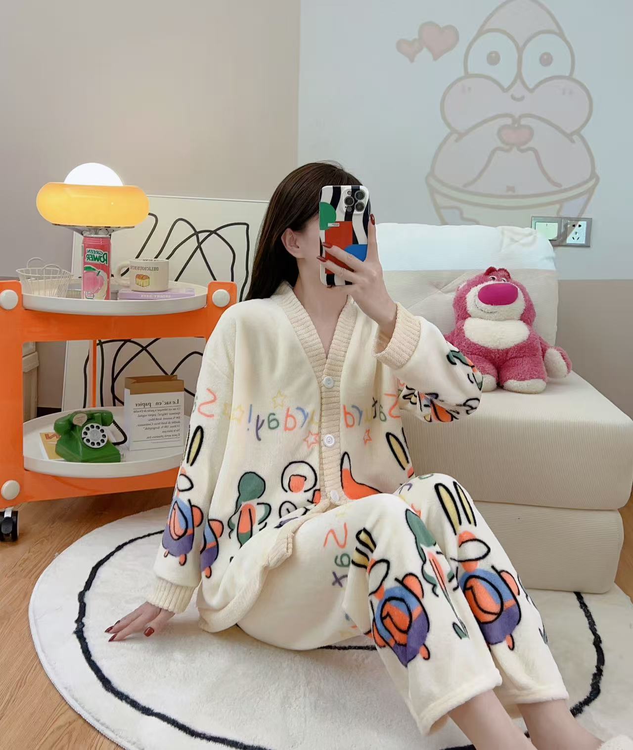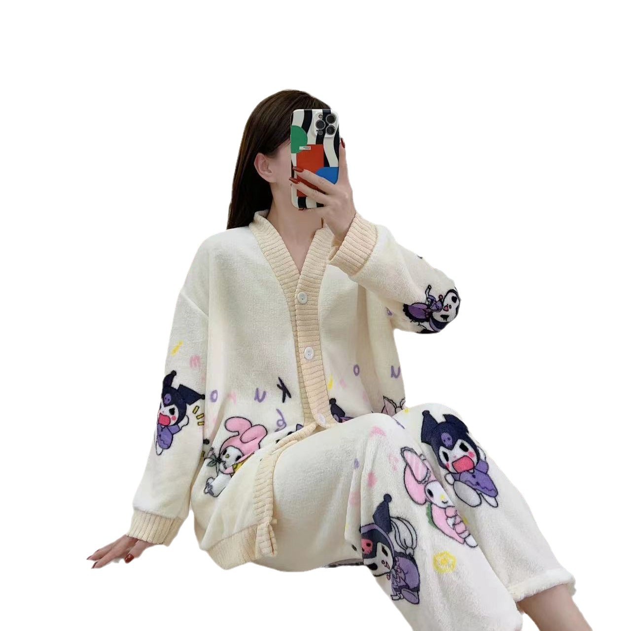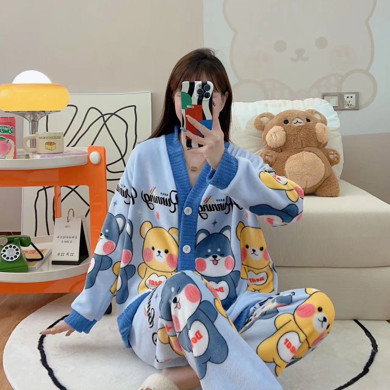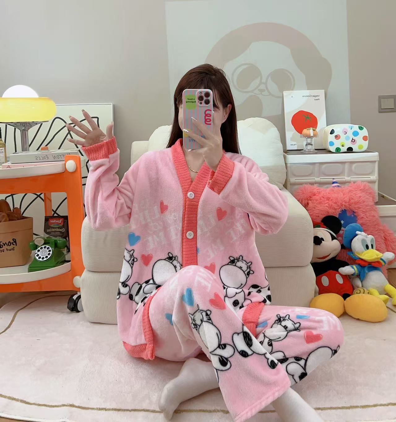 法兰绒睡衣女士v领开衫厚款外贸大码可爱保暖家居服套装