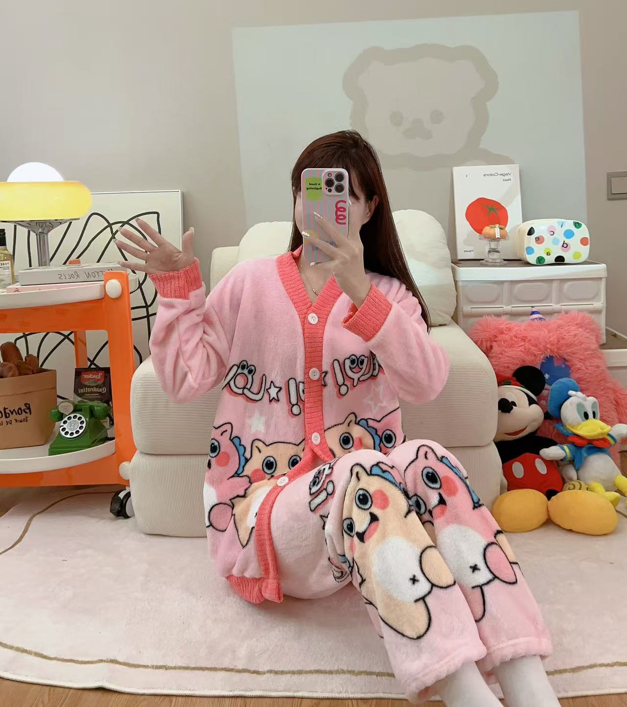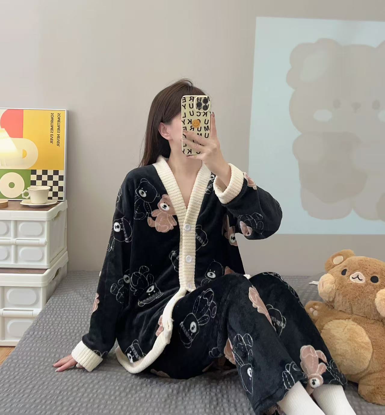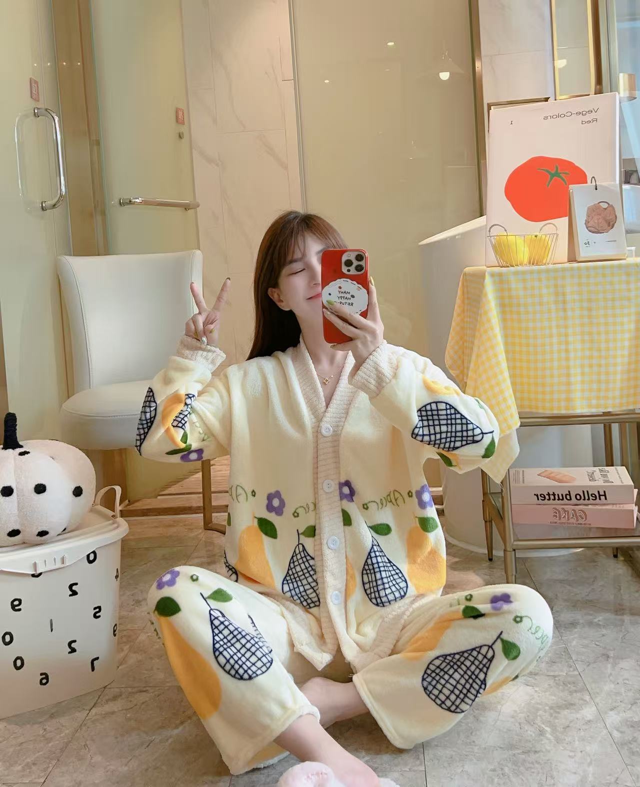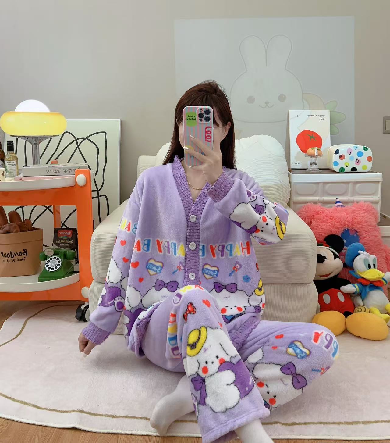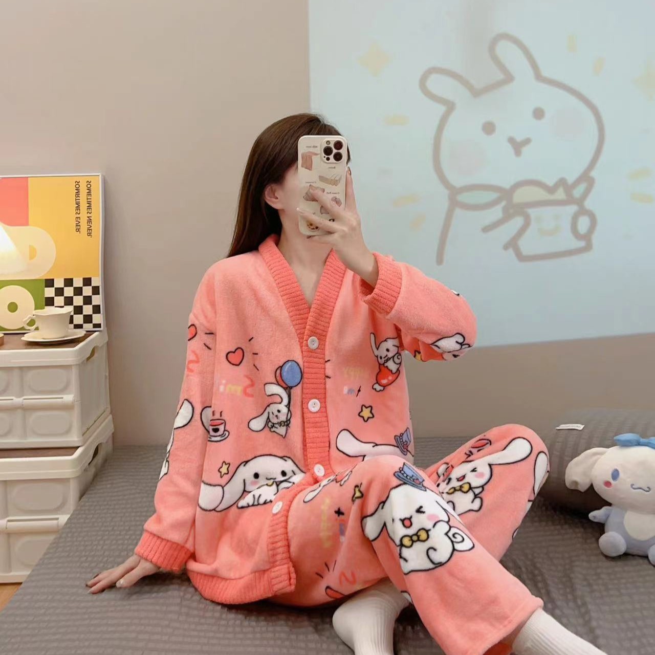 法兰绒睡衣女士v领开衫厚款外贸大码可爱保暖家居服套装