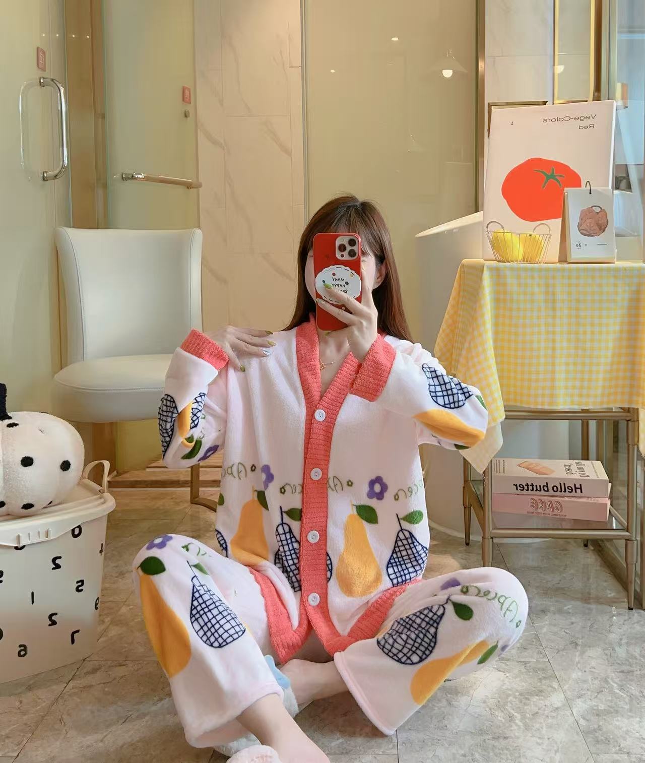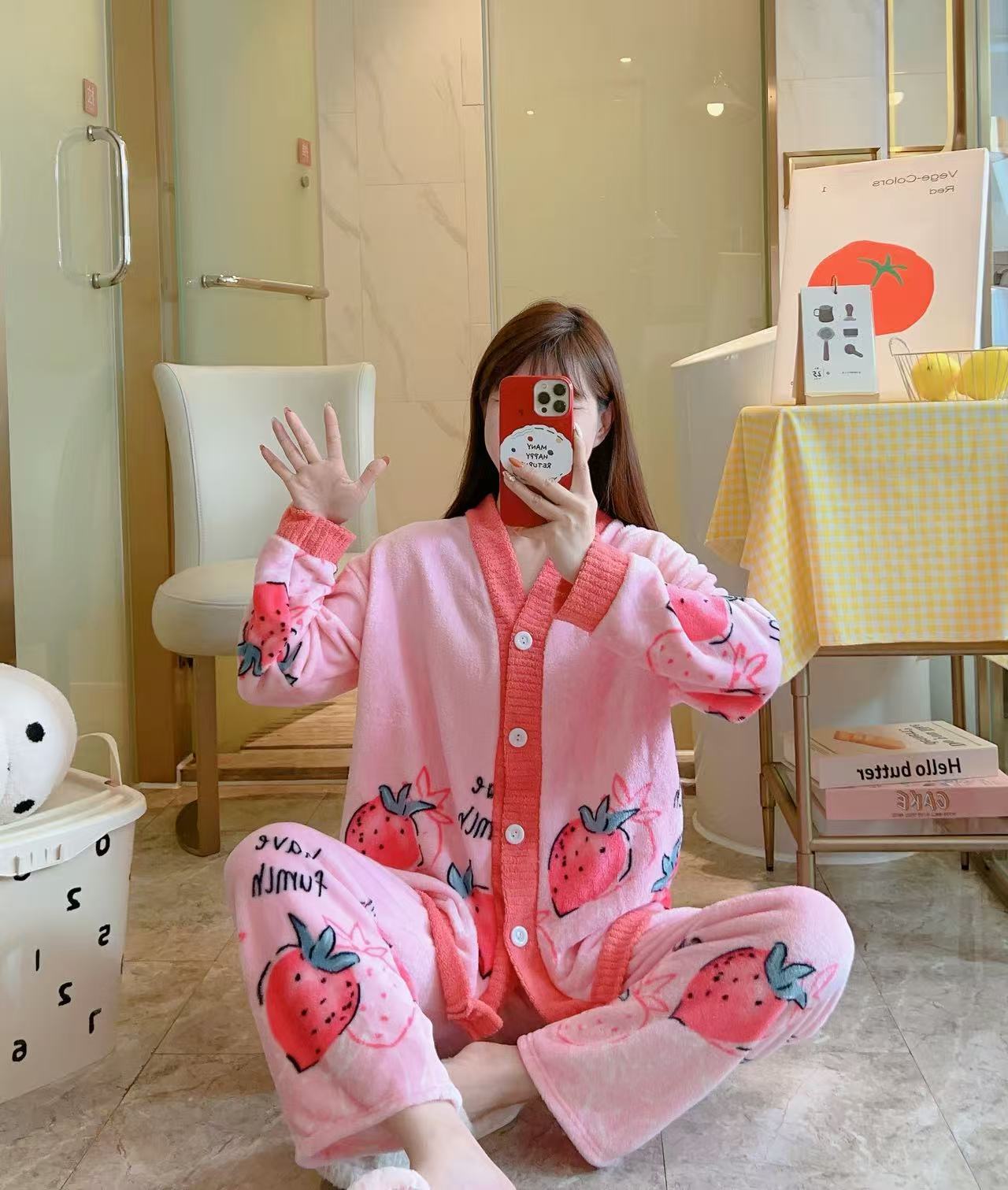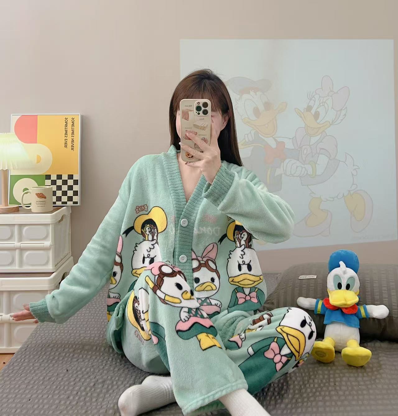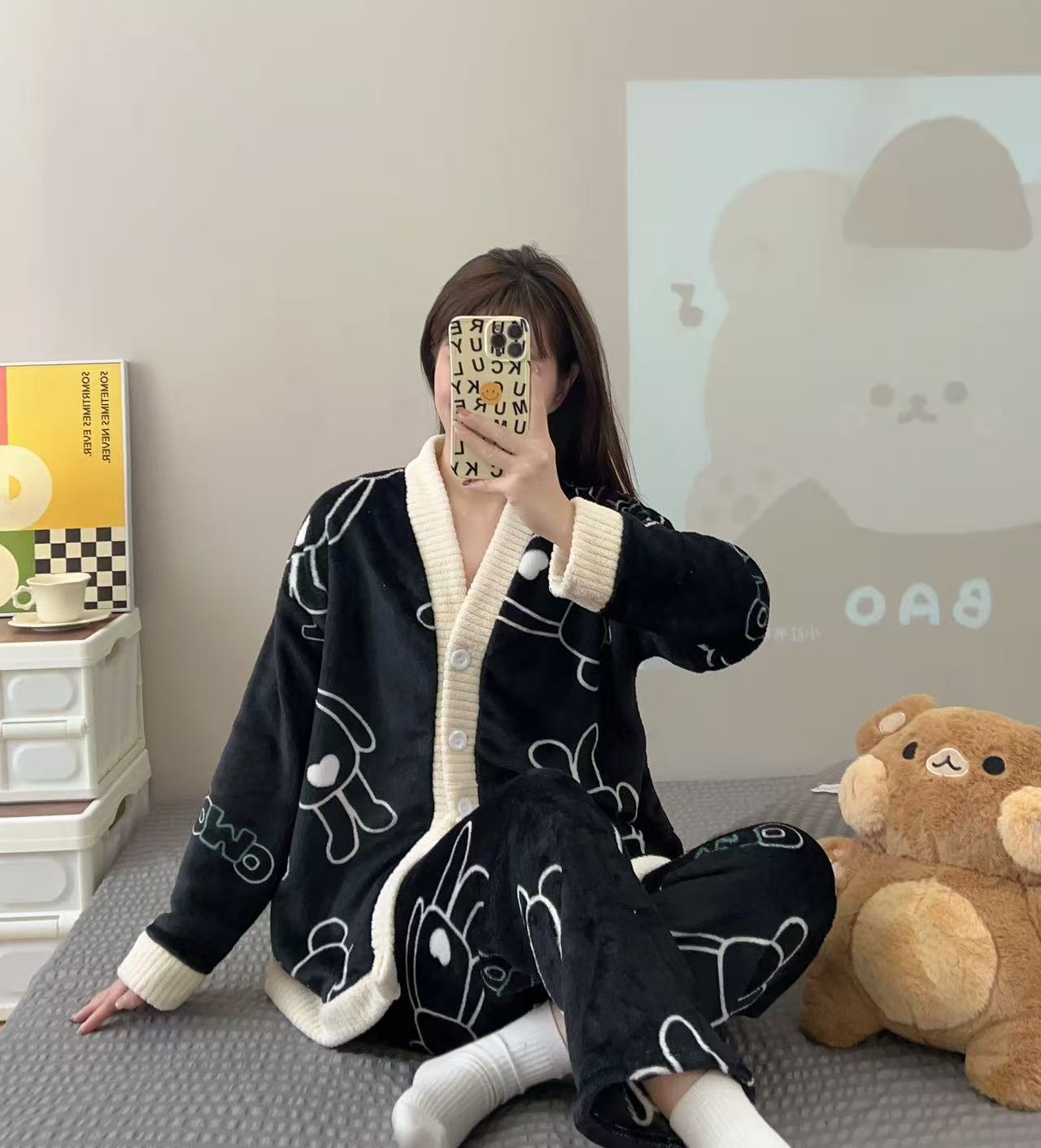 法兰绒睡衣女士v领开衫厚款外贸大码可爱保暖家居服套装